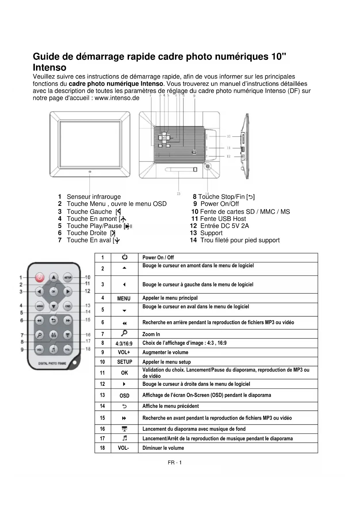 Le apparecchiature caratterizzate con questo simbolo sottostanno alla direttiva CEE/2002/96. Tutte le apparecchiature elettroniche ed elettriche usate devono essere smaltite separatamente dai rifiuti domestici pressi i punti di smaltimento previsti dallo stato. Smaltendo correttamente le apparecchiature elettroniche usate evita danni all‟ambiente.FR - 1 Guide de démarrage rapide cadre photo numériques 10" Intenso Veuillez suivre ces instructions de démarrage rapide, afin de vous informer sur les principales fonctions du cadre photo numérique Intenso. Vous trouverez un manuel d’instructions détaillées avec la description de toutes les paramètres de réglage du cadre photo numérique Intenso (DF) sur notre page d'accueil : www.intenso.de