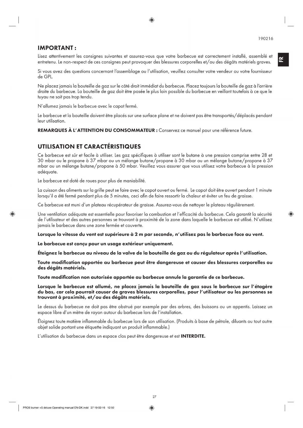 Ce barbecue est sûr et facile à utiliser. Les gaz spécifiques à utiliser sont le butane à une pression comprise entre 28 et 30 mbar ou le propane à 37 mbar ou un mélange butane/propane à 30 mbar ou un mélange butane/propane à 37 mbar ou un mélange butane/propane à 50 mbar. Veuillez vous assurer que vous utilisez votre barbecue à la pression adéquate. Le barbecue est doté de roues pour plus de maniabilité. La cuisson des aliments sur la grille peut se faire avec le capot ouvert ou fermé. Le capot doit être ouvert pendant 1 minute lorsqu’il a été fermé pendant plus de 5 minutes, ceci afin de faire ressortir la chaleur et éviter un feu de graisse. Ce barbecue est muni d’un plateau récupérateur de graisse. Assurez-vous de nettoyer le plateau régulièrement. Une ventilation adéquate est essentielle pour favoriser la combustion et l’efficacité du barbecue. Cela garantit la sécurité de l’utilisateur et des autres personnes se trouvant à proximité de la zone dans laquelle le barbecue est utilisé. N’utilisez jamais le barbecue dans une zone fermée et couverte. Lorsque la vitesse du vent est supérieure à 2 m par seconde, n’utilisez pas le barbecue face au vent. Le barbecue est conçu pour un usage extérieur uniquement. Éteignez le barbecue au niveau de la valve de la bouteille de gaz ou du régulateur après l’utilisation. Toute modification apportée au barbecue peut être dangereuse et causer des blessures corporelles ou des dégâts matériels. Toute modification non autorisée apportée au barbecue annule la garantie de ce barbecue. Lorsque le barbecue est allumé, ne placez jamais la bouteille de gaz sous le barbecue sur l’étagère du bas, car cela pourrait causer de graves blessures corporelles, pour l’utilisateur ou les personnes se trouvant à proximité, et/ou des dégâts matériels. Le dessus du barbecue ne doit pas être obstrué par exemple par des arbres, des buissons ou un appentis. Laissez un espace libre d’un mètre de rayon autour du barbecue lors de l’installation. Éloignez toute matière inflammable du barbecue lors de son utilisation. (Produits à base de pétrole, diluants ou tout autre objet solide portant une étiquette indiquant un produit inflammable.) L’utilisation du barbecue dans un espace clos peut être dangereuse et est INTERDITE.