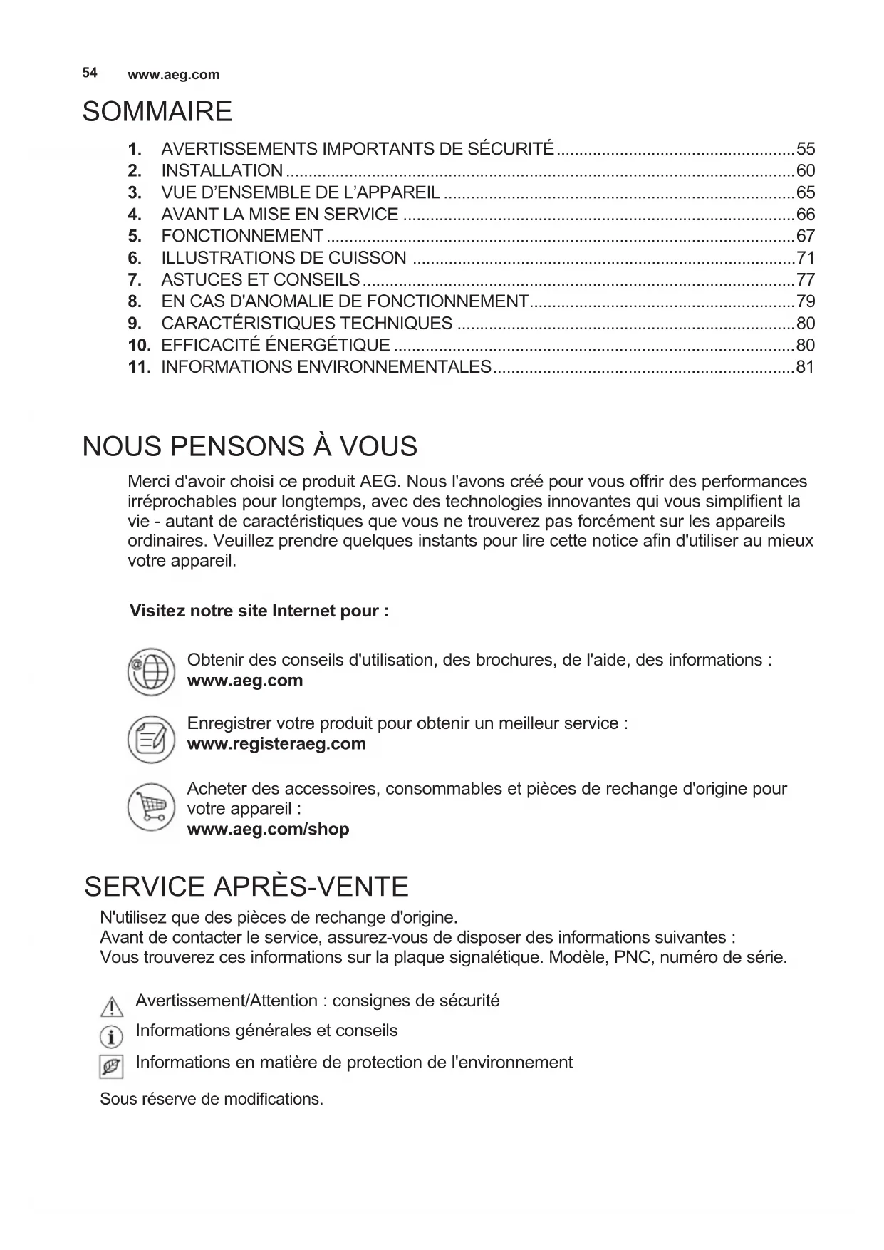 N'utilisez que des pièces de rechange d'origine. Avant de contacter le service, assurez-vous de disposer des informations suivantes : Vous trouverez ces informations sur la plaque signalétique. Modèle, PNC, numéro de série. Sous réserve de modications. Avertissement/Attention : consignes de sécurité Informations générales et conseils Informations en matière de protection de l'environnement Obtenir des conseils d'utilisation, des brochures, de l'aide, des informations : www.aeg.com Enregistrer votre produit pour obtenir un meilleur service : www.registeraeg.com Acheter des accessoires, consommables et pièces de rechange d'origine pour votre appareil : www.aeg.com/shop