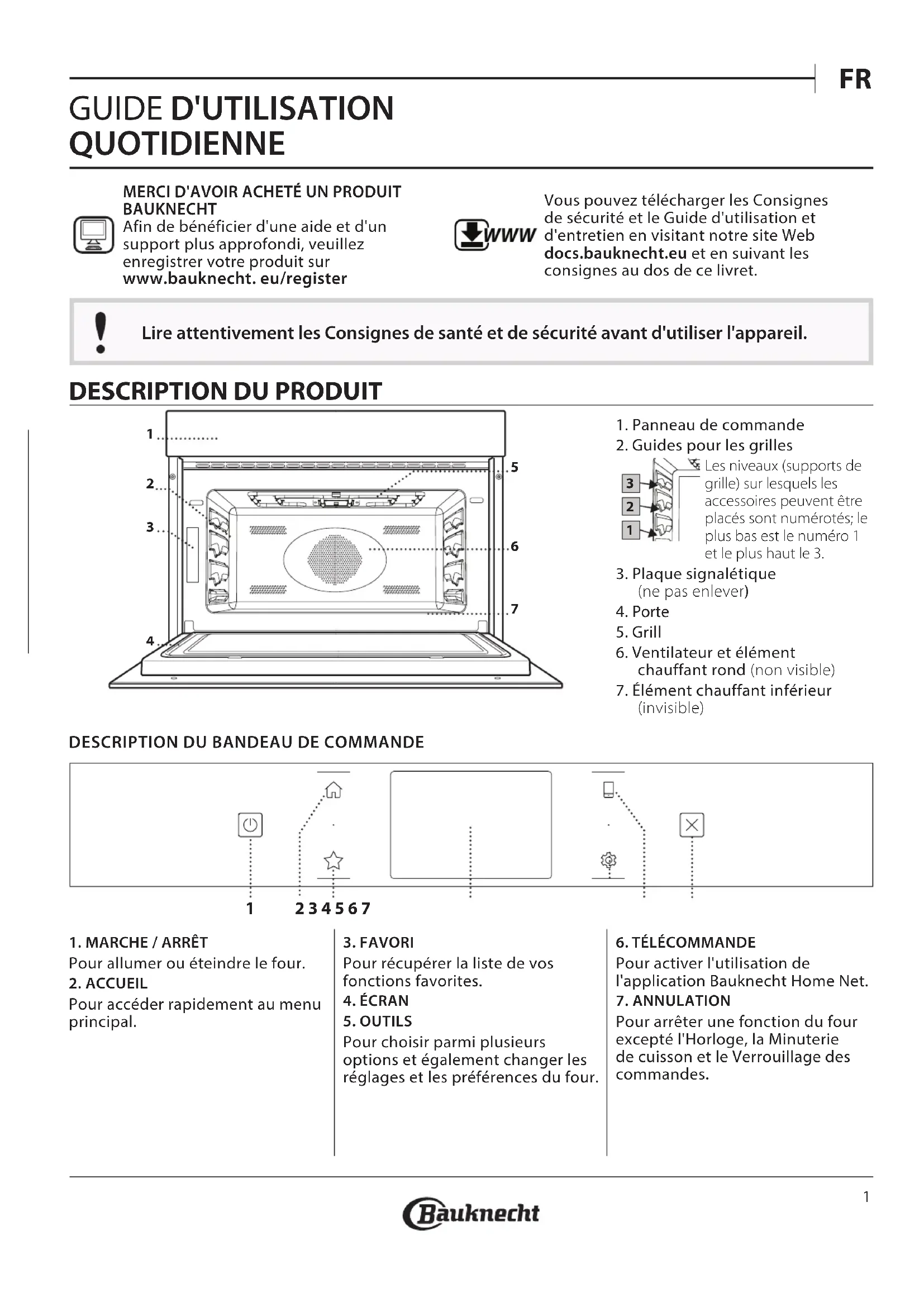 GUIDE D'UTILISATION QUOTIDIENNE MERCI D'AVOIR ACHETÉ UN PRODUIT BAUKNECHT Afin de bénéficier d'une aide et d'un support plus approfondi, veuillez enregistrer votre produit sur www.bauknecht. eu/register WWW Vous pouvez télécharger les Consignes de sécurité et le Guide d'utilisation et d'entretien en visitant notre site Web docs.bauknecht. eu et en suivant les consignes au dos de ce livret. Lire attentivement les Consignes de santé et de sécurité avant d'utiliser l'appareil.