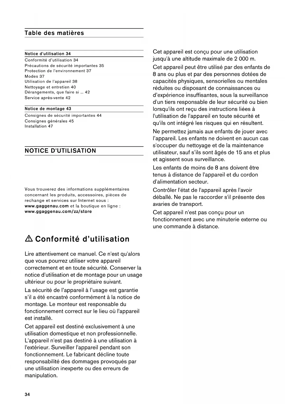 PP34 Table des matières [fr]Notice d’util i sation et de monta Notice d'utilisation 34 Conformité d’utilisation 34 Précautions de sécurité importantes 35 Protection de l'environnement 37 Modes 37 Utilisation de l'appareil 38 Nettoyage et entretien 40 Dérangements, que faire si … 42 Service après-vente 42 Notice de montage 43 Consignes de sécurité importantes 44 Consignes générales 45 Installation 47 NOTICE D'UTILISATION Vous trouverez des informations supplémentaires concernant les produits, accessoires, pièces de rechange et services sur Internet sous : www.gaggenau.com et la boutique en ligne : www.ggaggenau.com/zz/store m Conformité d’utilisation Lire attentivement ce manuel. Ce n'est qu'alors que vous pourrez utiliser votre appareil correctement et en toute sécurité. Conserver la notice d'utilisation et de montage pour un usage ultérieur ou pour le propriétaire suivant. La sécurité de l’appareil à l’usage est garantie s’il a été encastré conformément à la notice de montage. Le monteur est responsable du fonctionnement correct sur le lieu où l'appareil est installé. Cet appareil est destiné exclusivement à une utilisation domestique et non professionnelle. L'appareil n'est pas destiné à une utilisation à l'extérieur. Surveiller l'appareil pendant son fonctionnement. Le fabricant décline toute responsabilité des dommages provoqués par une utilisation inexperte ou des erreurs de manipulation. Cet appareil est conçu pour une utilisation jusqu'à une altitude maximale de 2 000 m. Cet appareil peut être utilisé par des enfants de 8 ans ou plus et par des personnes dotées de capacités physiques, sensorielles ou mentales réduites ou disposant de connaissances ou d’expérience insuffisantes, sous la surveillance d'un tiers responsable de leur sécurité ou bien lorsqu'ils ont reçu des instructions liées à l'utilisation de l'appareil en toute sécurité et qu'ils ont intégré les risques qui en résultent. Ne permettez jamais aux enfants de jouer avec l’appareil. Les enfants ne doivent en aucun cas s'occuper du nettoyage et de la maintenance utilisateur, sauf s’ils sont âgés de 15 ans et plus et agissent sous surveillance. Les enfants de moins de 8 ans doivent être tenus à distance de l'appareil et du cordon d'alimentation secteur. Contrôler l'état de l'appareil après l'avoir déballé. Ne pas le raccorder s'il présente des avaries de transport. Cet appareil n'est pas conçu pour un fonctionnement avec une minuterie externe ou une commande à distance.35 m Précautions de sécurité importantes Lire attentivement ce manuel. Ce n'est qu'alors que vous pourrez utiliser votre appareil correctement et en toute sécurité. Conserver la notice d'utilisation et de montage pour un usage ultérieur ou pour le propriétaire suivant. Risque d'asphyxie ! Le matériel d'emballage est dangereux pour les enfants. Ne permettez jamais aux enfants de jouer avec les matériaux d’emballage. Danger de mort ! Il y a risque d'intoxication par réaspiration des gaz de combustion. En cas d'utilisation simultanée de l'appareil en mode évacuation de l'air et d'un foyer à combustion alimenté en air ambiant, veillez impérativement à ce que l'apport d'air soit suffisant. Les foyers à combustion alimentés en air ambiant (par exemple appareils de chauffage, au gaz, au bois, au fioul ou au charbon, les chauffe-eau, chauffe-eau accumulateurs) prélèvent l'air de combustion dans la pièce où ils sont installés et rejettent les gaz de fumée à l'extérieur par le biais d'un système spécifique (cheminée par exemple). Lorsque la hotte aspirante est en marche, elle prélève de l'air dans la cuisine et dans les pièces voisines ; si l'apport d'air frais est trop faible, une dépression se forme. Des gaz toxiques provenant de la cheminée ou du conduit d'évacuation sont réaspirés dans les pièces d'habitation. ▯ Il faut donc toujours s'assurer que l'apport d'air frais est suffisant ▯ La présence d'une ventouse télescopique d'apport et d'évacuation d'air ne suffit pas à assurer le respect de la valeur limite. Le fonctionnement sûr de l'appareil n'est possible que si la dépression dans la pièce où est installé le foyer ne dépasse pas 4 Pa (0,04 mbar). On y parvient en présence d'ouvertures non obturables aménagées par ex. dans les portes, fenêtres et en association avec des ventouses télescopiques d'admission/évacuation de l'air à travers la maçonnerie ou par d'autres mesures techniques permettant à l'air d'affluer pour assurer la combustion. Demandez toujours conseil au maître ramoneur compétent qui pourra évaluer l'ensemble du réseau de ventilation de la maison et vous proposer le moyen le mieux adapté pour l'aération. Si la hotte aspirante est utilisée exclusivement en mode recyclage, le fonctionnement est possible sans restrictions. Risque d'incendie ! ▯ Les dépôts de graisse dans le filtre à graisse peuvent s'enflammer. Nettoyer le filtre à graisse au moins tous les 2 mois. Ne jamais faire fonctionner l'appareil sans filtre à graisse. Risque d'incendie ! ▯ Les dépôts de graisse dans le filtre à graisse peuvent s'enflammer. Ne jamais travailler avec une flamme nue à proximité de l'appareil (par ex. flamber). N’installer l’appareil à proximité d’un foyer à combustibles solides (par ex. bois ou charbon) qu’en présence d’un couvercle fermé et non amovible. Aucune projection d’étincelles ne doit avoir lieu. Risque d'incendie ! ▯ L'huile et la graisse chaude s'enflamme rapidement. Ne jamais laisser l'huile et la graisse chaude sans surveillance. Ne jamais éteindre le feu avec de l'eau. Eteindre le foyer. Etouffer les flammes prudemment avec un couvercle, une couverture ou similaire.36 Risque d'incendie ! ▯ Des foyers à gaz sans qu'un récipient ne soit placé sur le foyer dégagent une forte chaleur lors du fonctionnement. Un appareil de ventilation monté au-dessus peut êtr