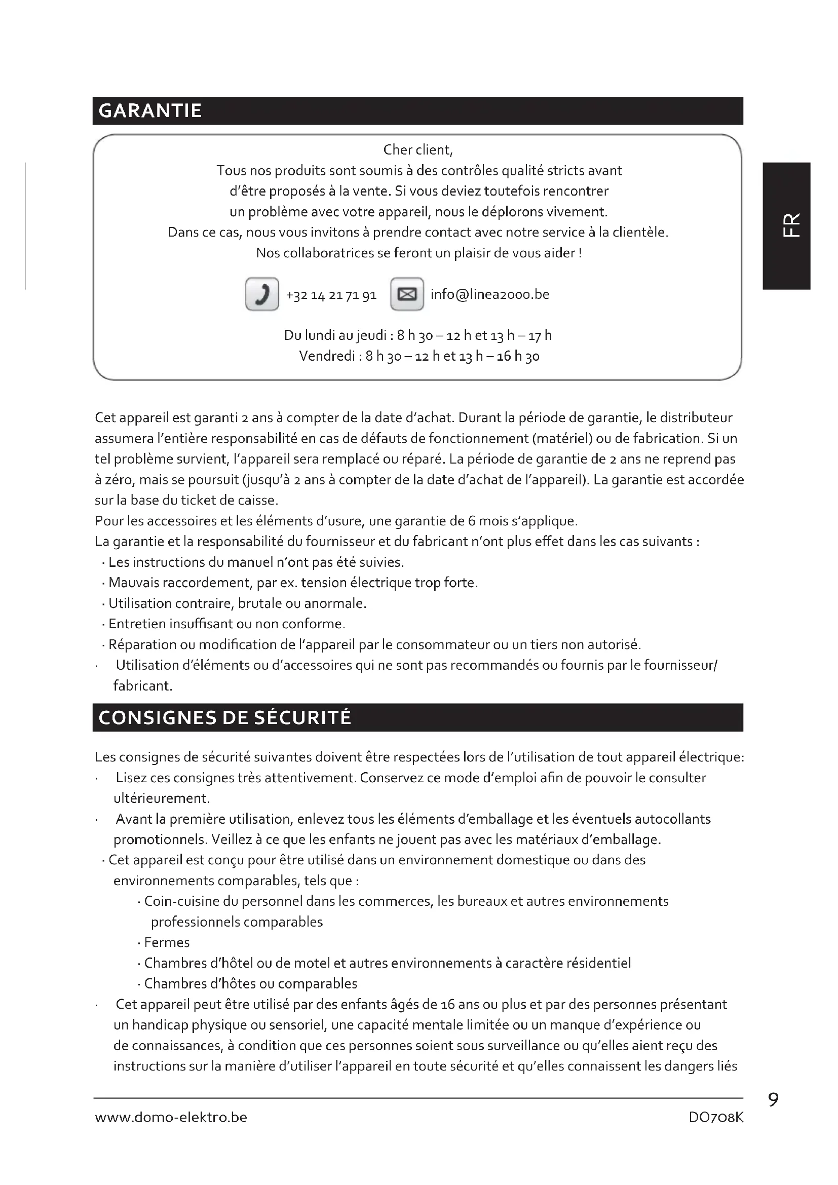 GARANTIE Cher client, Tous nos produits sont soumis à des contrôles qualité stricts avant d’être proposés à la vente. Si vous deviez toutefois rencontrer un problème avec votre appareil, nous le déplorons vivement. Dans ce cas, nous vous invitons à prendre contact avec notre service à la clientèle. Nos collaboratrices se feront un plaisir de vous aider ! +32 14 21 71 91 info@linea2000.be Du lundi au jeudi : 8 h 30 – 12 h et 13 h – 17 h Vendredi : 8 h 30 – 12 h et 13 h – 16 h 30 Cet appareil est garanti 2 ans à compter de la date d’achat. Durant la période de garantie, le distributeur assumera l’entière responsabilité en cas de défauts de fonctionnement (matériel) ou de fabrication. Si un tel problème survient, l’appareil sera remplacé ou réparé. La période de garantie de 2 ans ne reprend pas à zéro, mais se poursuit (jusqu’à 2 ans à compter de la date d’achat de l’appareil). La garantie est accordée sur la base du ticket de caisse. Pour les accessoires et les éléments d’usure, une garantie de 6 mois s’applique. La garantie et la responsabilité du fournisseur et du fabricant n’ont plus eet dans les cas suivants :