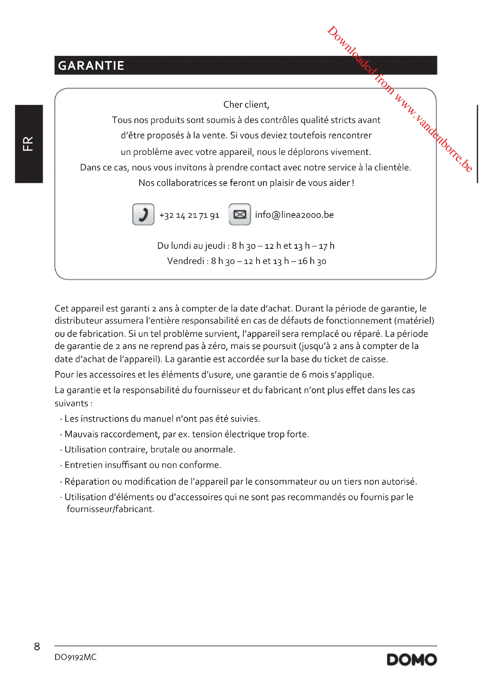 N'utilisez jamais l'appareil lorsque le cordon d'alimentation ou la fiche est endommagé(e), après un mauvais fonctionnement de l'appareil ou lorsque l'appareil est lui-même endommagé. Portez dans ce cas l'appareil au service après vente de DOMO ou au centre de services qualifié le plus proche, pour contrôle, réparation ou modifications électriques/ mécaniques. Ne tentez jamais de réparer cet apparéil vous-même.