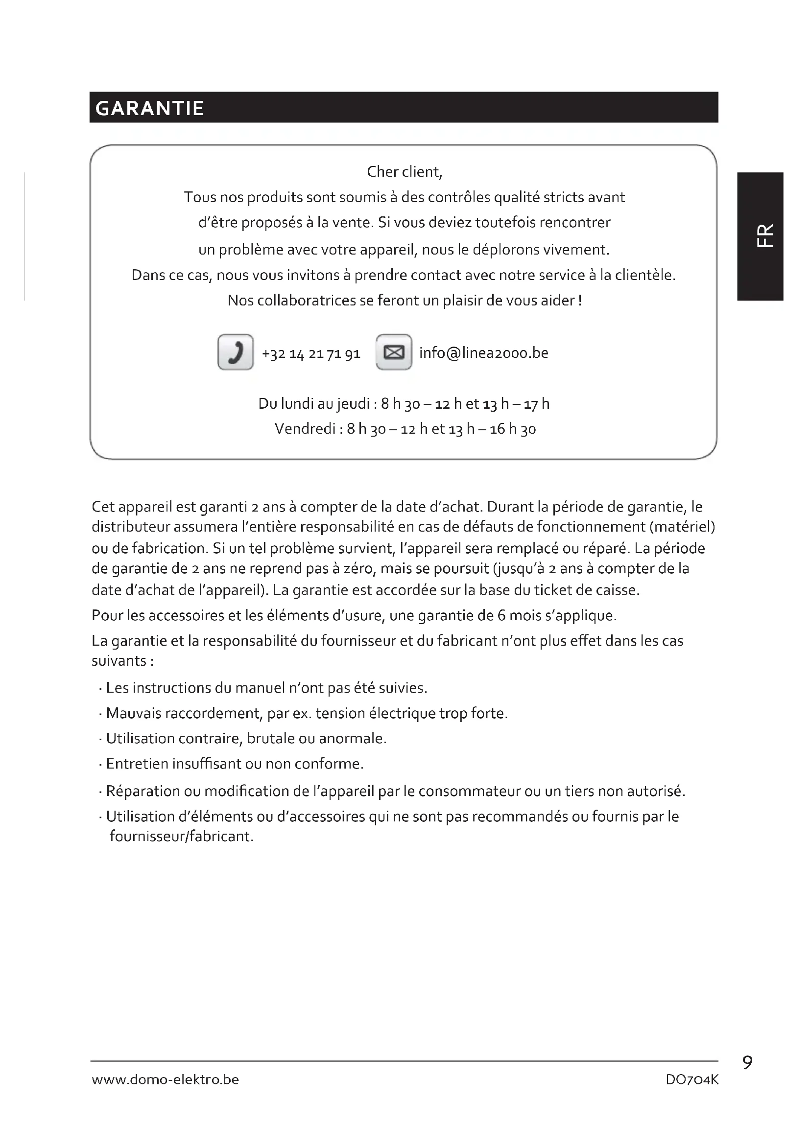 GARANTIE Cher client, Tous nos produits sont soumis à des contrôles qualité stricts avant d’être proposés à la vente. Si vous deviez toutefois rencontrer un problème avec votre appareil, nous le déplorons vivement. Dans ce cas, nous vous invitons à prendre contact avec notre service à la clientèle. Nos collaboratrices se feront un plaisir de vous aider ! +32 14 21 71 91 info@linea2000.be Du lundi au jeudi : 8 h 30 – 12 h et 13 h – 17 h Vendredi : 8 h 30 – 12 h et 13 h – 16 h 30 Cet appareil est garanti 2 ans à compter de la date d’achat. Durant la période de garantie, le distributeur assumera l’entière responsabilité en cas de défauts de fonctionnement (matériel) ou de fabrication. Si un tel problème survient, l’appareil sera remplacé ou réparé. La période de garantie de 2 ans ne reprend pas à zéro, mais se poursuit (jusqu’à 2 ans à compter de la date d’achat de l’appareil). La garantie est accordée sur la base du ticket de caisse. Pour les accessoires et les éléments d’usure, une garantie de 6 mois s’applique. La garantie et la responsabilité du fournisseur et du fabricant n’ont plus eet dans les cas suivants :