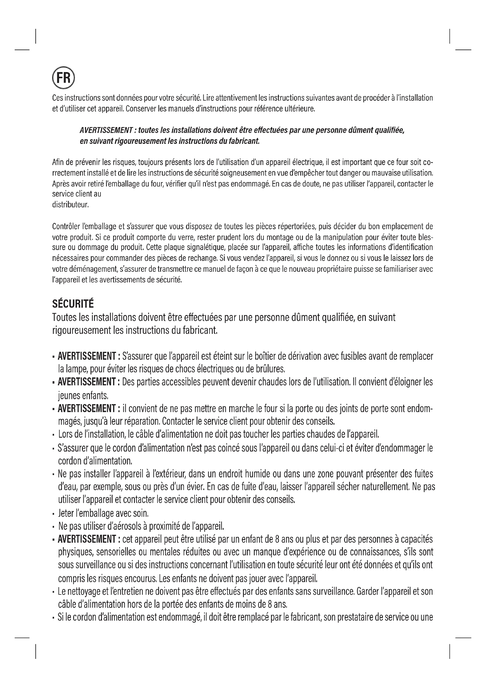 Afin de prévenir les risques, toujours présents lors de l'utilisation d'un appareil électrique, il est important que ce four soit correctement installé et que les instructions de sécurité soient suivies soigneusement en vue d'empêcher tout danger ou mauvaise utilisation. Après avoir retiré l'emballage du four, vérifier qu'il n'est pas endommagé. En cas de doute, ne pas utiliser l'appareil, contacter le service client au distributeur.