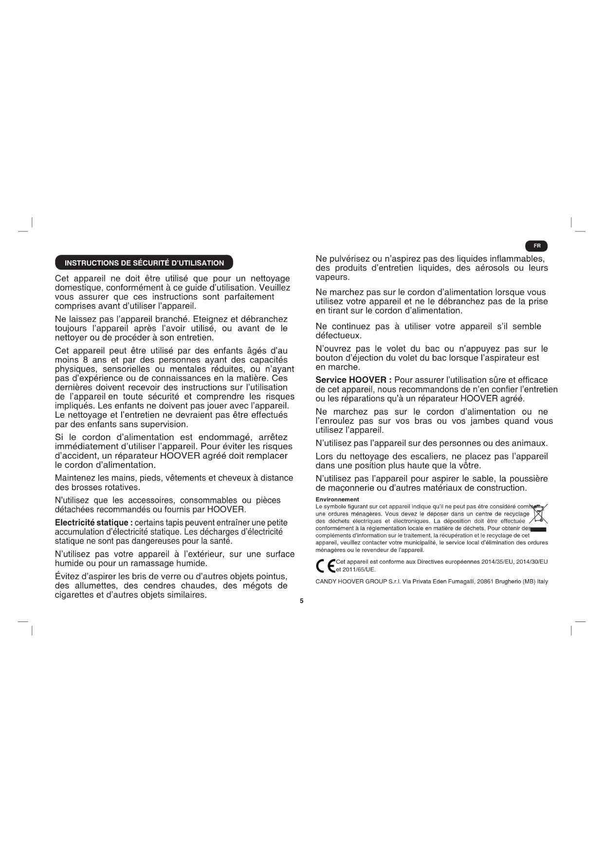 Cet appareil ne doit être utilisé que pour un nettoyage domestique, conformément à ce guide d’utilisation. Veuillez vous assurer que ces instructions sont parfaitement comprises avant d’utiliser l’appareil. Ne laissez pas l’appareil branché. Eteignez et débranchez toujours l’appareil après l’avoir utilisé, ou avant de le nettoyer ou de procéder à son entretien. Cet appareil peut être utilisé par des enfants âgés d’au moins 8 ans et par des personnes ayant des capacités physiques, sensorielles ou mentales réduites, ou n’ayant pas d’expérience ou de connaissances en la matière. Ces dernières doivent recevoir des instructions sur l’utilisation de l’appareil en toute sécurité et comprendre les risques impliqués. Les enfants ne doivent pas jouer avec l’appareil. Le nettoyage et l’entretien ne devraient pas être effectués par des enfants sans supervision. Si le cordon d’alimentation est endommagé, arrêtez immédiatement d’utiliser l’appareil. Pour éviter les risques d’accident, un réparateur HOOVER agréé doit remplacer le cordon d’alimentation. Maintenez les mains, pieds, vêtements et cheveux à distance des brosses rotatives. N’utilisez que les accessoires, consommables ou pièces détachées recommandés ou fournis par HOOVER. Electricité statique : certains tapis peuvent entraîner une petite accumulation d’électricité statique. Les décharges d’électricité statique ne sont pas dangereuses pour la santé. N’utilisez pas votre appareil à l’extérieur, sur une surface humide ou pour un ramassage humide. Évitez d’aspirer les bris de verre ou d’autres objets pointus, des allumettes, des cendres chaudes, des mégots de cigarettes et d’autres objets similaires. Ne pulvérisez ou n’aspirez pas des liquides inammables, des produits d’entretien liquides, des aérosols ou leurs vapeurs. Ne marchez pas sur le cordon d’alimentation lorsque vous utilisez votre appareil et ne le débranchez pas de la prise en tirant sur le cordon d’alimentation. Ne continuez pas à utiliser votre appareil s’il semble défectueux. N’ouvrez pas le volet du bac ou n’appuyez pas sur le bouton d’éjection du volet du bac lorsque l’aspirateur est en marche. Service HOOVER : Pour assurer l’utilisation sûre et efcace de cet appareil, nous recommandons de n’en coner l’entretien ou les réparations qu’à un réparateur HOOVER agréé. Ne marchez pas sur le cordon d’alimentation ou ne l’enroulez pas sur vos bras ou vos jambes quand vous utilisez l’appareil. N’utilisez pas l’appareil sur des personnes ou des animaux. Lors du nettoyage des escaliers, ne placez pas l’appareil dans une position plus haute que la vôtre. N’utilisez pas l’appareil pour aspirer le sable, la poussière de maçonnerie ou d’autres matériaux de construction. Environnement Le symbole gurant sur cet appareil indique qu’il ne peut pas être considéré comme une ordures ménagères. Vous devez le déposer dans un centre de recyclage des déchets électriques et électroniques. La déposition doit être effectuée conformément à la réglementation locale en matière de déchets. Pour obtenir des compléments d’information sur le traitement, la récupération et le recyclage de cet appareil, veuillez contacter votre municipalité, le service local d’élimination des ordures ménagères ou le revendeur de l’appareil. Cet appareil est conforme aux Directives européennes 2014/35/EU, 2014/30/EU et 2011/65/UE. CANDY HOOVER GROUP S.r.l. Via Privata Eden Fumagalli, 20861 Brugherio (MB) Italy FR6 A. Bouton marche/arrêt B. Couvercle du ltre pré-moteur C. Poignée du bac D. Corps intérieur du bac E. Bouton d’éjection du volet du bac F. Indicateur mécanique de bac plein G. Bouton de verrouillage d’extrémité du tuyau H. Flexible