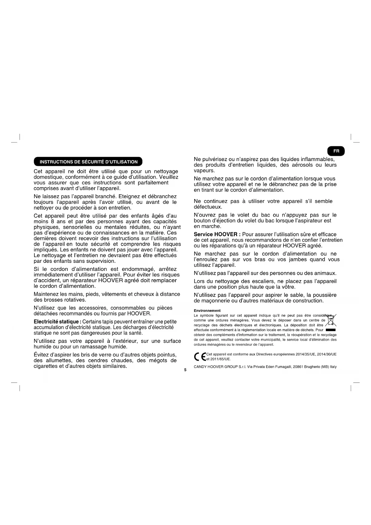Cet appareil ne doit être utilisé que pour un nettoyage domestique, conformément à ce guide d’utilisation. Veuillez vous assurer que ces instructions sont parfaitement comprises avant d’utiliser l’appareil. Ne laissez pas l’appareil branché. Eteignez et débranchez toujours l’appareil après l’avoir utilisé, ou avant de le nettoyer ou de procéder à son entretien. Cet appareil peut être utilisé par des enfants âgés d’au moins 8 ans et par des personnes ayant des capacités physiques, sensorielles ou mentales réduites, ou n’ayant pas d’expérience ou de connaissances en la matière. Ces dernières doivent recevoir des instructions sur l’utilisation de l’appareil en toute sécurité et comprendre les risques impliqués. Les enfants ne doivent pas jouer avec l’appareil. Le nettoyage et l’entretien ne devraient pas être effectués par des enfants sans supervision. Si le cordon d’alimentation est endommagé, arrêtez immédiatement d’utiliser l’appareil. Pour éviter les risques d’accident, un réparateur HOOVER agréé doit remplacer le cordon d’alimentation. Maintenez les mains, pieds, vêtements et cheveux à distance des brosses rotatives. N’utilisez que les accessoires, consommables ou pièces détachées recommandés ou fournis par HOOVER. Electricité statique : Certains tapis peuvent entraîner une petite accumulation d’électricité statique. Les décharges d’électricité statique ne sont pas dangereuses pour la santé. N’utilisez pas votre appareil à l’extérieur, sur une surface humide ou pour un ramassage humide. Évitez d’aspirer les bris de verre ou d’autres objets pointus, des allumettes, des cendres chaudes, des mégots de cigarettes et d’autres objets similaires. Ne pulvérisez ou n’aspirez pas des liquides inammables, des produits d’entretien liquides, des aérosols ou leurs vapeurs. Ne marchez pas sur le cordon d’alimentation lorsque vous utilisez votre appareil et ne le débranchez pas de la prise en tirant sur le cordon d’alimentation. Ne continuez pas à utiliser votre appareil s’il semble défectueux. N’ouvrez pas le volet du bac ou n’appuyez pas sur le bouton d’éjection du volet du bac lorsque l’aspirateur est en marche. Service HOOVER : Pour assurer l’utilisation sûre et efcace de cet appareil, nous recommandons de n’en coner l’entretien ou les réparations qu’à un réparateur HOOVER agréé. Ne marchez pas sur le cordon d’alimentation ou ne l’enroulez pas sur vos bras ou vos jambes quand vous utilisez l’appareil. N’utilisez pas l’appareil sur des personnes ou des animaux. Lors du nettoyage des escaliers, ne placez pas l’appareil dans une position plus haute que la vôtre. N’utilisez pas l’appareil pour aspirer le sable, la poussière de maçonnerie ou d’autres matériaux de construction. Environnement Le symbole gurant sur cet appareil indique qu’il ne peut pas être considéré comme une ordures ménagères. Vous devez le déposer dans un centre de recyclage des déchets électriques et électroniques. La déposition doit être effectuée conformément à la réglementation locale en matière de déchets. Pour obtenir des compléments d’information sur le traitement, la récupération et le recyclage de cet appareil, veuillez contacter votre municipalité, le service local d’élimination des ordures ménagères ou le revendeur de l’appareil. Cet appareil est conforme aux Directives européennes 2014/35/UE, 2014/30/UE et 2011/65/UE. CANDY HOOVER GROUP S.r.l. Via Privata Eden Fumagalli, 20861 Brugherio (MB) Italy FR6 *Sur certains modèles uniquement **Peut varier selon le modèle A. Volet du bac à poussière B. Bac à poussière C. Corps de l’aspirateur D. Variateur de puissance** D1. Afchage LED avec touches de contrôle** E. Bouton marche/arrêt F. Couvercle du ltre pré-moteur G. Poignée du bac H. Bouton d’éjection du volet du bac