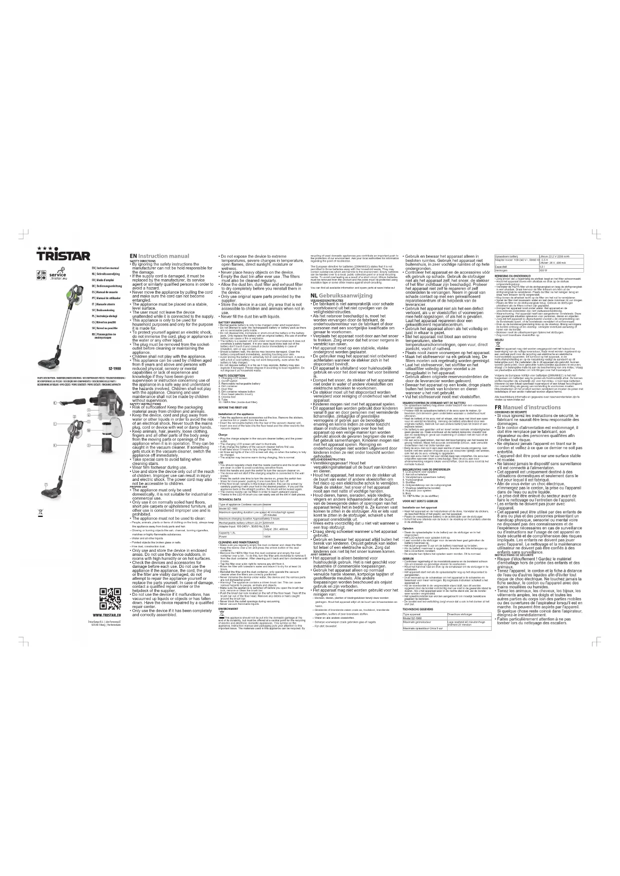 - N’aspirez jamais de liquides inflammables. ENVIRONNEMENT Cet appareil ne doit pas être jeté dans les ordures ménagères à la fin de sa vie, mais doit être remis à un endroit centralisé de recyclage des appareils électriques et électroniques. Le symbole sur l'appareil, le mode d’emploi et l'emballage, attire votre attention sur ce point important. Les matériaux utilisés dans cet appareil peuvent être recyclés. En recyclant les appareils domestiques, vous contribuez de façon importante à la protection de notre environnement. Consultez les autorités locales pour obtenir des informations concernant le point de collecte La Directive européenne relative aux piles (2006/66/CE) stipule qu'il est interdit de jeter les piles avec les ordures ménagères. Elles peuvent contenir des substances nocives pour l'environnement. Les piles vides peuvent être remises à un point de collecte public local ou à un centre de recyclage local. Pour éviter une surchauffe due à un court-circuit, les piles au lithium doivent être retirées du produit et les pôles doivent être protégés contre les courts-circuits par un ruban isolant ou tout autre moyen. Vous trouverez toutes les informations disponibles et les pièces de rechange sur www.tristar.eu! DEBedienungsanleitung SICHERHEITSANWEISUNGEN
