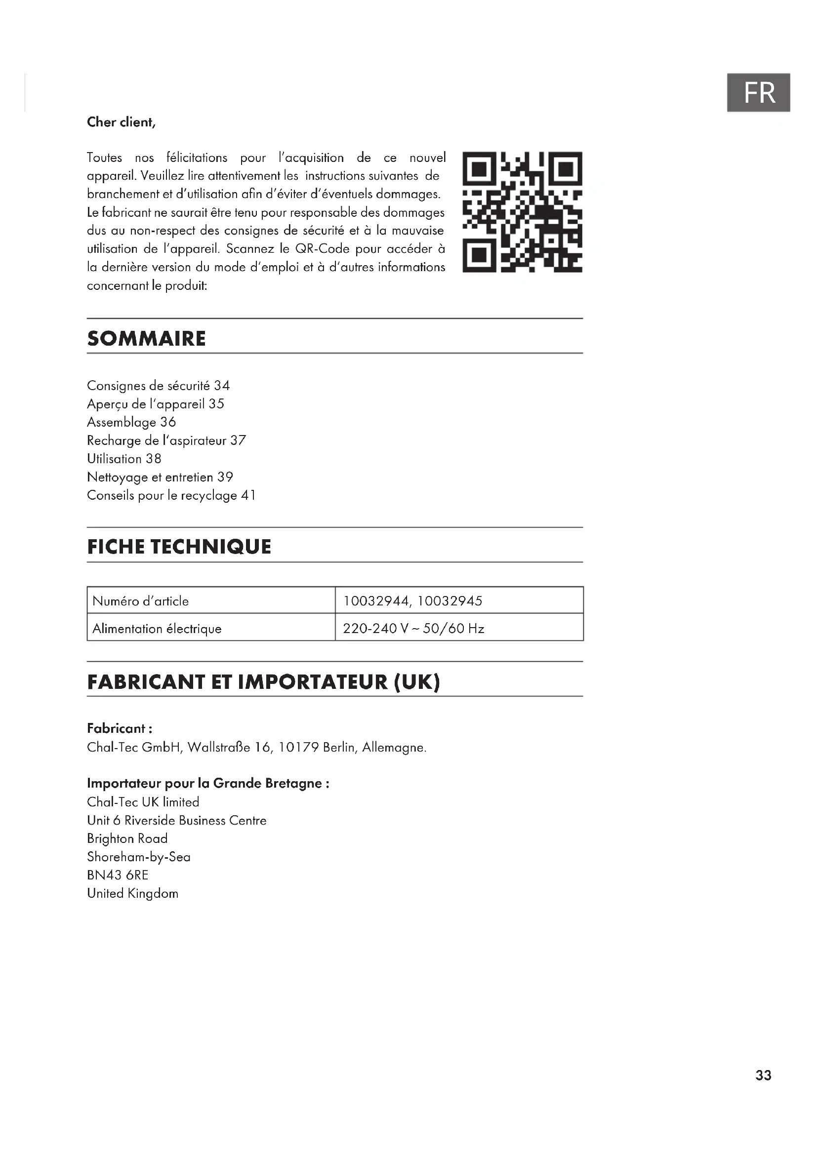 Cher client, Toutes nos félicitations pour l’acquisition de ce nouvel appareil. Veuillez lire attentivement les instructions suivantes de branchement et d’utilisation an d’éviter d’éventuels dommages. Le fabricant ne saurait être tenu pour responsable des dommages dus au non-respect des consignes de sécurité et à la mauvaise utilisation de l’appareil. Scannez le QR-Code pour accéder à la dernière version du mode d‘emploi et à d‘autres informations concernant le produit: SOMMAIRE Consignes de sécurité34 Aperçu de l‘appareil35 Assemblage36 Recharge de l‘aspirateur37 Utilisation38 Nettoyage et entretien39 Conseils pour le recyclage41 FICHE TECHNIQUE Numéro d’article 10032944, 10032945 Alimentation électrique 220-240 V ~ 50/60 Hz FABRICANT ET IMPORTATEUR (UK) Fabricant : Chal-Tec GmbH, Wallstraße 16, 10179 Berlin, Allemagne. Importateur pour la Grande Bretagne : Chal-Tec UK limited Unit 6 Riverside Business Centre Brighton Road Shoreham-by-Sea BN43 6RE United Kingdom34