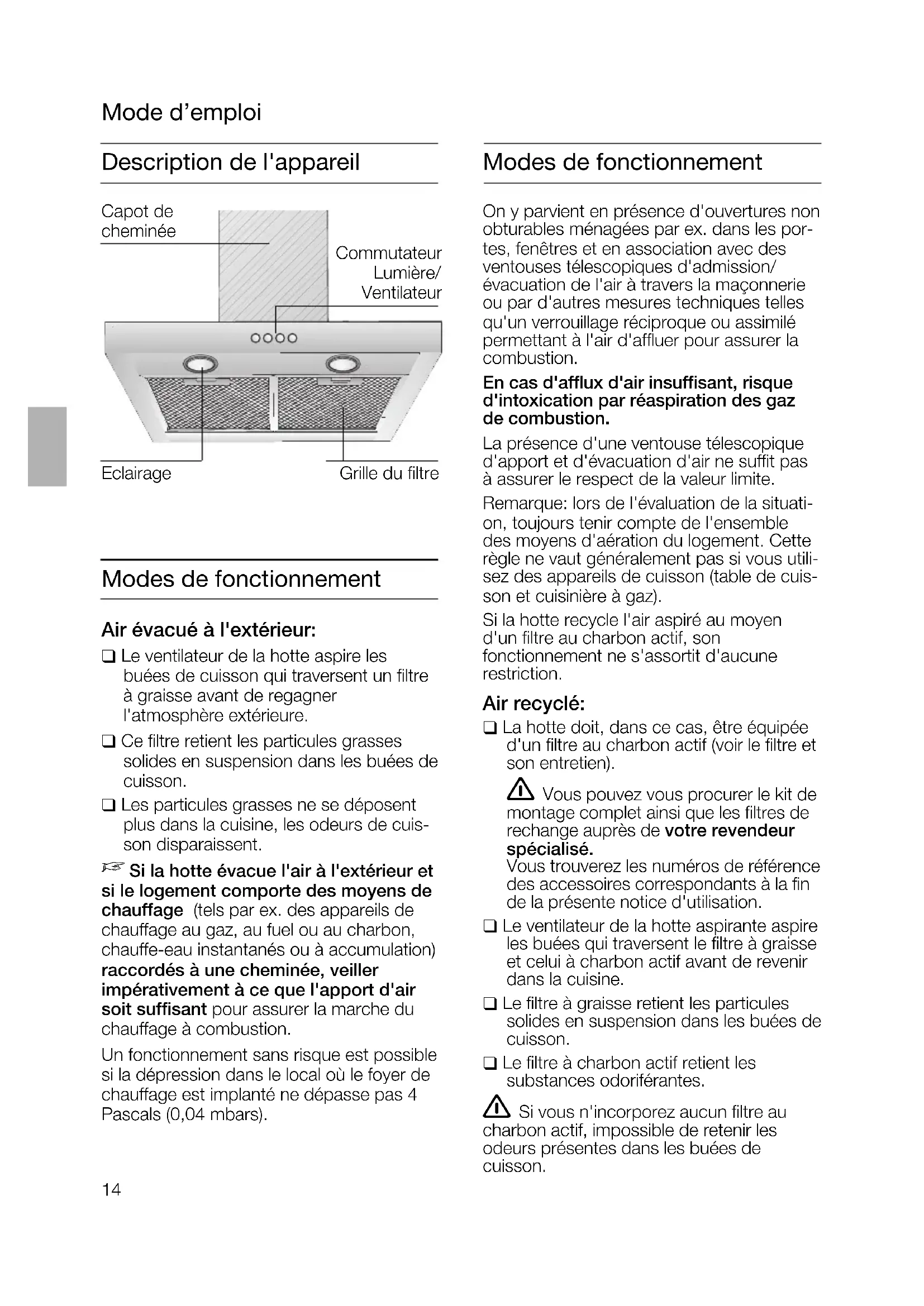 Gebrauchsanleitung).14 Description de l'appareil Modes de fonctionnement Air évacué à l'extérieur: ❑ Le ventilateur de la hotte aspire les buées de cuisson qui traversent un filtre à graisse avant de regagner l'atmosphère extérieure. ❑ Ce filtre retient les particules grasses solides en suspension dans les buées de cuisson. ❑ Les particules grasses ne se déposent plus dans la cuisine, les odeurs de cuis- son disparaissent.