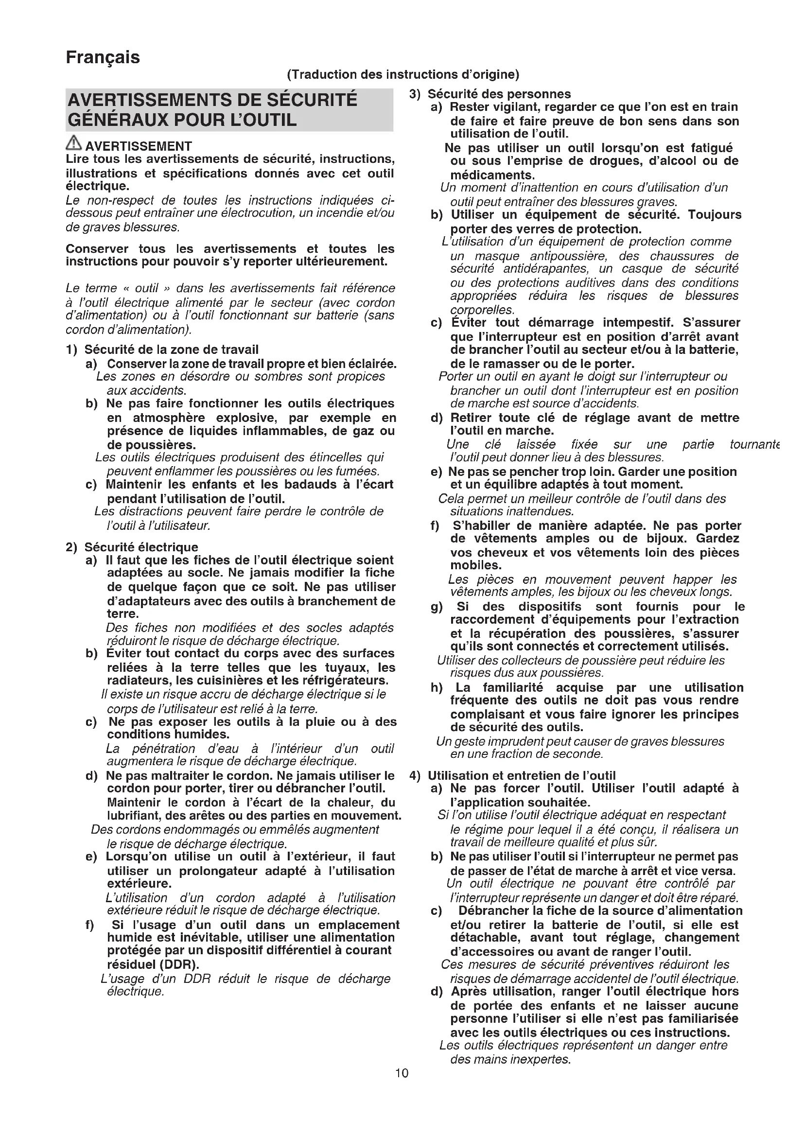Le terme « outil » dans les avertissements fait référence à l'outil électrique alimenté par le secteur (avec cordon d'alimentation) ou à l'outil fonctionnant sur batterie (sans cordon d'alimentation).