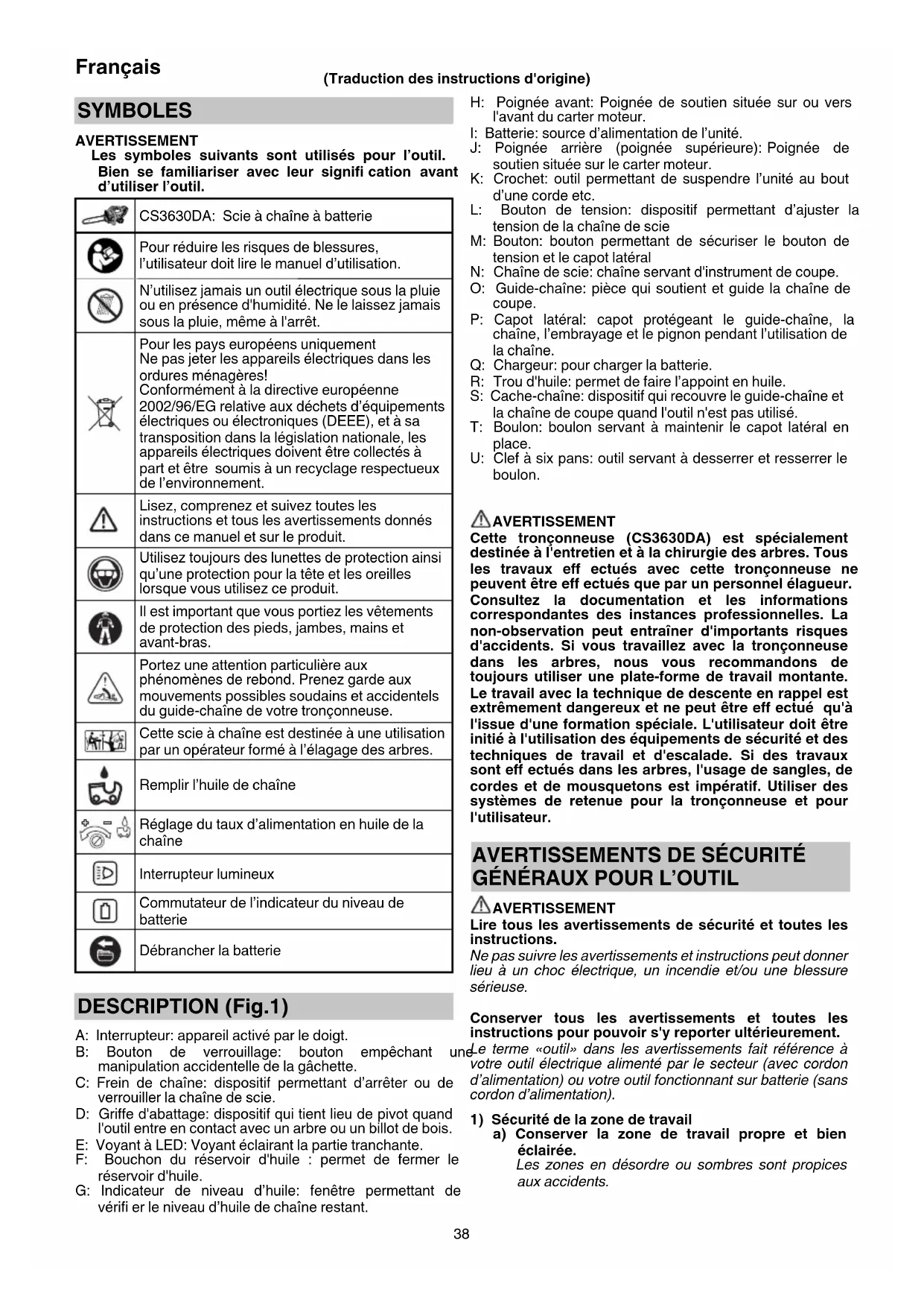 Symptom Mögliche Ursache Abhilfe Die Ladeanzeigelampe fl ackert schnell lila und der Ladevorgang beginnt nicht. Der Akku wurde nicht vollständig eingelegt. Setzen Sie den Akku fest ein. Es befi nden sich Fremdkörper an den Batteriepolen oder dort, wo der Akku eingesetzt wurde. Entfernen Sie die Fremdkörper. Die Ladeanzeigelampe blinkt rot und der Ladevorgang beginnt nicht. Der Akku wurde nicht vollständig eingelegt. Setzen Sie den Akku fest ein. Der Akku ist überhitzt. Wenn Sie nicht eingreifen, beginnt die Batterie automatisch mit dem Ladevorgang, sobald ihre Temperatur sinkt. Dies kann jedoch die Lebensdauer des Akkus verkürzen. Es wird empfohlen, die Batterie in einem gut belüfteten Raum ohne direkte Sonneneinstrahlung abzukühlen, bevor sie geladen wird. Die Nutzungszeit des Akkus ist kurz, obwohl der Akku vollständig aufgeladen ist. Die Lebensdauer des Akkus ist erschöpft. Ersetzen Sie den Akku durch einen neuen. Es dauert lange, den Akku zu laden. Die Temperatur des Akkus, des Ladegeräts oder der Umgebung ist extrem niedrig. Laden Sie den Akku in Innenräumen oder in einer anderen wärmeren Umgebung. Die Lüftungsöff nungen des Akkus sind blockiert, wodurch interne Komponenten überhitzen. Vermeiden Sie ein Blockieren der Lüftungsöff nungen. Das Kühlgebläse läuft nicht. Wenden Sie sich an ein HiKOKI- Kundendienstzentrum zwecks Reparatur. Die USB- Stromanzeigelampe ist ausgeschaltet und das USB-Gerät lädt nicht mehr. Der Akkuladestand ist gesunken. Ersetzen Sie den Akku durch einen mit verbleibender Kapazität. Stecken Sie den Netzstecker des Ladegeräts in eine Steckdose. Die USB- Stromanzeigelampe schaltet sich nicht aus, auch wenn das USB-Gerät vollständig aufgeladen ist. Die USB-Stromanzeigelampe leuchtet grün, um anzuzeigen, dass der USB-Ladevorgang möglich ist. Dies ist keine Fehlfunktion. Es ist unklar, welchen Ladestatus ein USB-Gerät hat oder ob der Ladevorgang abgeschlossen ist. Die USB-Stromanzeigelampe schaltet sich auch dann nicht aus, wenn der Ladevorgang beendet ist. Untersuchen Sie das USB-Gerät, das geladen wird, um seinen Ladestatus zu bestätigen. Das Aufl aden eines USB-Geräts wird unterbrochen. Das Ladegerät wurde in eine Steckdose eingesteckt, während das USB-Gerät mit dem Akku als Stromquelle geladen wurde. Dies ist keine Fehlfunktion. Das Ladegerät hält den USB-Ladevorgang ca. 5 Sekunden lang an, wenn es zwischen den Stromquellen unterscheidet. Ein Akku wurde in das Ladegerät eingelegt, während das USB-Gerät mit einer Steckdose als Stromquelle geladen wurde. Das Aufl aden des USB-Geräts wird unterbrochen, wenn der Akku und das USB-Gerät gleichzeitig geladen werden. Die Batterie ist vollständig aufgeladen. Dies ist keine Fehlfunktion. Das Ladegerät hält den USB-Ladevorgang ca. 5 Sekunden lang an, während es überprüft, ob der Akku-Ladevorgang erfolgreich abgeschlossen wurde. Das Aufl aden des USB- Geräts beginnt nicht, wenn der Akku und das USB-Gerät gleichzeitig geladen werden. Die verbleibende Akkukapazität ist extrem niedrig. Dies ist keine Fehlfunktion. Wenn die Akkukapazität eine bestimmte Stufe erreicht, beginnt der USB-Ladevorgang automatisch. 000BookCS3630DA.indb37000BookCS3630DA.indb37 2019/07/2917:49:402019/07/2917:49:4038 Français (Traduction des instructions d'origine) SYMBOLES AVERTISSEMENT Les symboles suivants sont utilisés pour l’outil. Bien se familiariser avec leur signifi cation avant d’utiliser l’outil. CS3630DA: Scie à chaîne à batterie Pour réduire les risques de blessures, l’utilisateur doit lire le manuel d’utilisation. N’utilisez jamais un outil électrique sous la pluie ou en présence d'humidité. Ne le laissez jamais sous la pluie, même à l'arrêt. Pour les pays européens uniquement Ne pas jeter les appareils électriques dans les ordures ménagères! Conformément à la directive européenne 2002/96/EG relative aux déchets d’équipements électriques ou électroniques (DEEE), et à sa transposition dans la législation nationale, les appareils électriques doivent être collectés à part et être soumis à un recyclage respectueux de l’environnement. Lisez, comprenez et suivez toutes les instructions et tous les avertissements donnés dans ce manuel et sur le produit. Utilisez toujours des lunettes de protection ainsi qu’une protection pour la tête et les oreilles lorsque vous utilisez ce produit. Il est important que vous portiez les vêtements de protection des pieds, jambes, mains et avant-bras. Portez une attention particulière aux phénomènes de rebond. Prenez garde aux mouvements possibles soudains et accidentels du guide-chaîne de votre tronçonneuse. Cette scie à chaîne est destinée à une utilisation par un opérateur formé à l’élagage des arbres. Remplir l’huile de chaîne Réglage du taux d’alimentation en huile de la chaîne Interrupteur lumineux Commutateur de l’indicateur du niveau de batterie Débrancher la batterie DESCRIPTION (Fig.1) A: Interrupteur: appareil activé par le doigt. B: Bouton de verrouillage: bouton empêchant une manipulation accidentelle de la gâchette. C: Frein de chaîne: dispositif permettant d’arrêter ou de verrouiller la chaîne de scie. D: Griff e d'abattage: dispositif qui tient lieu de pivot quand l'outil entre en contact avec un arbre ou un billot de bois. E: Voyant à LED: Voyant éclairant la partie tranchante. F: Bouchon du réservoir d'huile : permet de fermer le réservoir d'huile. G: Indicateur de niveau d’huile: fenêtre permettant de vérifi er le niveau d’huile de chaîne restant. H: Poignée avant: Poignée de soutien située sur ou vers l'avant du carter moteur. I: Batterie: source d’alimentation de l’unité. J: Poignée arrière (poignée supérieure): Poignée de soutien située sur le carter moteur. K: Crochet: outil permettant de suspendre l’unité au bout d’une corde etc. L: Bouton de tension: dispositif permettant d’ajuster la tension de la chaîne de scie M: Bouto
