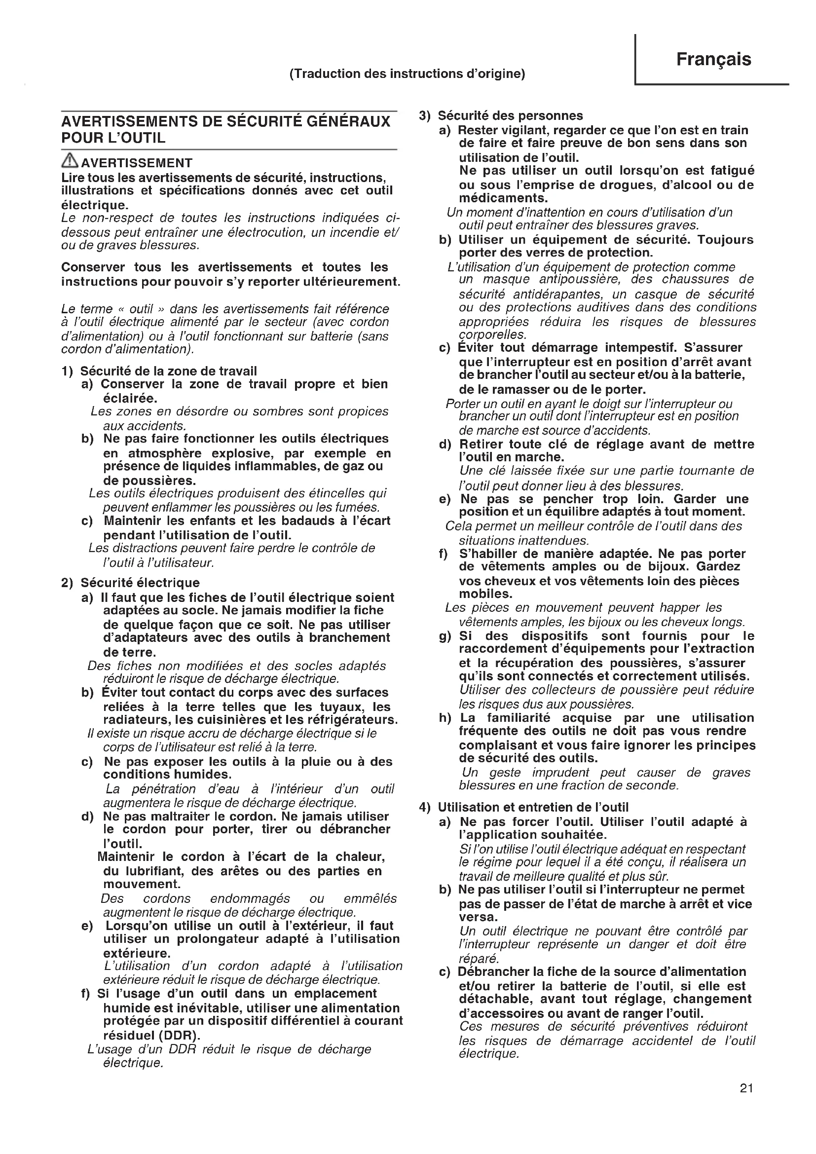 a) Rester vigilant, regarder ce que l’on est en train de faire et faire preuve de bon sens dans son utilisation de l’outil. Ne pas utiliser un outil lorsqu’on est fatigué ou sous l’emprise de drogues, d’alcool ou de médicaments. Un moment d’inattention en cours d’utilisation d’un outil peut entraîner des blessures graves. b) Utiliser un équipement de sécurité. Toujours porter des verres de protection. L’utilisation d’un équipement de protection comme un masque antipoussière, des chaussures de sécurité antidérapantes, un casque de sécurité ou des protections auditives dans des conditions appropriées réduira les risques de blessures corporelles. c) Éviter tout démarrage intempestif. S’assurer que l’interrupteur est en position d’arrêt avant de brancher l’outil au secteur et/ou à la batterie, de le ramasser ou de le porter. Porter un outil en ayant le doigt sur l’interrupteur ou brancher un outil dont l’interrupteur est en position de marche est source d’accidents. d) Retirer toute clé de réglage avant de mettre l’outil en marche. Une clé laissée xée sur une partie tournante de l’outil peut donner lieu à des blessures. e) Ne pas se pencher trop loin. Garder une position et un équilibre adaptés à tout moment. Cela permet un meilleur contrôle de l’outil dans des situations inattendues. f) S’habiller de manière adaptée. Ne pas porter de vêtements amples ou de bijoux. Gardez vos cheveux et vos vêtements loin des pièces mobiles. Les pièces en mouvement peuvent happer les vêtements amples, les bijoux ou les cheveux longs. g) Si des dispositifs sont fournis pour le raccordement d’équipements pour l’extraction et la récupération des poussières, s’assurer qu’ils sont connectés et correctement utilisés. Utiliser des collecteurs de poussière peut réduire les risques dus aux poussières. h) La familiarité acquise par une utilisation fréquente des outils ne doit pas vous rendre complaisant et vous faire ignorer les principes de sécurité des outils. Un geste imprudent peut causer de graves blessures en une fraction de seconde.