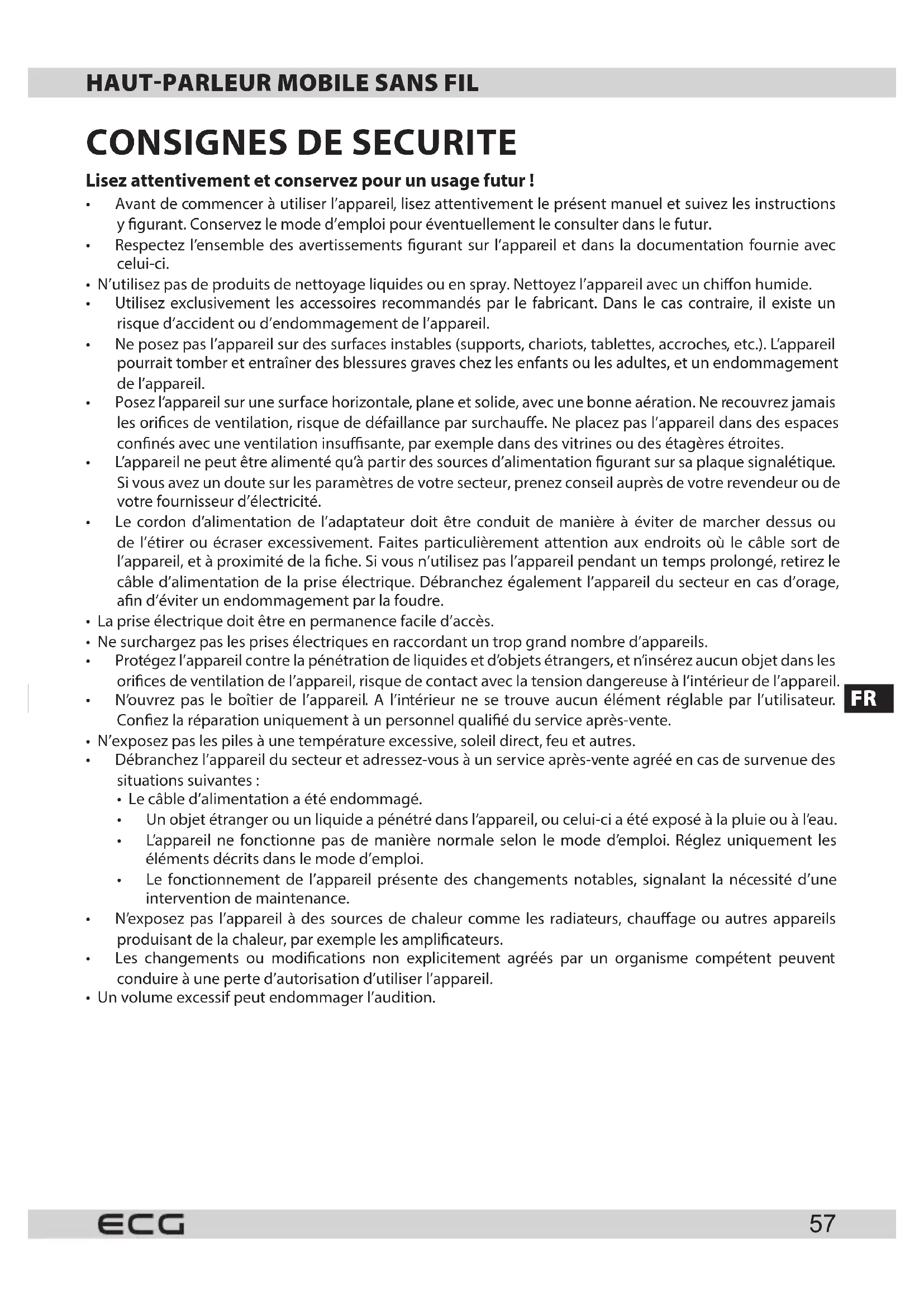 - Pour la recharge du haut-parleur, utilisez uniquement un adaptateur de qualité.