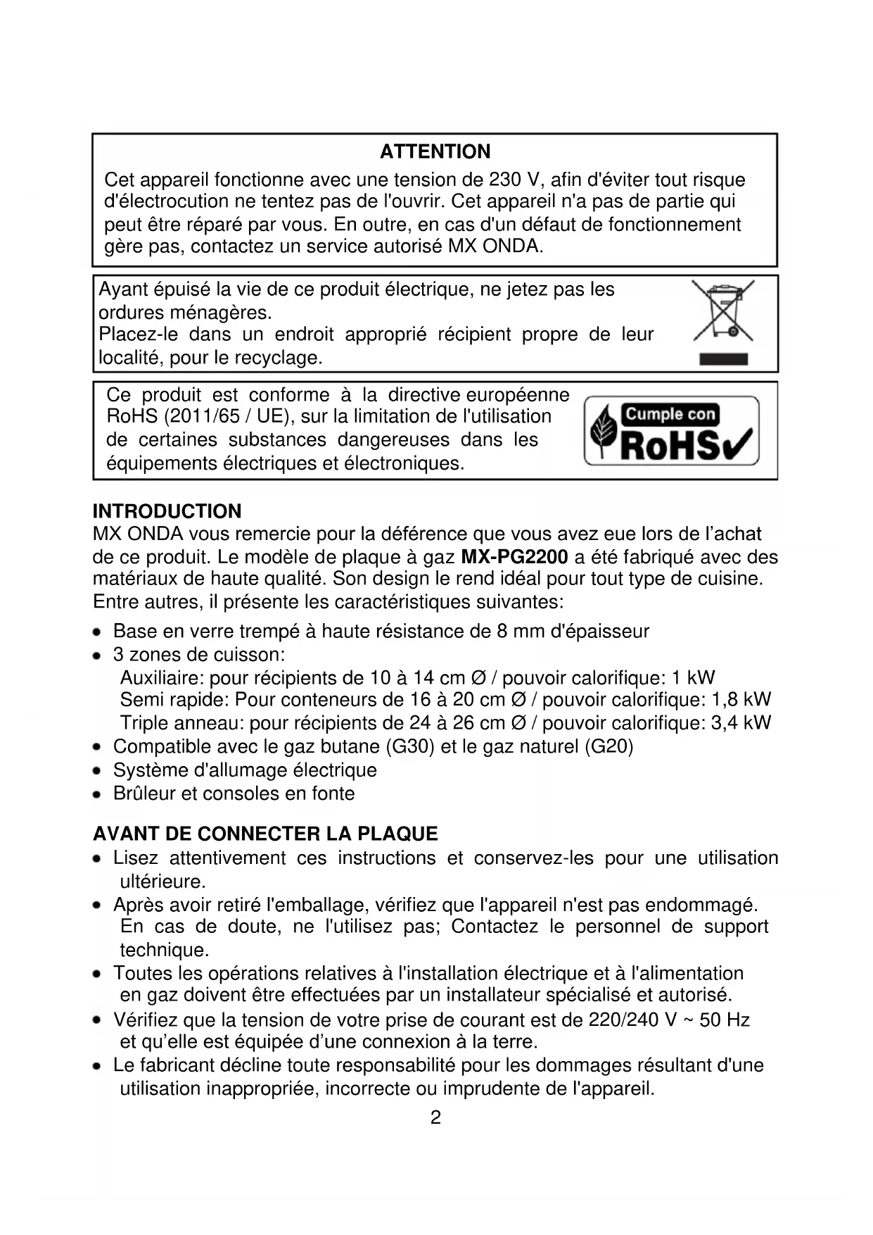 Ce produit est conforme à la directive européenne RoHS (2011/65 / UE), sur la limitation de l'utilisation de certaines substances dangereuses dans les équipements électriques et électroniques. INTRODUCTION MX ONDA vous remercie pour la déférence que vous avez eue lors de l’achat de ce produit. Le modèle de plaque à gaz MX-PG2200 a été fabriqué avec des matériaux de haute qualité. Son design le rend idéal pour tout type de cuisine. Entre autres, il présente les caractéristiques suivantes: Base en verre trempé à haute résistance de 8 mm d'épaisseur 3 zones de cuisson: Auxiliaire: pour récipients de 10 à 14 cm Ø / pouvoir calorifique: 1 kW Semi rapide: Pour conteneurs de 16 à 20 cm Ø / pouvoir calorifique: 1,8 kW Triple anneau: pour récipients de 24 à 26 cm Ø / pouvoir calorifique: 3,4 kW Compatible avec le gaz butane (G30) et le gaz naturel (G20) Système d'allumage électrique Brûleur et consoles en fonte