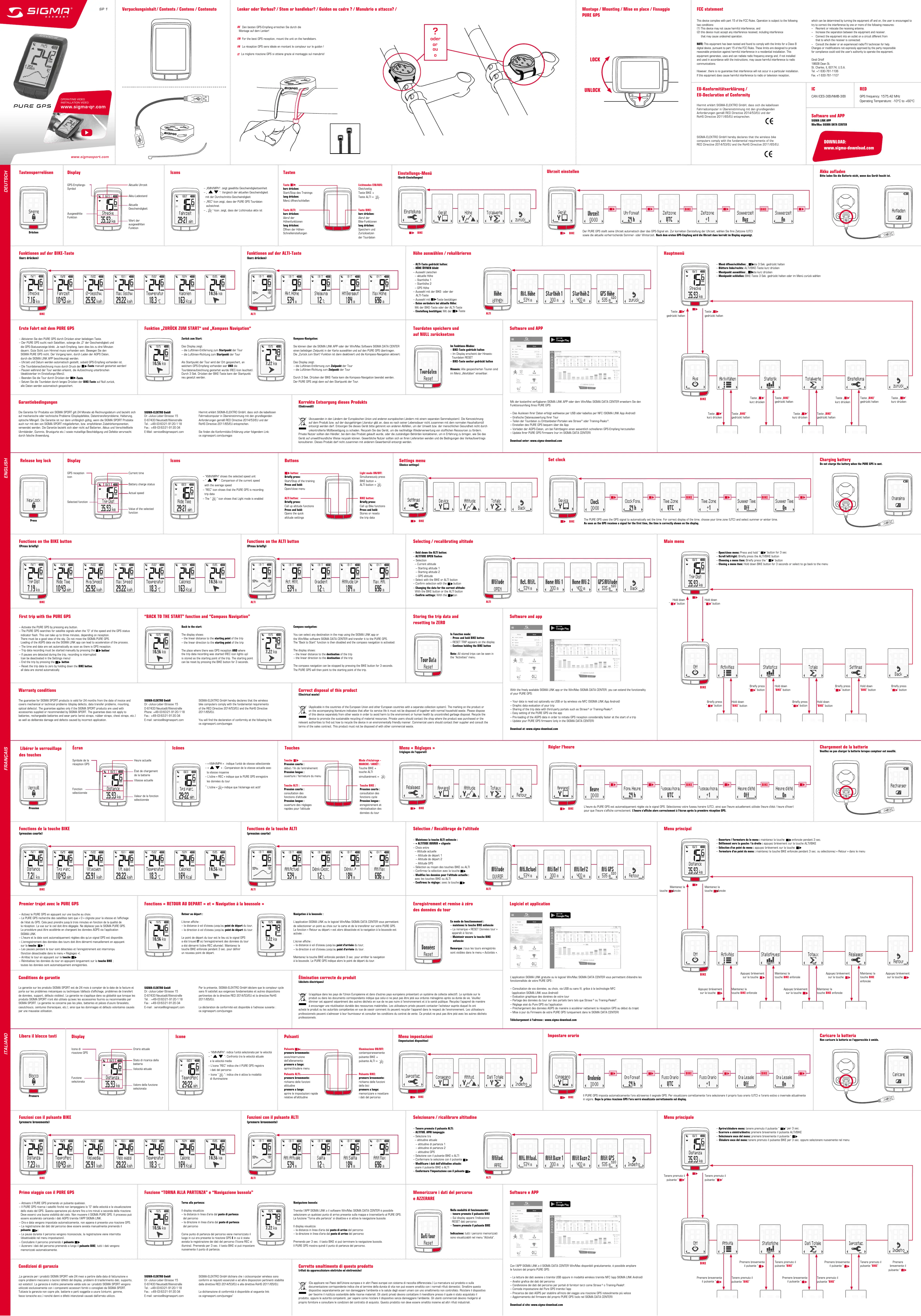 – Easy setting of the PURE GPS via the app– Pre-loading of the AGPS data in order to initiate GPS reception considerably faster at the start of a trip– Update your PURE GPS firmware (only in the SIGMA DATA CENTER)Download at: www.sigma-download.comL‘application SIGMA LINK gratuite ou le logiciel Win/Mac SIGMA DATA CENTER vous permettent d‘étendre les fonctionnalités de votre PURE GPS: – Consultation de vos données, au choix, via USB ou sans fil, grâce à la technologie NFC (application SIGMA LINK sous Android)– Évaluation graphique des donénes de votre tour– Partage des données du tour sur des portails tiers tels que Strava ou Traning-Peaks