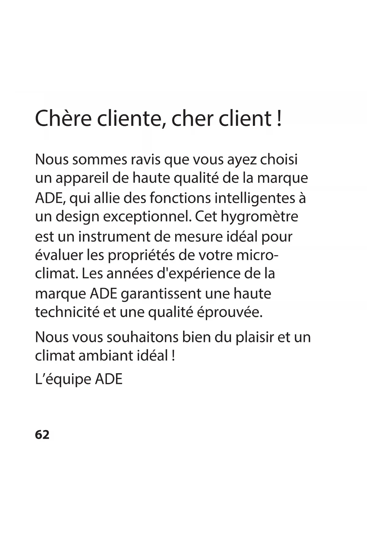 Nous sommes ravis que vous ayez choisi un appareil de haute qualité de la marque ADE, qui allie des fonctions intelligentes à un design exceptionnel. Cet hygromètre est un instrument de mesure idéal pour évaluer les propriétés de votre micro-climat. Les années d'expérience de la marque ADE garantissent une haute technicité et une qualité éprouvée.