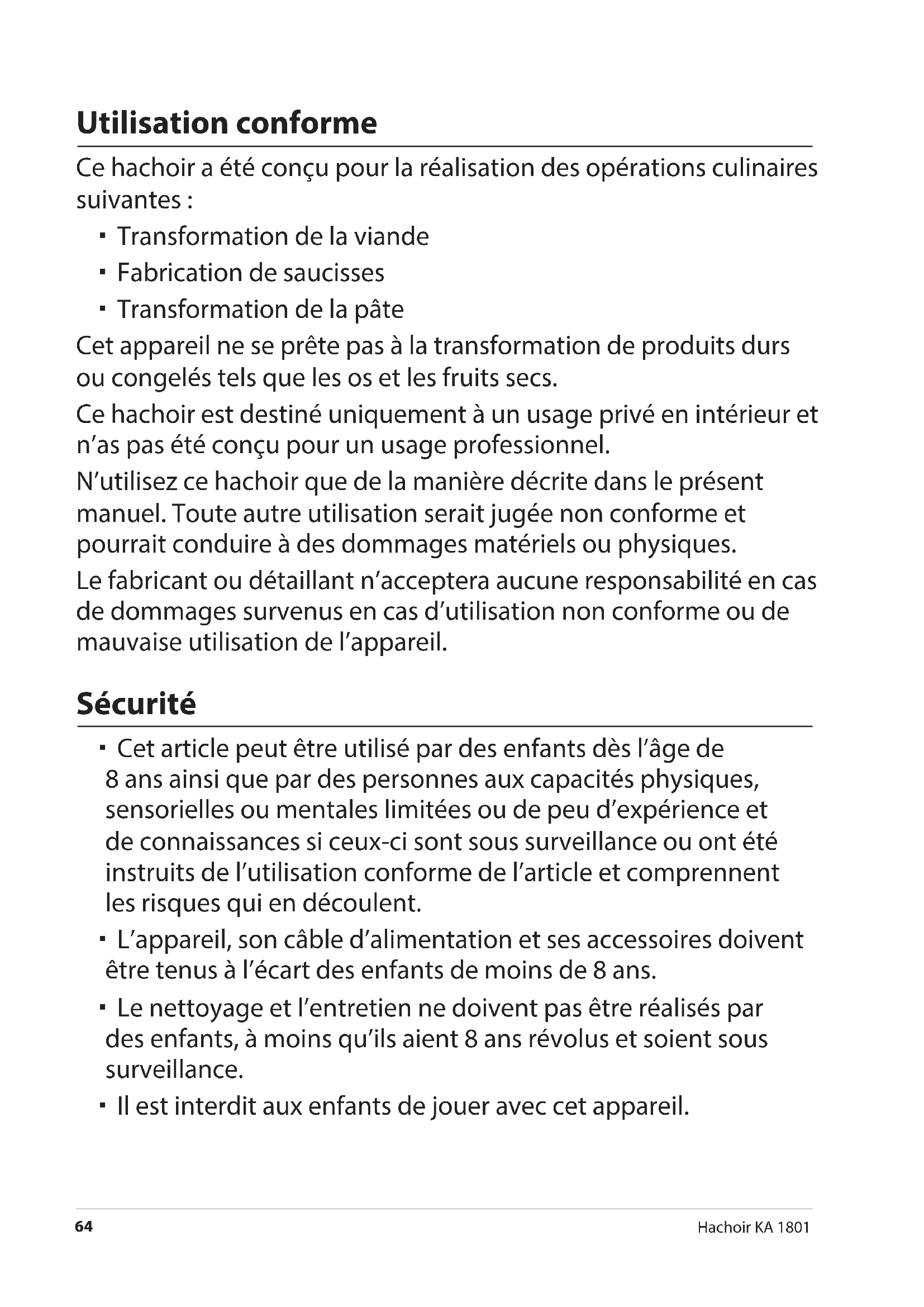 N'utilisez ce hachoir que de la manière décrite dans le présent manuel. Toute autre utilisation serait jugée non conforme et pourrait conduire à des dommages matériels ou physiques.
