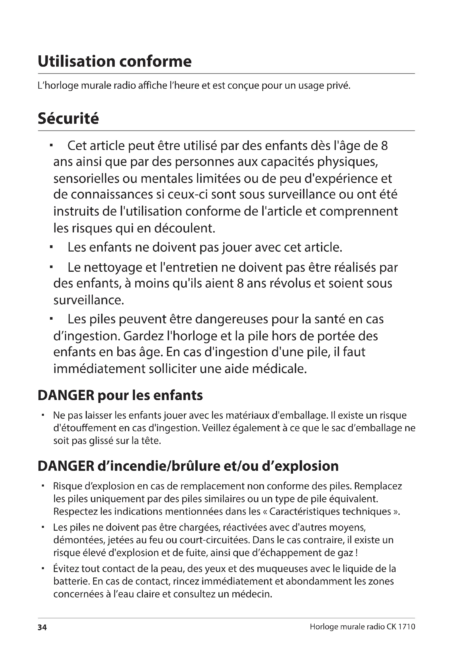 - Les piles peuvent être dangereuses pour la santé en cas d'ingestion. Gardez l'horloge et la pile hors de portée des enfants en bas âge. En cas d'ingestion d'une pile, il faut immédiatement solliciter une aide médicale.