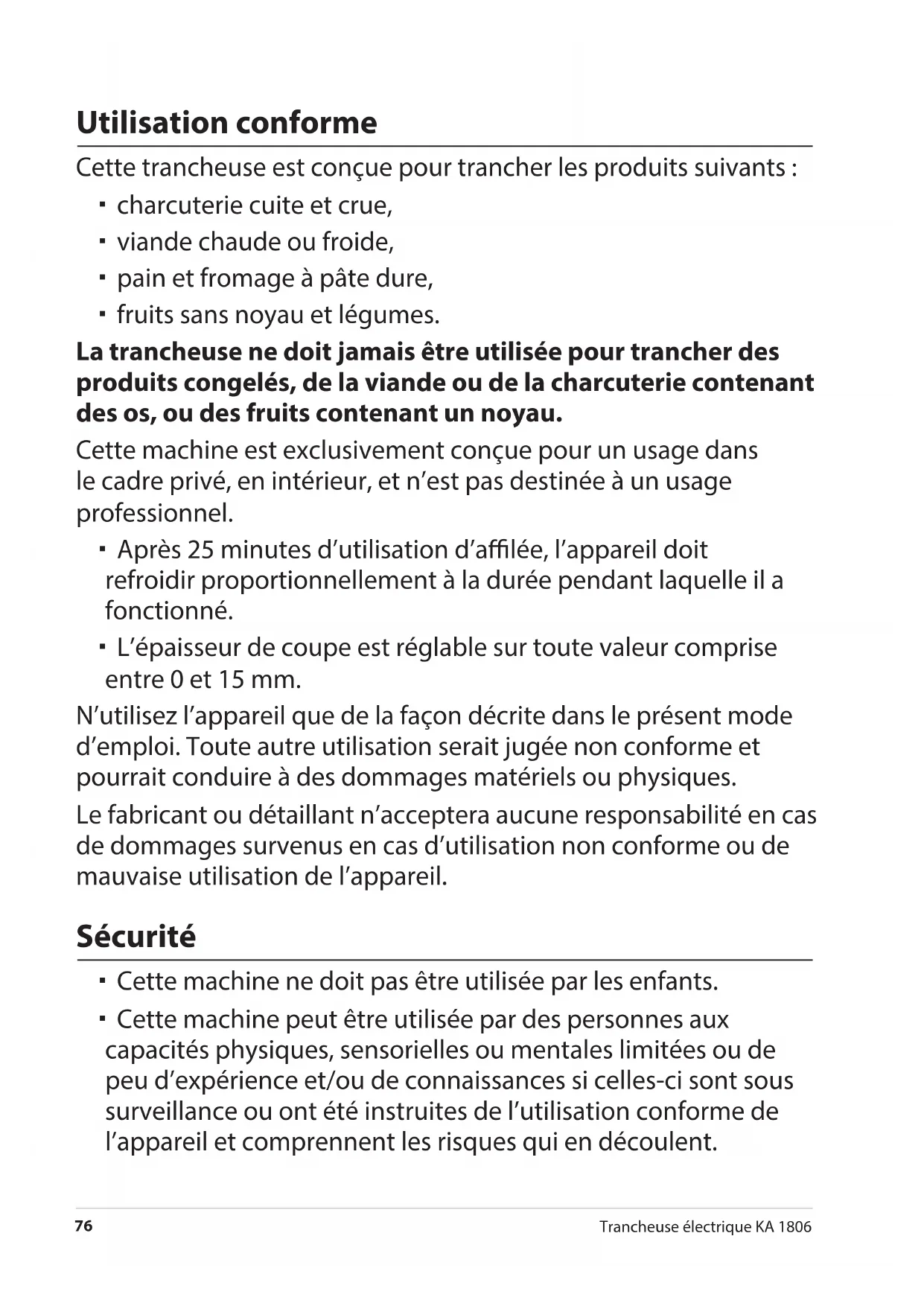 La trancheuse ne doit jamais être utilisée pour trancher des produits congelés, de la viande ou de la charcuterie contenant des os, ou des fruits contenant un noyau.
