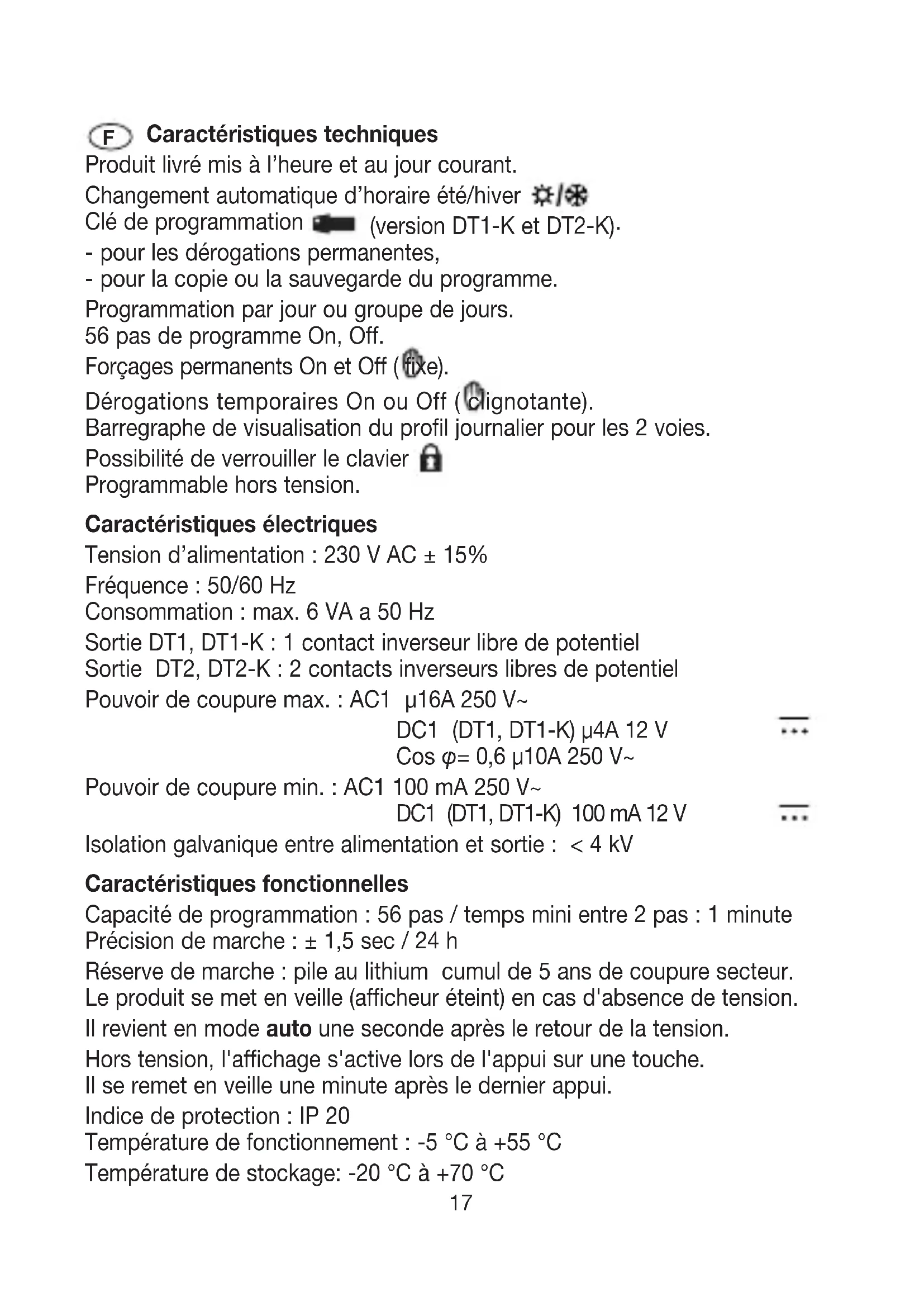 Caractéristiques techniques Produit livré mis à l’heure et au jour courant. Changement automatique d’horaire été/hiver . Clé de programmation (version DT1-K et DT2-K)