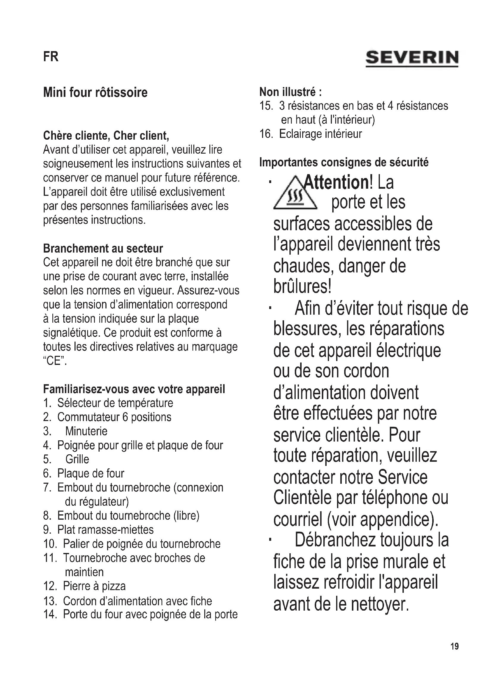 Mini four rôtissoire Chère cliente, Cher client, Avant d’utiliser cet appareil, veuillez lire soigneusement les instructions suivantes et conserver ce manuel pour future référence. L’appareil doit être utilisé exclusivement par des personnes familiarisées avec les présentes instructions. Branchement au secteur Cet appareil ne doit être branché que sur une prise de courant avec terre, installée selon les normes en vigueur. Assurez-vous que la tension d’alimentation correspond à la tension indiquée sur la plaque signalétique. Ce produit est conforme à toutes les directives relatives au marquage “CE”. Familiarisez-vous avec votre appareil