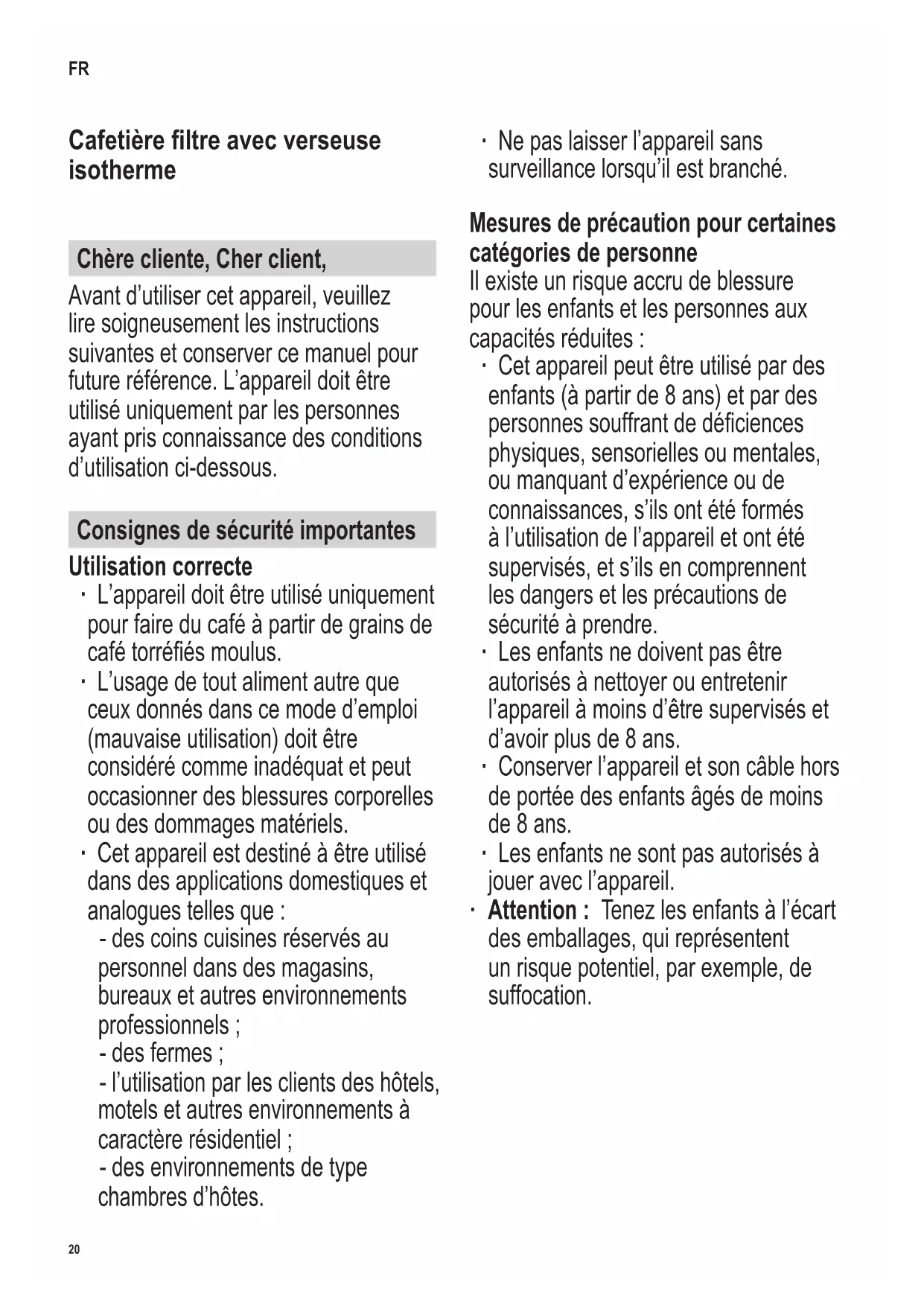 Should you be unable to solve the problem using the table, please contact our Customer Service. The contact data can be found in the appendix to this manual.20 142 x 208 mm Cafetière ltre avec verseuse isotherme Chère cliente, Cher client, Avant d’utiliser cet appareil, veuillez lire soigneusement les instructions suivantes et conserver ce manuel pour future référence. L’appareil doit être utilisé uniquement par les personnes ayant pris connaissance des conditions d’utilisation ci-dessous. Consignes de sécurité importantes Utilisation correcte ∙ L’appareil doit être utilisé uniquement pour faire du café à partir de grains de café torréés moulus. ∙ L’usage de tout aliment autre que ceux donnés dans ce mode d’emploi (mauvaise utilisation) doit être considéré comme inadéquat et peut occasionner des blessures corporelles ou des dommages matériels. ∙ Cet appareil est destiné à être utilisé dans des applications domestiques et analogues telles que : - des coins cuisines réservés au personnel dans des magasins, bureaux et autres environnements professionnels ; - des fermes ; - l’utilisation par les clients des hôtels, motels et autres environnements à caractère résidentiel ; - des environnements de type chambres d’hôtes. ∙ Ne pas laisser l’appareil sans surveillance lorsqu’il est branché. Mesures de précaution pour certaines catégories de personne Il existe un risque accru de blessure pour les enfants et les personnes aux capacités réduites : ∙ Cet appareil peut être utilisé par des enfants (à partir de 8 ans) et par des personnes souffrant de déciences physiques, sensorielles ou mentales, ou manquant d’expérience ou de connaissances, s’ils ont été formés à l’utilisation de l’appareil et ont été supervisés, et s’ils en comprennent les dangers et les précautions de sécurité à prendre. ∙ Les enfants ne doivent pas être autorisés à nettoyer ou entretenir l’appareil à moins d’être supervisés et d’avoir plus de 8 ans. ∙ Conserver l’appareil et son câble hors de portée des enfants âgés de moins de 8 ans. ∙ Les enfants ne sont pas autorisés à jouer avec l’appareil. ∙ Attention : Tenez les enfants à l’écart des emballages, qui représentent un risque potentiel, par exemple, de suffocation. FR21 142 x 208 mm Risque de choc électrique L’appareil est alimenté par l’électricité, et le risque de choc électrique existe en permanence. Les précautions suivantes doivent donc être prises : ∙ Avant toute utilisation, vériez soigneusement que l’appareil, son cordon d’alimentation et ses accessoires ne présentent aucun signe de détérioration qui pourrait avoir un effet néfaste sur la sécurité de fonctionnement de l’appareil. Au cas où l’appareil, par exemple, serait tombé sur une surface dure, ou si une force excessive aurait été employée pour tirer sur le cordon d’alimentation, il ne doit plus être utilisé. ∙ Cet appareil ne doit être branché que sur une prise de courant installée selon les normes en vigueur. Assurez- vous que la tension d’alimentation correspond à la tension indiquée sur la plaque signalétique de l’appareil. ∙ Débranchez toujours la che de la prise murale - après l’emploi, - en cas de fonctionnement défectueux, - avant de nettoyer l’appareil. ∙ Ne pas débrancher l’appareil en tirant sur le cordon ; tirez toujours sur la che. ∙ Ne touchez pas la che avec des mains mouillées. ∙ Ne plongez pas l’appareil dans l’eau ou tout autre liquide. Ne le nettoyez pas sous l’eau courante. Risque de brûlure ou d’ébouillantage L’appareil chauffe l’eau et la maintient au chaud. Les surfaces externes, le fond de la verseuse et le socle deviennent chauds pendant l’utilisation et conservent la chaleur même après quelque temps. Il existe donc un risque de brûlure ou d’ébouillantage. ∙ Ne pas toucher ces parties pendant l’utilisation. Après l’utilisation, laissez- les d’abord refroidir. ∙ Ne pas faire basculer le porte-ltre pivotant pendant l’utilisation. ∙ Laissez toujours l’appareil sufsamment refroidir pendant environ 5 minutes après l’utilisation, avant d’ouvrir le porte-ltre pivotant ou de remplir le réservoir d’eau fraîche. Manque d’hygiène Le manque d’hygiène peut entraîner la formation de bactéries à l’intérieur de l’appareil : ∙ Nettoyez soigneusement l’appareil avant de l’utiliser pour la première fois. ∙ Débranchez toujours la che de la prise murale et laissez refroidir l’appareil avant de le nettoyer. ∙ Le ltre plastique amovible et la verseuse doivent être nettoyés tous les jours. ∙ Ne laissez aucune eau dans le réservoir. ∙ L’appareil doit être détartré régulièrement. ∙ Des informations détaillées concernant le nettoyage de l’appareil se trouvent dans le paragraphe Nettoyage et entretien.22 142 x 208 mm Risque de dommage matériel La mauvaise utilisation de l’appareil peut entraîner des dommages : ∙ Posez toujours l’appareil sur une surface plane et sèche, qui résiste à la chaleur et qui ne craint pas le contact avec les pieds en caoutchouc. ∙ Ne pas utiliser l’appareil sous un placard mural ou autre objet similaire, au risque de bloquer le bon échappement de la vapeur. ∙ Ne pas laisser pendre le cordon. ∙ Ne pas entortiller ou pincer le cordon d’alimentation. Tenez le cordon d’alimentation et l’appareil à l’écart des sources de chaleur (par exemple plaques de cuisson et ammes de gaz). ∙ Utilisez uniquement l’eau froide du robinet pour remplir le réservoir. En cas d’appareil défectueux Un appareil défectueux peut entraîner des dommages matériels ou des blessures : ∙ Vériez l’appareil an de détecter tout signe de dommage avant chaque utilisation. Ne pas faire fonctionner si l’appareil montre des signes de dommage. ∙ En cas de dommage, veuillez contacter notre service clie