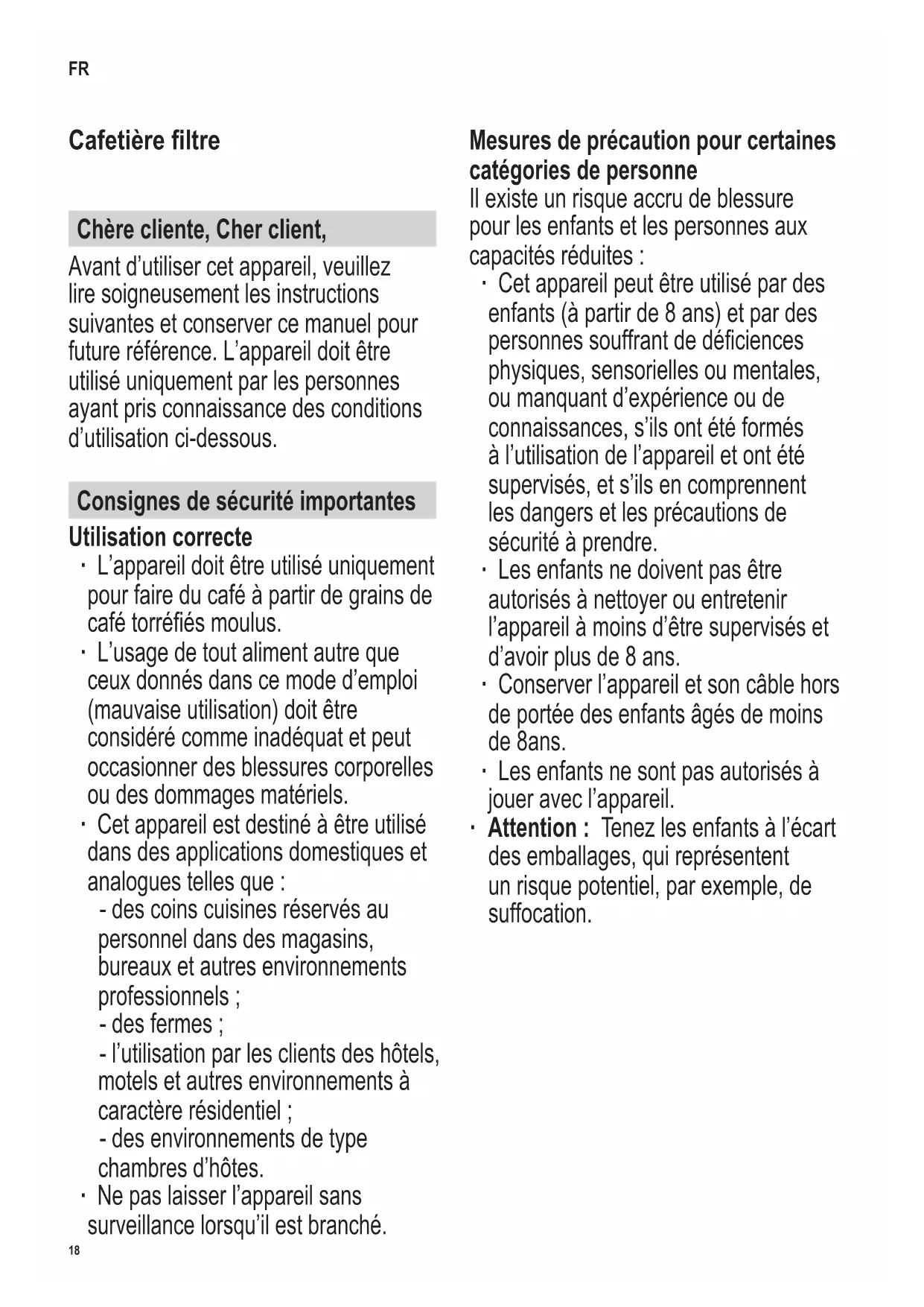 Should you be unable to solve the problem using the table, please contact our Customer Service. The contact data can be found in the appendix to this manual.18 142 x 208 mm Cafetière ltre Chère cliente, Cher client, Avant d’utiliser cet appareil, veuillez lire soigneusement les instructions suivantes et conserver ce manuel pour future référence. L’appareil doit être utilisé uniquement par les personnes ayant pris connaissance des conditions d’utilisation ci-dessous. Consignes de sécurité importantes Utilisation correcte ∙ L’appareil doit être utilisé uniquement pour faire du café à partir de grains de café torréés moulus. ∙ L’usage de tout aliment autre que ceux donnés dans ce mode d’emploi (mauvaise utilisation) doit être considéré comme inadéquat et peut occasionner des blessures corporelles ou des dommages matériels. ∙ Cet appareil est destiné à être utilisé dans des applications domestiques et analogues telles que : - des coins cuisines réservés au personnel dans des magasins, bureaux et autres environnements professionnels ; - des fermes ; - l’utilisation par les clients des hôtels, motels et autres environnements à caractère résidentiel ; - des environnements de type chambres d’hôtes. ∙ Ne pas laisser l’appareil sans surveillance lorsqu’il est branché. Mesures de précaution pour certaines catégories de personne Il existe un risque accru de blessure pour les enfants et les personnes aux capacités réduites : ∙ Cet appareil peut être utilisé par des enfants (à partir de 8 ans) et par des personnes souffrant de déciences physiques, sensorielles ou mentales, ou manquant d’expérience ou de connaissances, s’ils ont été formés à l’utilisation de l’appareil et ont été supervisés, et s’ils en comprennent les dangers et les précautions de sécurité à prendre. ∙ Les enfants ne doivent pas être autorisés à nettoyer ou entretenir l’appareil à moins d’être supervisés et d’avoir plus de 8 ans. ∙ Conserver l’appareil et son câble hors de portée des enfants âgés de moins de 8ans. ∙ Les enfants ne sont pas autorisés à jouer avec l’appareil. ∙ Attention : Tenez les enfants à l’écart des emballages, qui représentent un risque potentiel, par exemple, de suffocation. FR19 142 x 208 mm Risque de choc électrique L’appareil est alimenté par l’électricité, et le risque de choc électrique existe en permanence. Les précautions suivantes doivent donc être prises : ∙ Avant toute utilisation, vériez soigneusement que l’appareil, son cordon d’alimentation et ses accessoires ne présentent aucun signe de détérioration qui pourrait avoir un effet néfaste sur la sécurité de fonctionnement de l’appareil. Au cas où l’appareil, par exemple, serait tombé sur une surface dure, ou si une force excessive aurait été employée pour tirer sur le cordon d’alimentation, il ne doit plus être utilisé. ∙ Cet appareil ne doit être branché que sur une prise de courant installée selon les normes en vigueur. Assurez- vous que la tension d’alimentation correspond à la tension indiquée sur la plaque signalétique de l’appareil. ∙ Débranchez toujours la che de la prise murale - après l’emploi, - en cas de fonctionnement défectueux, - avant de nettoyer l’appareil. ∙ Ne pas débrancher l’appareil en tirant sur le cordon ; tirez toujours sur la che. ∙ Ne touchez pas la che avec des mains mouillées. ∙ Ne plongez pas l’appareil dans l’eau ou tout autre liquide. Ne le nettoyez pas sous l’eau courante. Risque de brûlure ou d’ébouillantage L’appareil chauffe l’eau et la maintient au chaud. Les surfaces extérieures, la verseuse et la plaque chauffante deviennent chaudes pendant l’utilisation et le restent même après l’utilisation. Il existe donc un risque de brûlure ou d’ébouillantage. ∙ Ne pas toucher ces parties pendant l’utilisation. Après l’utilisation, laissez- les d’abord refroidir. ∙ Ne pas faire basculer le porte-ltre pivotant pendant l’utilisation. ∙ Laissez toujours l’appareil sufsamment refroidir pendant environ 5 minutes après l’utilisation, avant d’ouvrir le porte-ltre pivotant ou de remplir le réservoir d’eau fraîche. Manque d’hygiène Le manque d’hygiène peut entraîner la formation de bactéries à l’intérieur de l’appareil : ∙ Nettoyez soigneusement l’appareil avant de l’utiliser pour la première fois. ∙ Débranchez toujours la che de la prise murale et laissez refroidir l’appareil avant de le nettoyer. ∙ Le ltre plastique amovible et la verseuse doivent être nettoyés tous les jours. ∙ Ne laissez aucune eau dans le réservoir. ∙ L’appareil doit être détartré régulièrement. ∙ Des informations détaillées concernant le nettoyage de l’appareil se trouvent dans le paragraphe Nettoyage et entretien.20 142 x 208 mm Risque de dommage matériel La mauvaise utilisation de l’appareil peut entraîner des dommages : ∙ Posez toujours l’appareil sur une surface plane et sèche, qui résiste à la chaleur et qui ne craint pas le contact avec les pieds en caoutchouc. ∙ Ne pas utiliser l’appareil sous un placard mural ou autre objet similaire, au risque de bloquer le bon échappement de la vapeur. ∙ Ne pas laisser pendre le cordon. ∙ Ne pas entortiller ou pincer le cordon d’alimentation. Tenez le cordon d’alimentation et l’appareil à l’écart des sources de chaleur (par exemple plaques de cuisson et ammes de gaz). ∙ Utilisez uniquement l’eau froide du robinet pour remplir le réservoir. En cas d’appareil défectueux Un appareil défectueux peut entraîner des dommages matériels ou des blessures : ∙ Vériez l’appareil an de détecter tout signe de dommage avant chaque utilisation. Ne pas faire fonctionner si l’appareil montre des signes de dommage. ∙ En cas de dommage, veuillez contacter notre service clientèle par téléphone ou pa