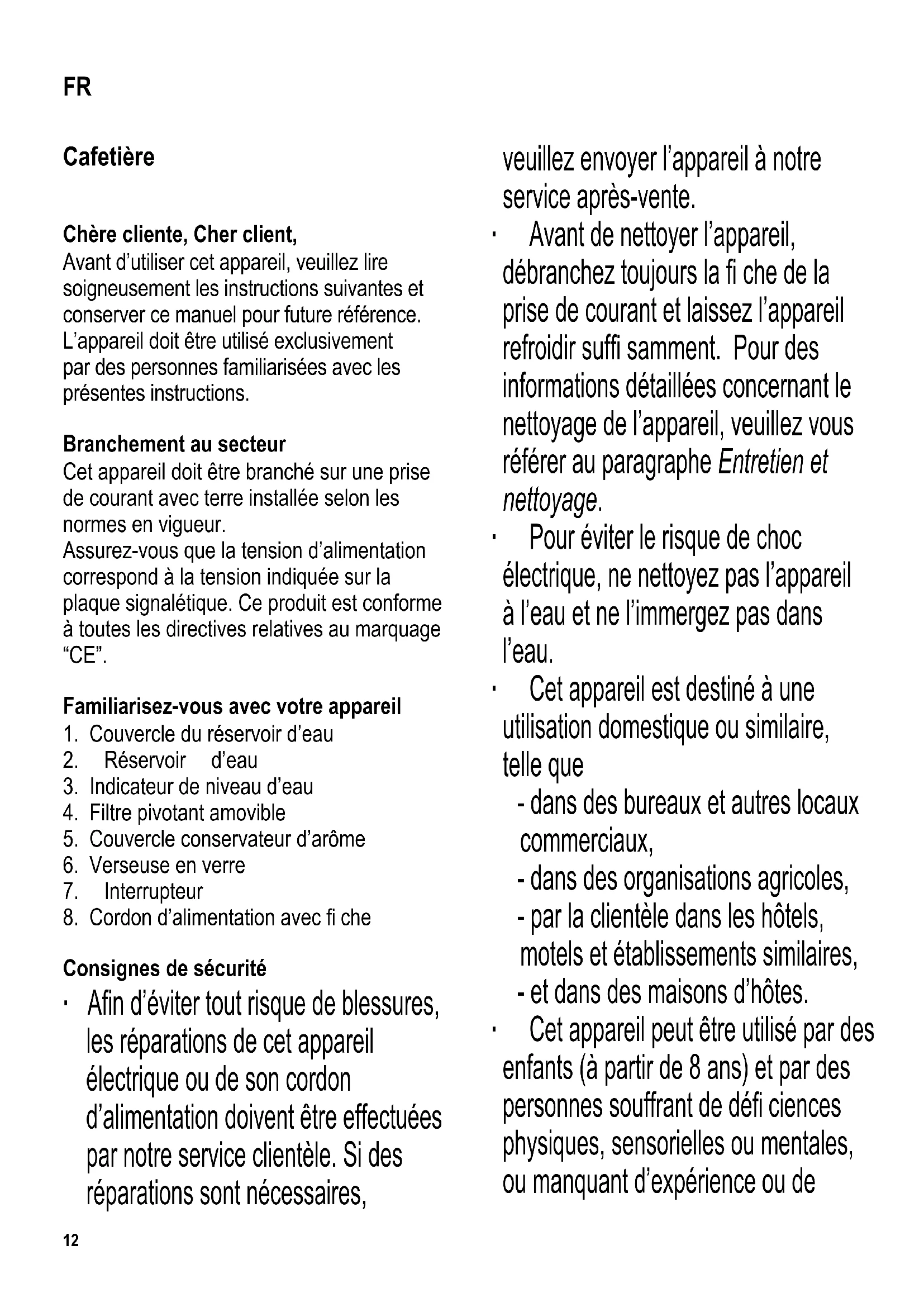 Consignes de sécurité ∙ A fi n d’éviter tout risque de blessures, les réparations de cet appareil électrique ou de son cordon d’alimentation doivent être effectuées par notre service clientèle. Si des réparations sont nécessaires, veuillez envoyer l’appareil à notre service après-vente. ∙ Avant de nettoyer l’appareil, débranchez toujours la fi che de la prise de courant et laissez l’appareil refroidir suffi samment. Pour des informations détaillées concernant le nettoyage de l’appareil, veuillez vous référer au paragraphe Entretien et nettoyage. ∙ Pour éviter le risque de choc électrique, ne nettoyez pas l’appareil à l’eau et ne l’immergez pas dans l’eau. ∙ Cet appareil est destiné à une utilisation domestique ou similaire, telle que - dans des bureaux et autres locaux commerciaux, - dans des organisations agricoles, - par la clientèle dans les hôtels, motels et établissements similaires, - et dans des maisons d’hôtes. ∙ Cet appareil peut être utilisé par des enfants (à partir de 8 ans) et par des personnes souffrant de défi ciences physiques, sensorielles ou mentales, ou manquant d’expérience ou de FR13 connaissances, s’ils ont été formés à l’utilisation de l’appareil et ont été supervisés, et s’ils en comprennent les dangers et les précautions de sécurité à prendre. ∙ Les enfants ne sont pas autorisés à jouer avec l’appareil. ∙ Les enfants ne doivent pas être autorisés à nettoyer ou entretenir l’appareil à moins d’être supervisés et d’avoir plus de 8 ans. ∙ L’appareil et son cordon d’alimentation doivent être, à tout moment, tenus hors de portée des enfants de moins de 8 ans. ∙ Attention : Tenez les enfants à l’écart des emballages, qui représentent un risque potentiel, par exemple, de suffocation. ∙ Avant toute utilisation, vérifi ez soigneusement que l’appareil, son cordon d’alimentation et ses accessoires ne présentent aucun signe de détérioration qui pourrait avoir un effet néfaste sur la sécurité de fonctionnement de l’appareil. Au cas où l’appareil, par exemple, serait tombé sur une surface dure, ou si une force excessive aurait été employée pour tirer sur le cordon d’alimentation, il ne doit plus être utilisé. ∙ Avant utilisation, vérifi ez que la poignée de la verseuse est correctement et solidement attachée. Si nécessaire, la bague métallique peut être resserrée à l’aide de la vis située dans la poignée. ∙ Pendant l’utilisation, la cafetière doit être placée sur une surface plane, antidérapante et imperméable aux éclaboussures et taches. ∙ Ne laissez jamais l’appareil ou le cordon d’alimentation toucher une surface chaude ou entrer en contact avec une source de chaleur. ∙ Attention : La plaque chauffante devient très chaude pendant le fonctionnement. ∙ Pour éviter tout risque de dégagement d’eau chaude ou de vapeur, éteignez toujours la cafetière et laissez-la refroidir avant de l’ouvrir ou d’en retirer les accessoires. ∙ Les enfants doivent être surveillés afi n qu’ils ne jouent pas avec l’appareil. ∙ Retirez la fi che de la prise murale - en cas de fonctionnement anormal, - avant de nettoyer l’appareil, - si l’appareil reste longtemps sans être utilisé. ∙ Ne débranchez pas l’appareil en tirant sur le cordon ; tirez toujours sur la fi che. ∙ Ne laissez pas le cordon d’alimentation pendre librement ; le cordon doit toujours être tenu à l’écart des surfaces chaudes de l’appareil. ∙ Nous déclinons toute responsabilité pour les dommages éventuels subis par cet appareil, résultant d’une utilisation incorrecte ou du non-respect de ce mode d’emploi. Avant la première utilisation Avant de préparer du café pour la première fois, laissez l’appareil compléter deux ou trois cycles de fi ltration en utilisant la quantité d’eau froide maximale indiquée, mais sans utiliser de café moulu. Cette opération doit également être effectuée14 si l’appareil n’a pas été utilisé pendant longtemps, et suite au détartrage. Informations générales ∙ Les graduations de niveau d’eau situées sur la verseuse et sur le réservoir facilitent le dosage correct en eau claire. Si l’échelle est double, celle de gauche est utilisée pour les tasses normales d’environ 125ml, celle de droite pour les tasses plus petites. Prenez soin de ne pas dépasser le niveau maximum d’eau. ∙ Pour plusieurs cycles de fi ltration de suite, éteignez l’appareil entre les cycles et laissez-le refroidir pendant 5 minutes environ. ∙ Remarque importante : Lors du remplissage en eau froide immédiatement après un cycle de fi ltration, il existe un risque de brûlure dû à l’évacuation d’eau chaude ou de vapeur par le bec de sortie de l’eau. Préparation du café ∙ Remplissage en eau : Ouvrez le couvercle du réservoir, remplissez le réservoir de la quantité d’eau froide requise, puis refermez le couvercle. ∙ Insertion du fi ltre en papier : Faites basculer le fi ltre pivotant sur le côté, puis insérez-y un fi ltre N°4, en prenant soin auparavant de plier les bords perforés du fi ltre. ∙ Remplissage en café moulu : Pour chaque tasse normale (125ml), prévoyez une mesure d’environ 6 g (= 1½ - 2 c.à.c.) de café moulu. Refermez ensuite le porte-fi ltre. ∙ Préparation de la verseuse : Placez le couvercle conservateur d’arôme sur la verseuse, puis placez la verseuse sur l’appareil. Lorsque le couvercle est correctement positionné, il ouvre le système anti-goutte du porte-fi ltre pendant la fi ltration. ∙ Lancement du cycle de fi ltration : Branchez la fi che à une prise de courant appropriée et allumez la cafetière à l’aide de l’interrupteur; le cycle de fi ltration démarre et l’eau passe à travers du fi ltre. ∙ Enlèvement de la verseuse : Attendez la percolation complète de l’eau à travers le fi ltre avant d’e