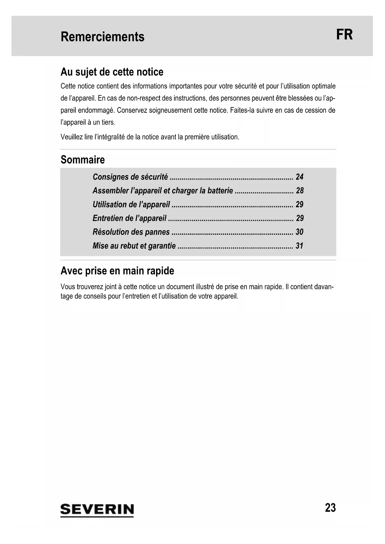 - Disposing of the appliance and rechargeable battery Appliances and rechargeable batteries which are marked with this symbol must be disposed of separately from domestic waste. Appliances and rechargeable batteries contain valuable raw materials that can be recycled. Proper disposal protects the environment and the health of your fellow men. Dispose of the appliance and the removed rechargeable battery separately at the appropriate collection points. Warranty The legal warranty rights with respect to the seller and any seller warranties are unaffected by the following warranty conditions. If repairs are required, contact our customer service department by telephone or e-mail. The contact information can be found in the appendix to this instruction manual. In case of war- ranty claim, you can also contact the dealer directly. In addition, SEVERIN grants a manufacturer’s warranty of two years from the date of purchase. During this period, we will eliminate all defects caused by material or production faults that compromise the function. Other claims are excluded. Excepted from the warranty are: Damage that is due to non-observance of the instruction manual, improper handling or normal wear; also easily-breakable parts such as glass, plastic or LEDs. Bat- teries and rechargeable batteries which are faulty or whose service life has been shortened as a result of normal wear or improper handling, are not covered by the warranty either. If the appliance is tampered with by persons not authorised by SEVERIN, this will render the war- ranty null and void.23 Remerciements 1 Remerciements Au sujet de cette notice Cette notice contient des informations importantes pour votre sécurité et pour l’utilisation optimale de l’appareil. En cas de non-respect des instructions, des personnes peuvent être blessées ou l’ap- pareil endommagé. Conservez soigneusement cette notice. Faites-la suivre en cas de cession de l’appareil à un tiers. Veuillez lire l’intégralité de la notice avant la première utilisation. Sommaire Consignes de sécurité p. 24