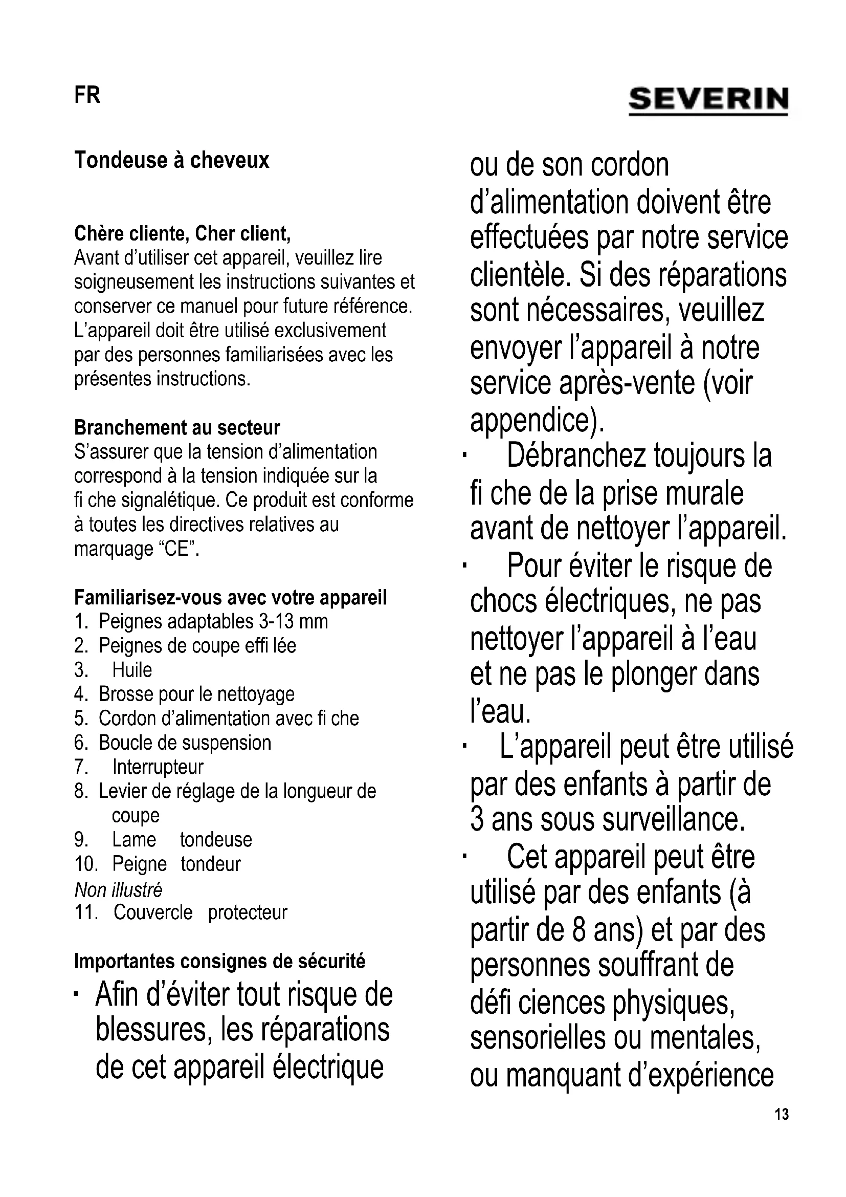 Importantes consignes de sécurité ∙ A fi n d’éviter tout risque de blessures, les réparations de cet appareil électrique ou de son cordon d’alimentation doivent être effectuées par notre service clientèle. Si des réparations sont nécessaires, veuillez envoyer l’appareil à notre service après-vente (voir appendice). ∙ Débranchez toujours la fi che de la prise murale avant de nettoyer l’appareil. ∙ Pour éviter le risque de chocs électriques, ne pas nettoyer l’appareil à l’eau et ne pas le plonger dans l’eau. ∙ L’appareil peut être utilisé par des enfants à partir de 3 ans sous surveillance. ∙ Cet appareil peut être utilisé par des enfants (à partir de 8 ans) et par des personnes souffrant de défi ciences physiques, sensorielles ou mentales, ou manquant d’expérience FR14 ou de connaissances, s’ils ont été formés à l’utilisation de l’appareil et ont été supervisés, et s’ils en comprennent les dangers et les précautions de sécurité à prendre. ∙ Les enfants ne sont pas autorisés à jouer avec l’appareil. ∙ Le nettoyage et la maintenance utilisateur ne doivent pas être effectués par des enfants sans surveillance. ∙ L ’appareil et son cordon d’alimentation doivent être, à tout moment, tenus hors de portée des enfants de moins de 3 ans. ∙ Attention : Tenez les enfants à l’écart des emballages, qui représentent un risque potentiel, par exemple, de suffocation. ∙ Attention : Ne pas utiliser cet appareil à proximité de baignoires ou de lavabos ou tout autre réceptacle contenant de l’eau. ∙ Attention : Ne jamais laisser l’appareil devenir humide (p. ex. par des éclaboussures d’eau) et ne jamais l’utiliser avec les mains humides. ∙ Dans le cas où l’appareil est utilisé dans une salle de bain, la présence d’eau représente un danger même si l’appareil est éteint. Dans ce cas, débranchez toujours l’appareil de la prise murale après utilisation. Pour assurer une protection supplémentaire, ajoutez à votre installation résidentielle un disjoncteur différentiel à courant de déclenchement nominal ne dépassant pas 30 mA. Demandez conseil à votre électricien. ∙ Avant d’utiliser cet appareil, l’examiner avec soin, ainsi que tous les accessoires fournis, pour s’assurer de leur parfait état. Ne plus l’utiliser s’il est tombé sur une surface dure : en effet, des dégâts invisibles peuvent avoir des incidences fâcheuses sur son bon fonctionnement. ∙ Toujours éteindre et débrancher l’appareil de la prise secteur après utilisation et dans les cas suivants : - mauvais fonctionnement - pendant le nettoyage. ∙ Pour retirer le cordon de la prise murale, ne jamais tirer sur le fi l mais se servir de la fi che. ∙ Attention : la lame tondeuse est extrêmement acérée; pour éviter les risques de blessure, évitez tout contact de la peau avec la lame pendant l’utilisation de la tondeuse à cheveux. ∙ Ne pas laisser l’appareil en fonction sans surveillance.15 ∙ Nous déclinons toute responsabilité pour les dommages susceptibles de résulter d’une utilisation abusive ou non conforme au mode d’emploi. ∙ Ne pas utiliser l’appareil sur des animaux domestiques ou autres. Utilisation Réglage fi n de la hauteur de coupe Le levier de réglage latéral permet un réglage précis et sans diffi culté de la longueur de coupe allant d’environ 1 à 1,6 mm, même pendant la coupe. Peignes de coupe Les peignes adaptables fournis élargissent la gamme de longueurs de coupe. Fixez le peigne requis sur le peigne tondeur, en appuyant fermement jusqu’à ce que vous l’entendiez se verrouiller. Après utilisation, déverrouillez le peigne adaptable au dos et soulevez-le. Peignes de coupe 3 à 13 mm Les peignes de coupe permettent des hauteurs de coupe de 3, 6, 9 et 13 mm. Peignes de coupe effi lée Les peignes de coupe effi lée sont conçus pour effi ler les cheveux et éviter l’effet de coupe en « escalier ». De cette façon, les cheveux au-dessus des oreilles sont coupés plus court tout en gardant une hauteur de coupe plus longue sur le dessus de la tête. Fonctionnement ∙ Avant la coupe, commencer par peigner soigneusement les cheveux lavés et séchés. ∙ Pour les coupes plus longues, utiliser un peigne adaptable ou un peigne normal. ∙ Toujours commencer par le plus gros peigne, ce qui permet de se familiariser avec la chevelure pour couper les cheveux à la longueur désirée. ∙ Pour des coupes plus courtes, continuez avec un peigne plus petit ou sans peigne. ∙ Branchez la fi che sur une prise murale et mettez l’appareil en marche. ∙ Coupez les cheveux de la base vers le sommet, en tenant le peigne tondeur appuyé contre la tête ; guidez l’appareil vers le haut à travers les cheveux, tout en l’éloignant graduellement de la tête. ∙ Les peignes de coupe effi lée sont conçus pour couper les cheveux autour des oreilles et éviter un effet de coupe en « escalier ». Utilisez le peigne marqué ‘Right Taper’ (biais à droite) pour le côté droit de la chevelure; pour le côté opposé, utilisez le peigne marqué ‘Left Taper’ (biais à gauche). Commencez la coupe à l’arrière de la tête puis coupez la chevelure à rebrousse-poil en allant vers les tempes. ∙ Pour réaliser une coiffure modelée, inversez l’appareil et coupez les cheveux de haut en bas sans utiliser de peigne adaptable. ∙ Eteindre toujours l’appareil après utilisation et débranchez la fi che de la prise murale.16 Nettoyage et entretien ∙ Il est indispensable de débrancher la fi che avant tout nettoyage ou graissage. ∙ Pour éviter le risque de choc électrique, ne pas nettoyer l’appareil avec de l’eau et ne pas l’immerger dans l’eau. ∙ Ne pas utiliser de produits abrasifs ou de produits de nettoyage chimiques. ∙ Si nécessaire, passer un chiffon non pelucheux sec sur le boîtier. Le peigne tondeur et la lame tondeuse ∙ Après