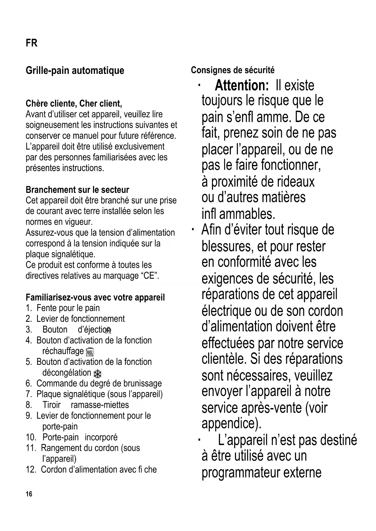 Consignes de sécurité ∙ Attention : Il existe toujours le risque que le pain s’enfl amme. De ce fait, prenez soin de ne pas placer l’appareil, ou de ne pas le faire fonctionner, à proximité de rideaux ou d’autres matières infl ammables. ∙ A fi n d’éviter tout risque de blessures, et pour rester en conformité avec les exigences de sécurité, les réparations de cet appareil électrique ou de son cordon d’alimentation doivent être effectuées par notre service clientèle. Si des réparations sont nécessaires, veuillez envoyer l’appareil à notre service après-vente (voir appendice). ∙ L’appareil n’est pas destiné à être utilisé avec un programmateur externe FR17 ou une télécommande indépendante. ∙ Débranchez toujours la fi che de la prise murale et laissez refroidir avant de nettoyer l’appareil. ∙ Pour éviter le risque de chocs électriques, ne pas nettoyer l’appareil avec du liquide et ne pas le plonger dans du liquide. ∙ Pour nettoyer le boîtier de l’appareil, il suffi t d’essuyer la surface extérieure avec un chiffon légèrement humide. ∙ Pour enlever les miettes, tirez le tiroir ramasse- miettes vers le côté et le vider. Assurez-vous de bien replacer le tiroir ramasse- miettes avant d’utiliser à nouveau l’appareil. ∙ Cet appareil est destiné à être utilisé dans des applications domestiques et analogues telles que : - des coins cuisines réservés au personnel dans des magasins, bureaux et autres environnements professionnels ; - des fermes ; - l’utilisation par les clients des hôtels, motels et autres environnements à caractère résidentiel ; - des environnements de type chambres d’hôtes. ∙ Cet appareil peut être utilisé par des enfants (à partir de 8 ans) et par des personnes souffrant de défi ciences physiques, sensorielles ou mentales, ou manquant d’expérience ou de connaissances, s’ils ont été formés à l’utilisation de l’appareil et ont été supervisés, et s’ils en comprennent les dangers18 et les précautions de sécurité à prendre. ∙ Les enfants ne sont pas autorisés à jouer avec l’appareil. ∙ Les enfants ne doivent pas être autorisés à nettoyer ou entretenir l’appareil à moins d’être supervisés et d’avoir plus de 8 ans. ∙ L’appareil et son cordon d’alimentation doivent être, à tout moment, tenus hors de portée des enfants de moins de 8 ans. ∙ Attention : Tenez les enfants à l’écart des emballages, qui représentent un risque potentiel, par exemple, de suffocation. ∙ Placez toujours l’appareil à la verticale sur une surface plane et résistante à la chaleur. ∙ Pour éviter d’endommager le boîtier, ne placez pas l’appareil sur, ou à proximité, des surfaces chaudes ou des sources de fl ammes telles plaques de cuisson ou brûleurs à gaz. ∙ Attention: Les surfaces de l’appareil deviennent très chaudes pendant l’utilisation. Danger de brûlures! ∙ Avant toute utilisation, vérifi ez soigneusement que l’appareil, son cordon d’alimentation et ses accessoires ne présentent aucun signe de détérioration qui pourrait avoir un effet néfaste sur la sécurité de fonctionnement de l’appareil. Au cas où l’appareil, par exemple, serait tombé sur une surface dure, ou si une force excessive aurait été employée pour tirer sur le cordon d’alimentation, il ne doit plus être utilisé. ∙ Ne laissez jamais l’appareil ou le cordon d’alimentation entrer en contact avec une surface chaude. ∙ Ne laissez pas pendre le cordon d’alimentation. ∙ Ne jamais faire fonctionner l’appareil sans surveillance. ∙ Ne recouvrez pas la fente à pain lorsque l’appareil est en marche. ∙ Ne pas poser les petits pains directement sur les fentes pour le pain. ∙ Attention : Pour éviter d’endommager l’appareil, ne pas essayer de faire griller les tranches de pain sur le porte-pain. ∙ N’essayez pas d’enlever le pain du grille-pain avec les doigts ou d’introduire un objet quelconque (par exemple couteau, fourchette) dans la fente prévue pour le pain. Les éléments chauffants sont sous tension. ∙ Débranchez toujours la fi che de la prise murale - après l’emploi, - en cas de fonctionnement défectueux, - avant de nettoyer l’appareil. ∙ Ne débranchez pas l’appareil en tirant sur le cordon ; tirez toujours sur la fi che. ∙ Nous déclinons toute responsabilité19 pour les dommages éventuels subis par cet appareil, résultant d’une utilisation non-conforme aux instructions contenues dans ce manuel. Utilisation correcte ∙ Cet appareil est conçu pour faire griller une tranche de pain uniquement par fente et pour faire réchauffer des petits pains sur le porte-pain. ∙ Ne pas essayer de faire griller plusieurs tranches de pain dans une seule fente ou pour faire gratiner d’autres aliments. ∙ Ne pas utiliser d’autres aliments comme une garniture ou une pâte à tartiner (par ex. beurre ou confi ture) dans ou sur cet appareil. ∙ L’usage de tout aliment autre que ceux donnés dans ce mode d’emploi doit être considéré comme inadéquat et peut occasionner des blessures corporelles ou des dommages matériels. Fonctionnement Informations générales ∙ Attention : Le levier de fonctionnement ne se bloque en bas que lorsque l’appareil est sous tension. ∙ Evitez d’utiliser des tranches trop épaisses ou trop grandes. Elles pourraient rester coincées dans le grille- pain. L’épaisseur des tranches à griller ne doit pas dépasser 14 mm. ∙ En cas de problèmes ou de mauvais fonctionnement, et avant de nettoyer l’appareil, enlevez toujours la fi che de la prise murale. ∙ Pour enlever une tranche bloquée dans la fente, utilisez une tige de bois arrondie (par exemple une poignée de brosse). Ne touchez jamais les résistances en métal. Avant la première mise en service ∙ Nettoyez le grille-pain à fond (voir Nettoyage et entretien). ∙ Mettez en marche le grille-pain sans y met