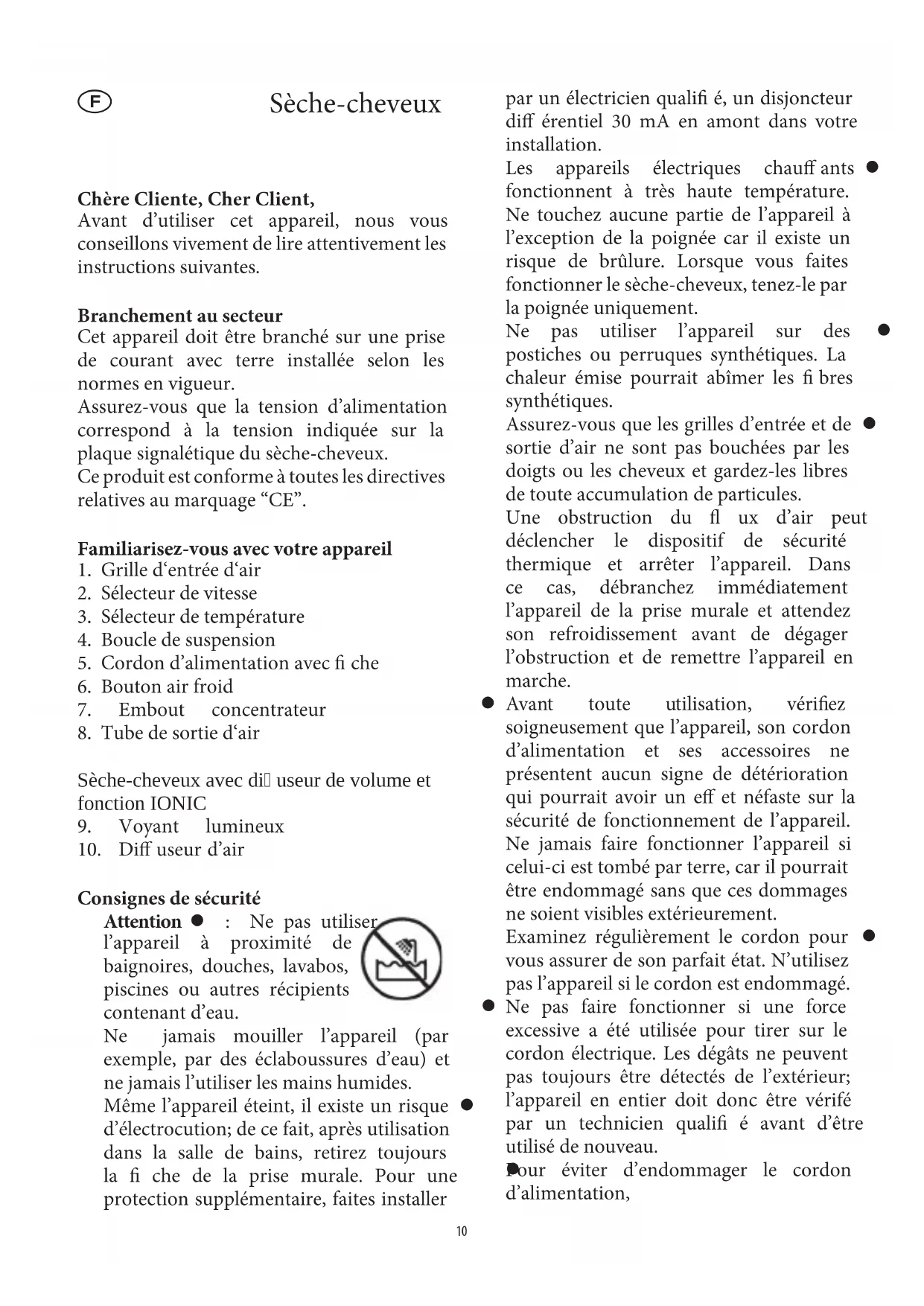 Consignes de sécurité Attention z : Ne pas utiliser l’appareil à proximité de baignoires, douches, lavabos, piscines ou autres récipients contenant d’eau. Ne jamais mouiller l’appareil (par exemple, par des éclaboussures d’eau) et ne jamais l’utiliser les mains humides. Même l’appareil éteint, il existe un risque z d’électrocution; de ce fait, après utilisation dans la salle de bains, retirez toujours la che de la prise murale. Pour une protection supplémentaire, faites installer par un électricien quali é, un disjoncteur di érentiel 30 mA en amont dans votre installation. Les appareils électriques chau ants z fonctionnent à très haute température. Ne touchez aucune partie de l’appareil à l’exception de la poignée car il existe un risque de brûlure. Lorsque vous faites fonctionner le sèche-cheveux, tenez-le par la poignée uniquement. Ne pas utiliser l’appareil sur des z postiches ou perruques synthétiques. La chaleur émise pourrait abîmer les bres synthétiques. Assurez-vous que les grilles d’entrée et de z sortie d’air ne sont pas bouchées par les doigts ou les cheveux et gardez-les libres de toute accumulation de particules. Une obstruction du ux d’air peut déclencher le dispositif de sécurité thermique et arrêter l’appareil. Dans ce cas, débranchez immédiatement l’appareil de la prise murale et attendez son refroidissement avant de dégager l’obstruction et de remettre l’appareil en marche. Avant toute utilisation, véri ez z soigneusement que l’appareil, son cordon d’alimentation et ses accessoires ne présentent aucun signe de détérioration qui pourrait avoir un e et néfaste sur la sécurité de fonctionnement de l’appareil. Ne jamais faire fonctionner l’appareil si celui-ci est tombé par terre, car il pourrait être endommagé sans que ces dommages ne soient visibles extérieurement. Examinez régulièrement le cordon pour z vous assurer de son parfait état. N’utilisez pas l’appareil si le cordon est endommagé. Ne pas faire fonctionner si une force z excessive a été utilisée pour tirer sur le cordon électrique. Les dégâts ne peuvent pas toujours être détectés de l’extérieur; l’appareil en entier doit donc être vérifé par un technicien quali é avant d’être utilisé de nouveau. Pour éviter d’endommager le cordon z d’alimentation,