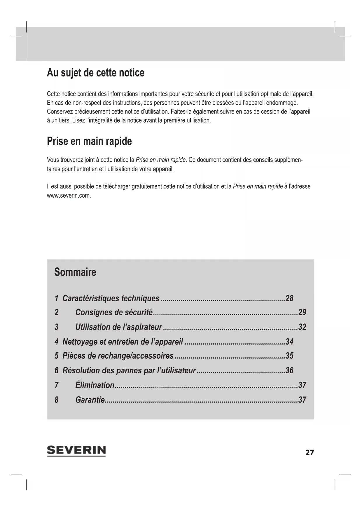 zelos Niveau sonore : 74 dB(A) Puissance absorbée : 650 W Tension/fréquence : 220 – 240 V~ ; 50/60 Hz Protection : II Longueur du cordon d’alimentation : Env. 6 m Poids : env. 4,8 kg Volume du sac à poussière : Env. 3 litres Symboles sur l’appareil : Cet appareil est conforme aux directives de l’UE, obligatoires pour le sigle CE. Ne pas jeter l’appareil avec les ordures ménagères, et l’amener à une lière de recyclage régle- mentée. Contenu de l’emballage Aspirateur Poignée avec exible Tube télescopique 1 sac à poussière dans l’appareil, 1 sac à poussière dans l’emballage Brosse commutable Brosse pour sols durs Embout long, embout pour coussins et brosse pour meubles Sachet de rangement29 consignes De sécuriTé 2 Consignes de sécurité Groupes de personnes cibles Cet appareil peut être utilisé par des enfants d’au moins 8 ans et par des personnes aux capacités physiques, sensorielles ou mentales réduites ou disposant de peu d’expérience et/ou de connaissances. Toutes ces personnes doivent cependant avoir été sensibilisées à l’emploi de cet appareil en toute sécurité et aux dangers qui y sont liés. Il est interdit aux enfants de jouer avec l’appareil, ainsi que de monter ou de s’asseoir dessus. Le nettoyage et l’entretien par l’usager ne doivent pas être effectués par des enfants, sans surveillance Les enfants de moins de 8 ans ne doivent pas s’approcher de l’appareil, ni du cordon d’alimentation. Ne pas jouer avec le matériel d’emballage. Il existe un risque d’asphyxie. Alimentation électrique L’appareil est alimenté par du courant électrique, ce qui implique par principe un risque d’électrocution. Par conséquent : Respecter les indications gurant sur la plaque signalétique (placée sous l’appareil) pour le branchement et la mise en service. Avant l’usage, contrôler que l’appareil et le cordon d’alimentation ne sont pas endommagés. Ne jamais mettre en marche un appareil défectueux ou dont le cordon d’alimentation est défectueux.30 consignes De sécuriTé Ne jamais essayer de réparer soi-même l’appareil ou le cordon d’alimenta- tion. Pour éviter tout risque, les réparations de l’appareil et du cordon d’alimen- tation doivent être effectuées exclusivement par notre SAV. Amener l’appareil défectueux dans un magasin spécialisé ou contacter le SAV de SEVERIN (coordonnées dans l’annexe de cette notice ou à l’adresse www.severin.de). Ne jamais immerger l’appareil dans l’eau ou dans d’autres liquides, ni effectuer un traitement avec des liquides. Ne pas utiliser l’appareil en plein air, ni dans des pièces très humides. Ne pas toucher la che de secteur avec les mains humides. Faire attention à ce que le cordon d’alimentation ne soit pas plié, coincé, ou écrasé. Empêcher tout contact avec des sources de chaleur, de l’humidité ou des objets coupants. Faire attention à ne pas laisser le cordon d’alimentation dans le passage pour éviter tout risque de trébucher. Ne pas tirer l’appareil par le cordon d’alimentation, et ne pas le transporter en le tenant par le cordon. Pour débrancher la che de secteur de la prise, toujours tirer directement la che. Ne pas utiliser de rallonge. Si cela est indispensable, n’utiliser que des rallonges simples (sans multiprise), homologuées GS, adaptées à la puissance de l’appareil. Éteindre et débrancher l’appareil de la prise de courant avant toute opéra- tion de nettoyage, d’entretien ou tout changement de pièce.31 consignes De sécuriTé Utilisation conforme à la destination L’utilisation de cet appareil n’est autorisée que pour un usage domestique. L’as- pirateur doit être passé exclusivement sur des sols secs, normalement sales, ou sur des coussins et des meubles en utilisant les accessoires adaptés. Toute autre utilisation est considérée comme non conforme, et est interdite. Pour éviter tout risque de blessure, de feu et de dégâts matériels, l’appa- reil ne doit pas être utilisé pour nettoyer les éléments suivants : Personnes, animaux et plantes. Tenir en permanence les embouts et les ouvertures d’aspiration éloignés de toute partie du corps, ainsi que des cheveux et des vêtements. Ne pas utiliser l’appareil à proximité du visage de personnes. Particules incandescentes, non éteintes (p. ex. : cendres, braises, charbon de bois, cigarettes, allumettes). Matières explosives ou facilement inammables, toner. Eau et autres liquides, p. ex. produits de nettoyage humides pour tapis et moquettes. Objets pointus tels que du verre cassé, des clous ou des gravats. Si l’appareil est défectueux Amener l’appareil défectueux dans un magasin spécialisé ou au SAV (coordonnées dans l’annexe de cette notice ou à www.severin.de).32 uTilisaTion De l’asPiraTeur 3 Utilisation de l’aspirateur Montage ou changement d’accessoire N’installer d’accessoires que lorsque l’appareil est débranché. Installer exclusivement des embouts en parfait état. Des embouts endommagés peuvent rayer les surfaces. Pour d’autres conseils relatifs au montage, voir Prise en main rapide Montage. Pendant l’utilisation de l’aspirateur Pour passer l’aspirateur dans les escaliers, faire attention à toujours se trouver au-dessus de l’aspirateur. Dans le cas contraire, l’appareil pourrait provoquer des blessures en cas de chute. N’utiliser l’appareil qu’équipé d’un ltre et d’un sac à poussière. Respecter les conseils donnés par les fabricants pour l’entretien et le nettoyage des revêtements de sol, des tapis, des moquettes et des meubles ! Ne tirer sur le cordon d’alimentation que jusqu’à la marque jaune. Si la marque bleue est visible, rentrer à nouveau le cordon à l’aide du bouton de l’enrouleur jusqu’à la marque jaune. Le cordon d’alimentation risque sinon d’être trop sollicité et de s’abîmer. Le voyant du régulateur de puissance s’all