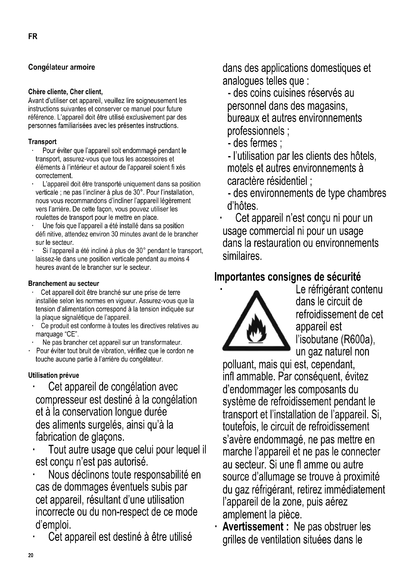 - In accordance with EU directive 1062/2010 Annexe III ** The actual consumption depends on the pattern of use and the location of the appliance20 Congélateur armoire Chère cliente, Cher client, Avant d’utiliser cet appareil, veuillez lire soigneusement les instructions suivantes et conserver ce manuel pour future référence. L’appareil doit être utilisé exclusivement par des personnes familiarisées avec les présentes instructions. Transport ∙ Pour éviter que l’appareil soit endommagé pendant le transport, assurez-vous que tous les accessoires et éléments à l’intérieur et autour de l’appareil soient fi xés correctement. ∙ L’appareil doit être transporté uniquement dans sa position verticale ; ne pas l’incliner à plus de 30°. Pour l’installation, nous vous recommandons d’incliner l’appareil légèrement vers l’arrière. De cette façon, vous pouvez utiliser les roulettes de transport pour le mettre en place. ∙ Une fois que l’appareil a été installé dans sa position défi nitive, attendez environ 30 minutes avant de le brancher sur le secteur. ∙ Si l’appareil a été incliné à plus de 30° pendant le transport, laissez-le dans une position verticale pendant au moins 4 heures avant de le brancher sur le secteur. Branchement au secteur ∙ Cet appareil doit être branché sur une prise de terre installée selon les normes en vigueur. Assurez-vous que la tension d’alimentation correspond à la tension indiquée sur la plaque signalétique de l’appareil. ∙ Ce produit est conforme à toutes les directives relatives au marquage “CE”. ∙ Ne pas brancher cet appareil sur un transformateur. ∙ Pour éviter tout bruit de vibration, vérifi ez que le cordon ne touche aucune partie à l’arrière du congélateur. Utilisation prévue ∙ Cet appareil de congélation avec compresseur est destiné à la congélation et à la conservation longue durée des aliments surgelés, ainsi qu’à la fabrication de glaçons. ∙ Tout autre usage que celui pour lequel il est conçu n’est pas autorisé. ∙ Nous déclinons toute responsabilité en cas de dommages éventuels subis par cet appareil, résultant d’une utilisation incorrecte ou du non-respect de ce mode d’emploi. ∙ Cet appareil est destiné à être utilisé dans des applications domestiques et analogues telles que : - des coins cuisines réservés au personnel dans des magasins, bureaux et autres environnements professionnels ; - des fermes ; - l’utilisation par les clients des hôtels, motels et autres environnements à caractère résidentiel ; - des environnements de type chambres d’hôtes. ∙ Cet appareil n’est conçu ni pour un usage commercial ni pour un usage dans la restauration ou environnements similaires. Importantes consignes de sécurité
