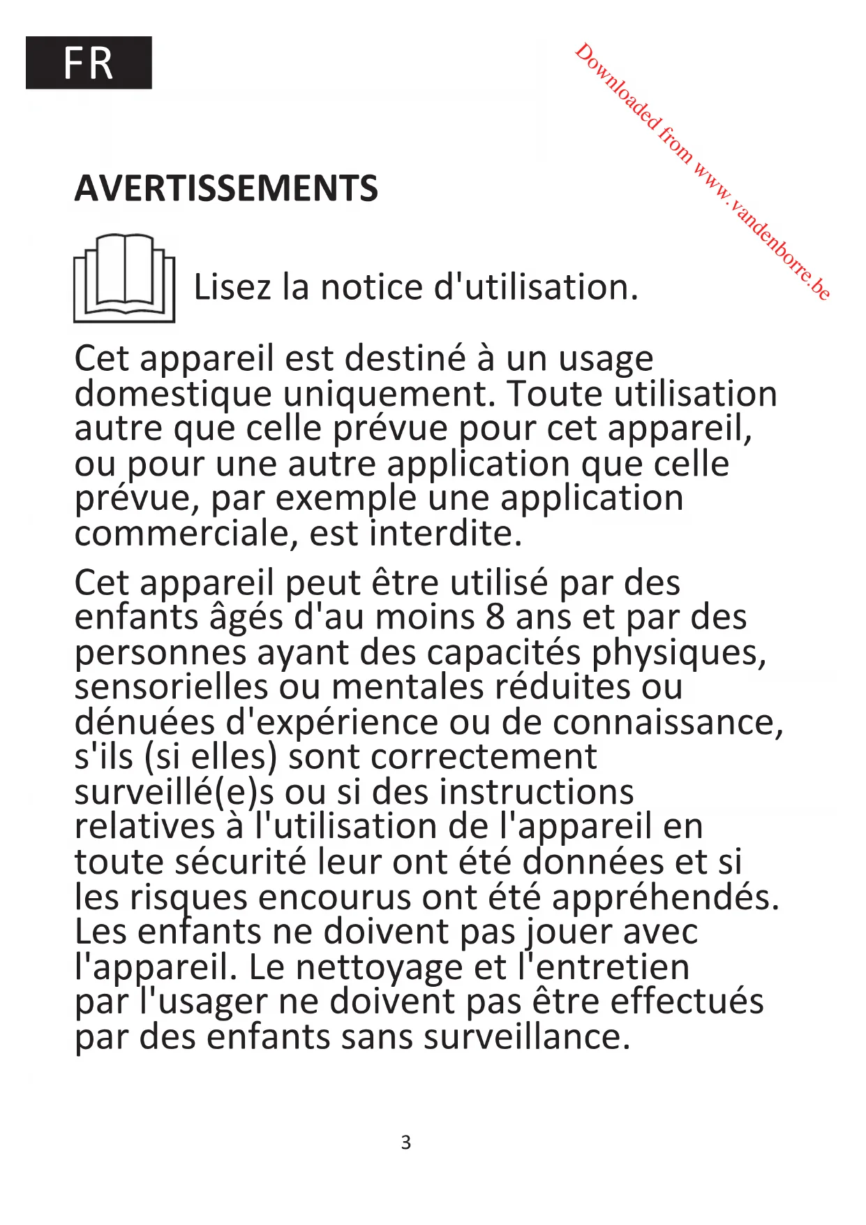 Downloaded from www.vandenborre.beFR AVERTISSEMENTS Lisez la notice d'utilisation. Cet appareil est destiné à un usage domestique uniquement. Toute utilisation autre que celle prévue pour cet appareil, ou pour une autre application que celle prévue, par exemple une application commerciale, est interdite. Cet appareil peut être utilisé par des enfants âgés d'au moins 8 ans et par des personnes ayant des capacités physiques, sensorielles ou mentales réduites ou dénuées d'expérience ou de connaissance, s'ils (si elles) sont correctement surveillé(e)s ou si des instructions relatives à l'utilisation de l'appareil en toute sécurité leur ont été données et si les risques encourus ont été appréhendés. Les enfants ne doivent pas jouer avec l'appareil. Le nettoyage et l'entretien par l'usager ne doivent pas être effectués par des enfants sans surveillance.