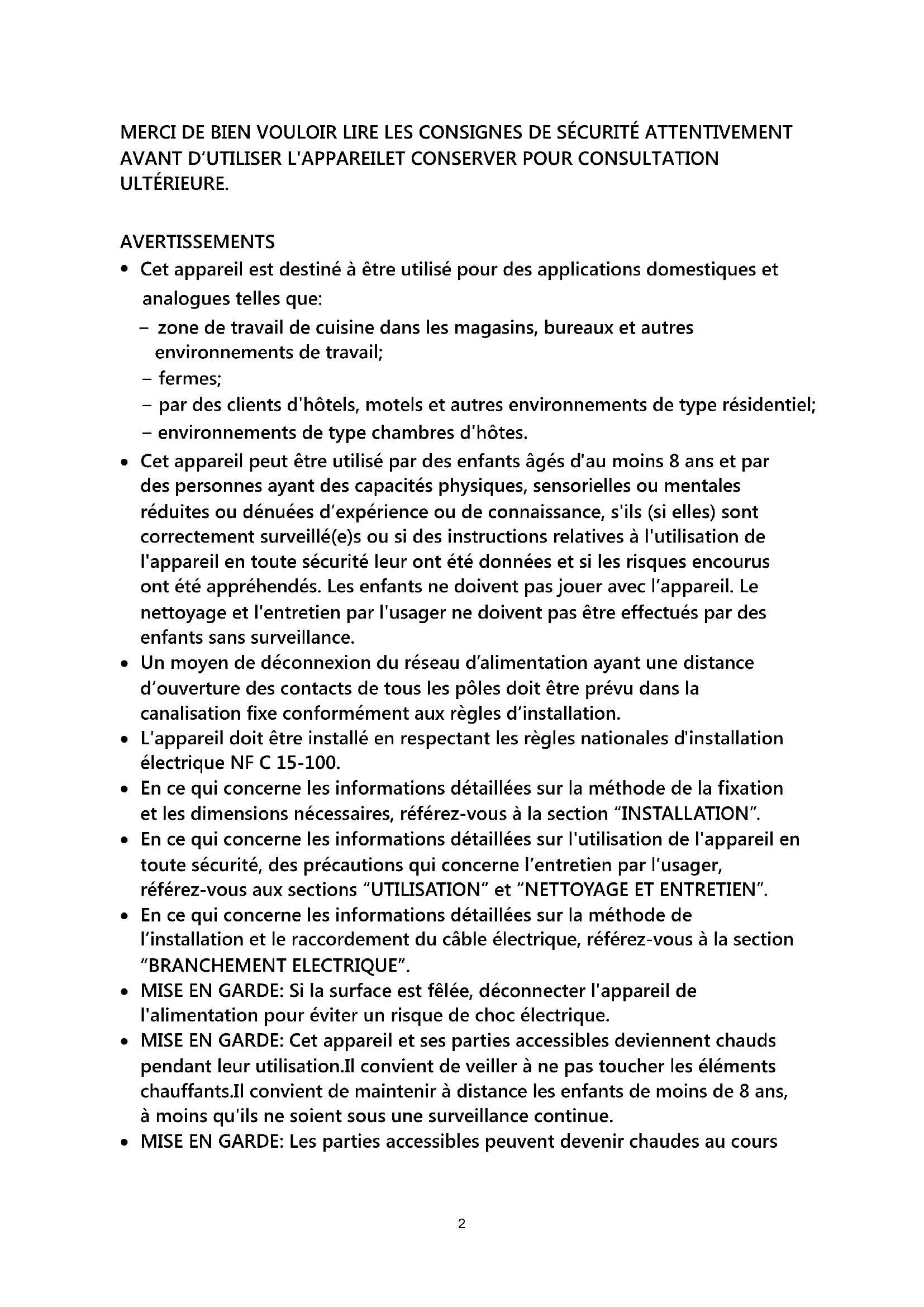 - L'appareil doit être installé en respectant les règles nationales d'installation électrique NF C 15-100.