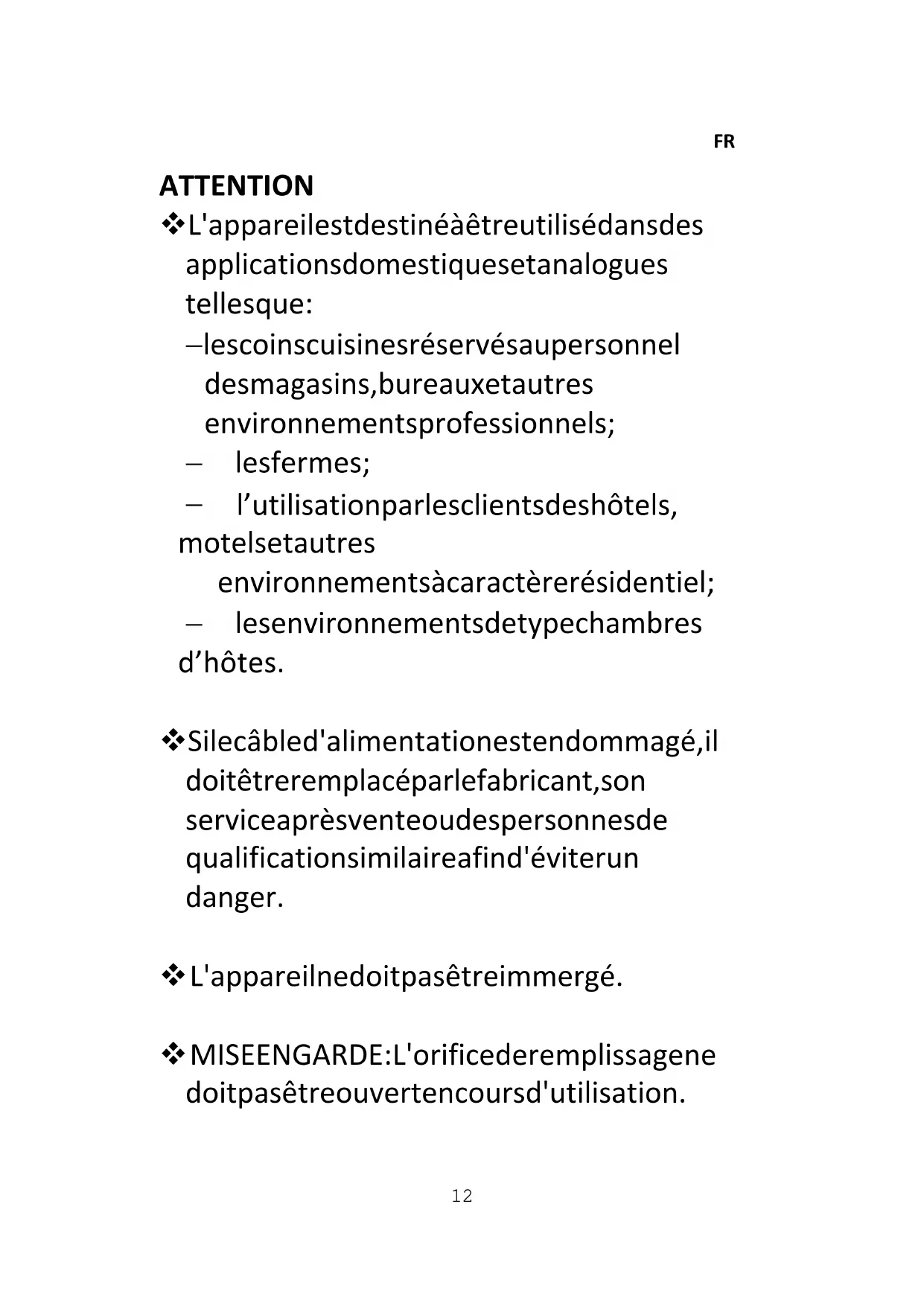 l’utilisation par les clients des hôtels, motels et autres environnements à caractère résidentiel; les environnements de type chambres d’hôtes. Si le câble d'alimentation est endommagé, il doit être remplacé par le fabricant, son service après vente ou des personnes de qualification similaire afin d'éviter un danger.