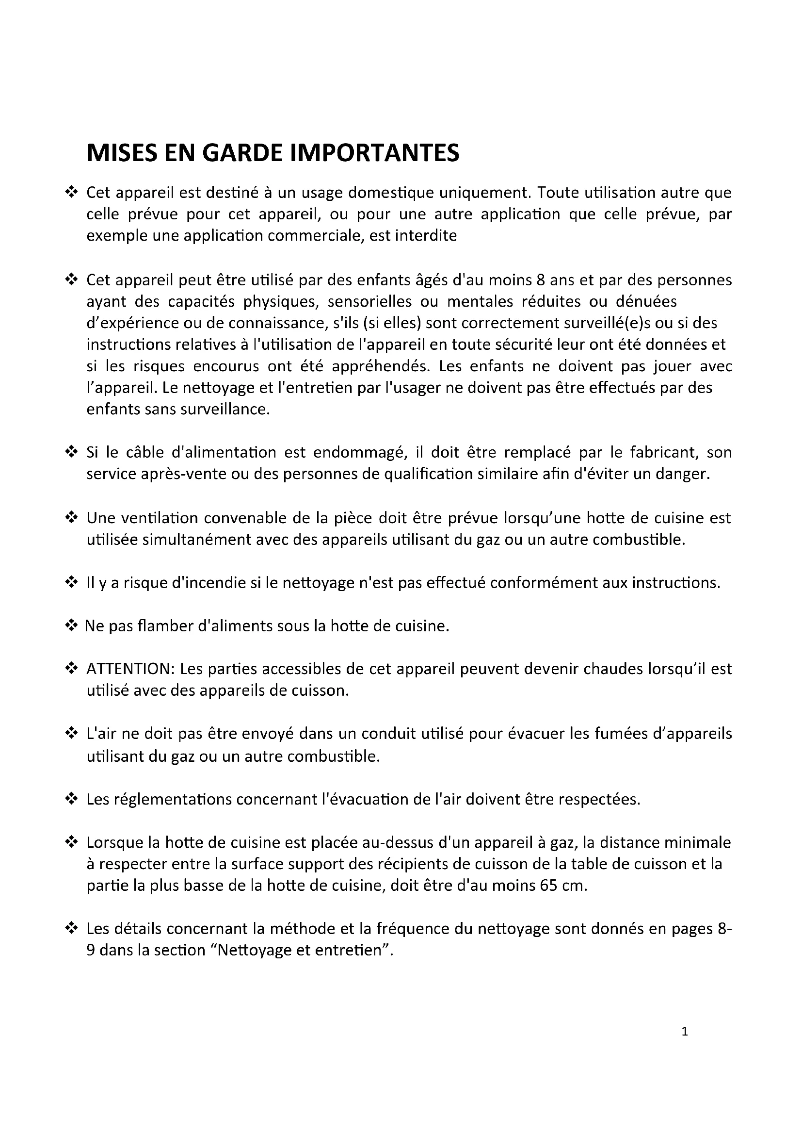 Cet appareil est destiné à un usage domestique uniquement. Toute utilisation autre que celle prévue pour cet appareil, ou pour une autre application que celle prévue, par exemple une application commerciale, est interdite Cet appareil peut être utilisé par des enfants âgés d'au moins 8 ans et par des personnes ayant des capacités physiques, sensorielles ou mentales réduites ou dénuées d’expérience ou de connaissance, s'ils (si elles) sont correctement surveillé(e)s ou si des instructions relatives à l'utilisation de l'appareil en toute sécurité leur ont été données et si les risques encourus ont été appréhendés. Les enfants ne doivent pas jouer avec l’appareil. Le nettoyage et l'entretien par l'usager ne doivent pas être effectués par des enfants sans surveillance. Si le câble d'alimentation est endommagé, il doit être remplacé par le fabricant, son service après-vente ou des personnes de qualification similaire afin d'éviter un danger. Une ventilation convenable de la pièce doit être prévue lorsqu’une hotte de cuisine est utilisée simultanément avec des appareils utilisant du gaz ou un autre combustible. Il y a risque d'incendie si le nettoyage n'est pas effectué conformément aux instructions. Ne pas flamber d'aliments sous la hotte de cuisine. ATTENTION: Les parties accessibles de cet appareil peuvent devenir chaudes lorsqu’il est utilisé avec des appareils de cuisson. L'air ne doit pas être envoyé dans un conduit utilisé pour évacuer les fumées d’appareils utilisant du gaz ou un autre combustible. Les réglementations concernant l'évacuation de l'air doivent être respectées. Lorsque la hotte de cuisine est placée au-dessus d'un appareil à gaz, la distance minimale à respecter entre la surface support des récipients de cuisson de la table de cuisson et la partie la plus basse de la hotte de cuisine, doit être d'au moins 65 cm. Les détails concernant la méthode et la fréquence du nettoyage sont donnés en pages 8- 9 dans la section “Nettoyage et entretien”.2