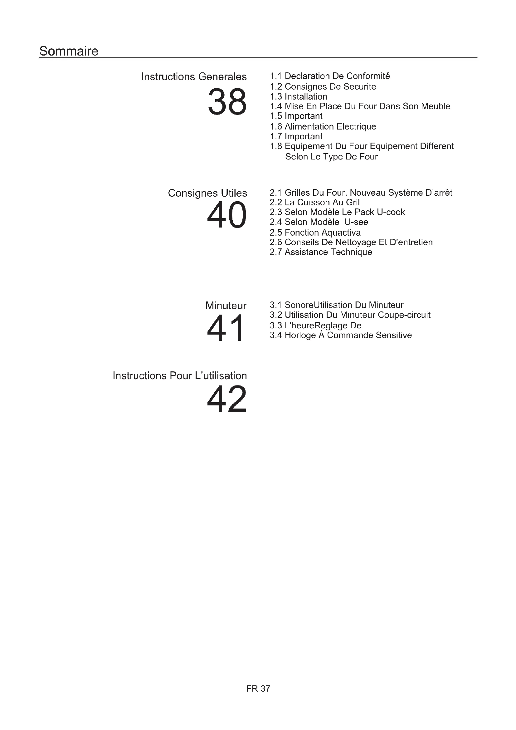— Lire attentivement les instructions contenues dans cette brochure, elles fournissent d’importantes indications sur la sécurité d’installation, l’emploi du four et son entretien. — Conserver soigneusement cette notice d’utilisation pour toutes consultations ultérieures. —Après avoir déballé votre four, vérifier que l’appareil est complet. — Les emballages comme le plastique, le polystyrène, peuvent constituer un danger pour les enfants. Ne pas les laisser à leur portée. ATTENTION Lors de la première utilisation du four, il peut se produire un dégagement de fumée âcre provoqué par le premier échauffement du collant des panneaux d’isolation enveloppant le four. Ce phénomène est normal.Attendez que la fumée cesse avant de cuire des aliments. Lorsque le four est en fonctionnement, la porte en verre est particulièrement chaude. ll est donc nécessaire que les enfants ne la touchent pas. ATTENTION: La tension et la fréquence d’alimentation sont indiquées sur la plaque signalétique (illustration dernière page). Faites appel à un professionnel pour l’installation de votre four.1.5 IMPORTANT Le meuble qui va supporter le four doit avoir des caractéristiquesappropriés. Les panneaux du meuble doivent pouvoir résister à lachaleur.Dans le cas de meubles en bois plaqué, les colles doivent résister à unetempérature de 120°C sinon il y a un risque de décollement ou dedéformations. Conformément aux normes de sécurité, une foisencastré, aucun contact ne doit être possible avec les partiesélectriques.Toutes les parties qui assurent la protection doivent être fixées de façonà ne pas pouvoir être enlevées sans outil. Pour garantir une bonneaération, retirer la paroi arrière du meuble.