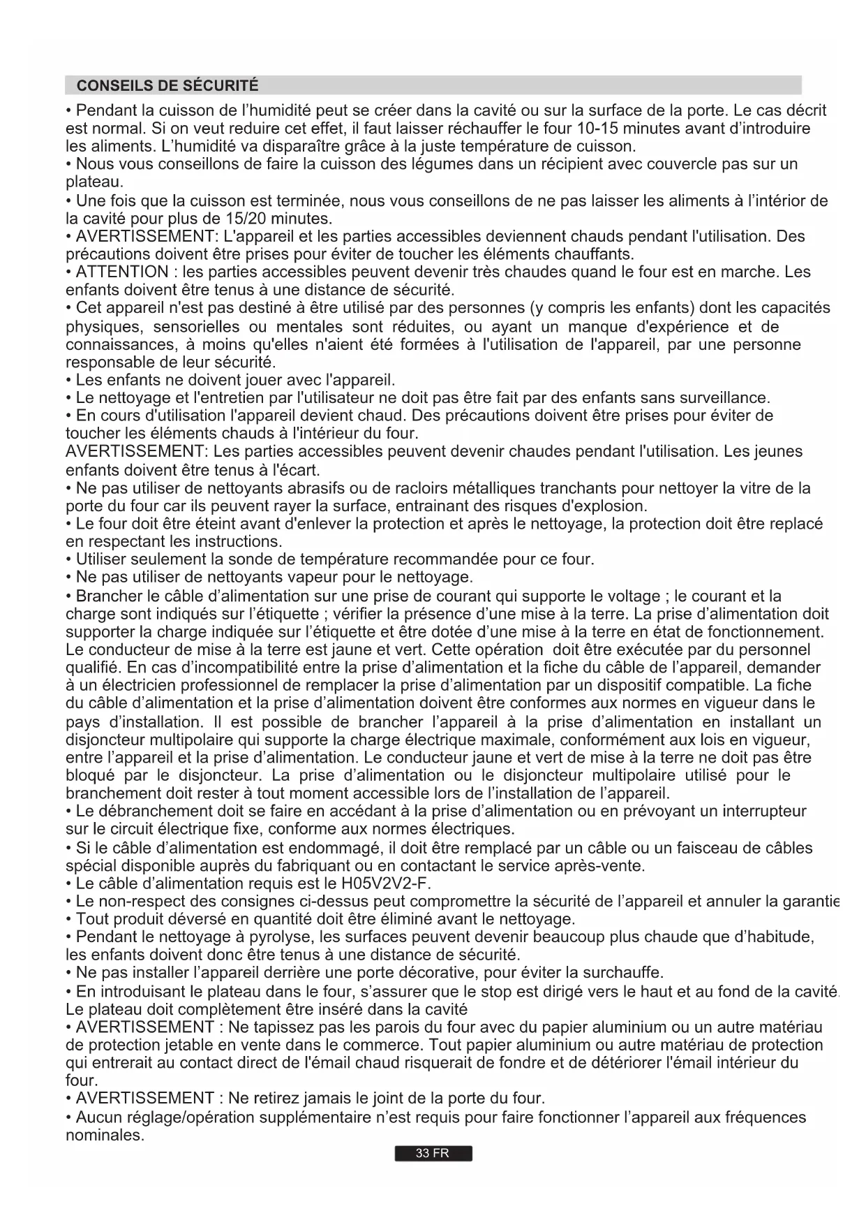 - L’emploi d’un appareil électrique nécessite quelques règles de sécurité. - Ne pas tirer sur le fil électrique pour débrancher la prise. - Ne pas toucher l’appareil avec les pieds ou les mains mouillés. - Evitez d’utiliser l’appareil pieds nus. L’utilisation de multiprises et de rallonges pour raccorder votre appareil est fortement déconseillé. En cas de panne ou de mauvais fonctionnement il faut éteindre le four avant de le démonter. En cas de détérioration du fil électrique, remplacez-le rapidement en suivant les indications suivantes: ôtez le fil d’alimentation électrique et remplacez-le par un (du type H05VV-F) adapté à la puissance de l’appareil.Vous veillerez à ce que cette opération soit effectuée par un centre technique agréé. Pour l’utilisateur c’est la certitude d’obtenir des pièces de rechange d’origine. Le non-respect de ces règles peut compromettre la sécurité de l’appareil.