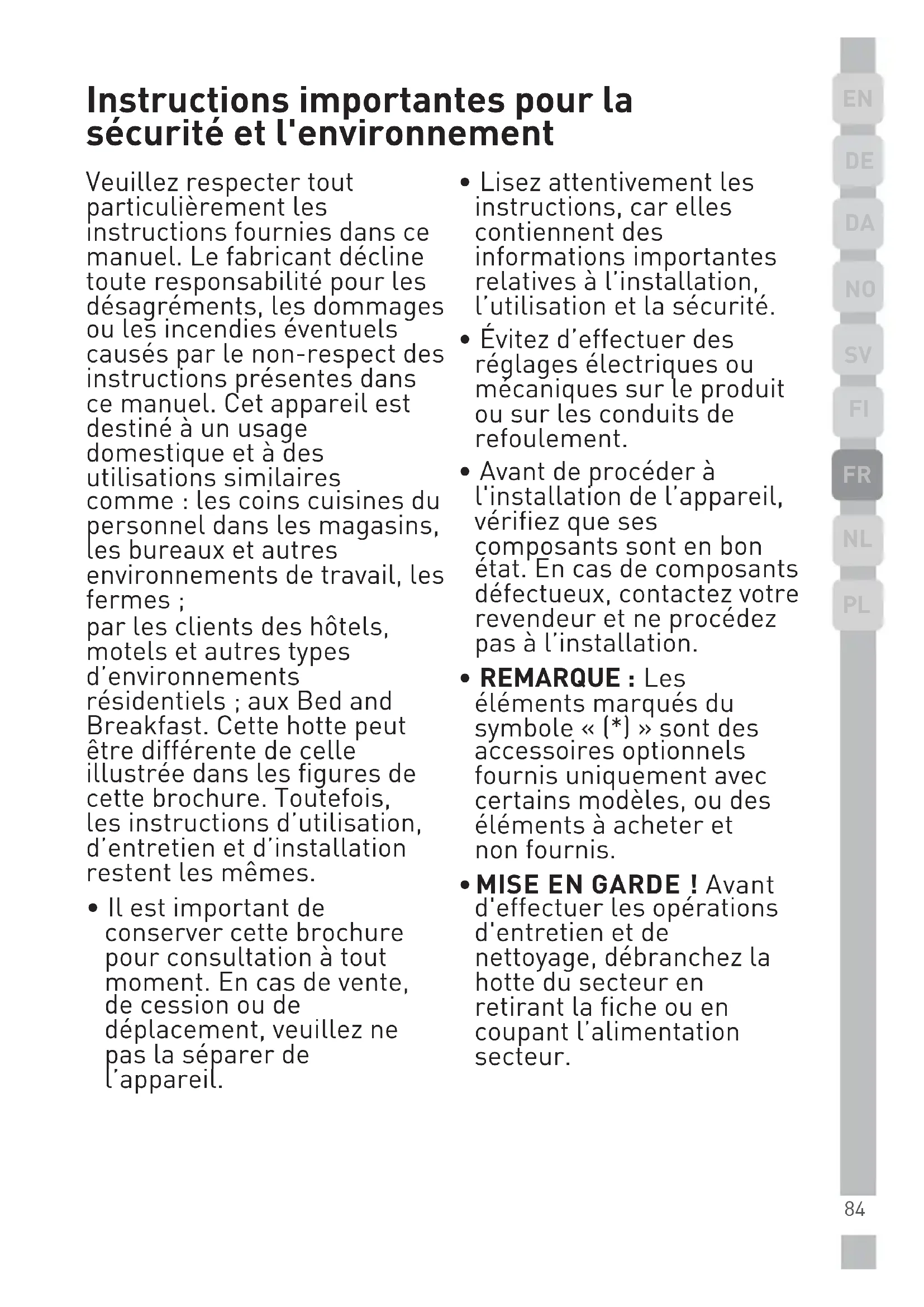 PL84 Instructions importantes pour la sécurité et l'environnement Veuillez respecter tout particulièrement les instructions fournies dans ce manuel. Le fabricant décline toute responsabilité pour les désagréments, les dommages ou les incendies éventuels causés par le non-respect des instructions présentes dans ce manuel. Cet appareil est destiné à un usage domestique et à des utilisations similaires comme : les coins cuisines du personnel dans les magasins, les bureaux et autres environnements de travail, les fermes ; par les clients des hôtels, motels et autres types d’environnements résidentiels ; aux Bed and Breakfast. Cette hotte peut être différente de celle illustrée dans les figures de cette brochure. Toutefois, les instructions d’utilisation, d’entretien et d’installation restent les mêmes.