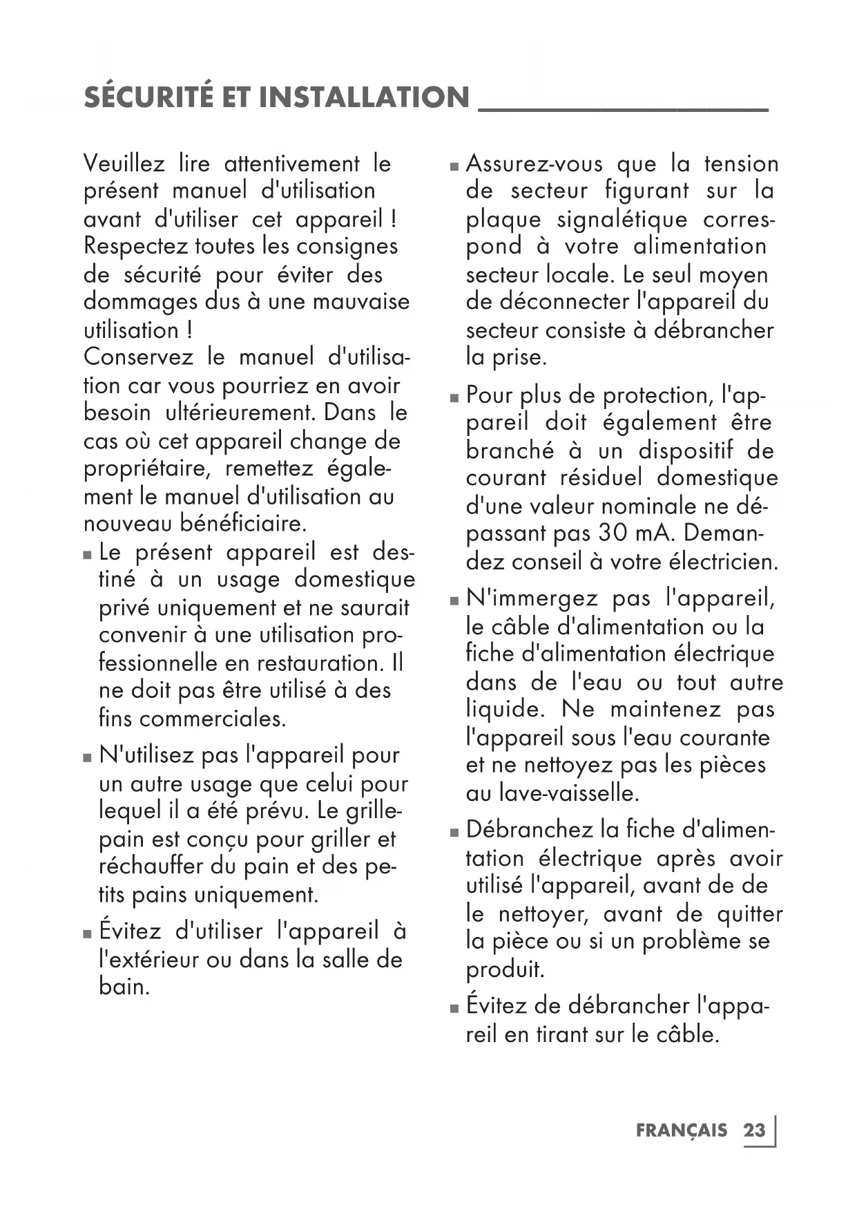 N'utilisez pas l'appareil pour un autre usage que celui pour lequel il a été prévu. Le grille- pain est conçu pour griller et réchauffer du pain et des pe- tits pains uniquement.