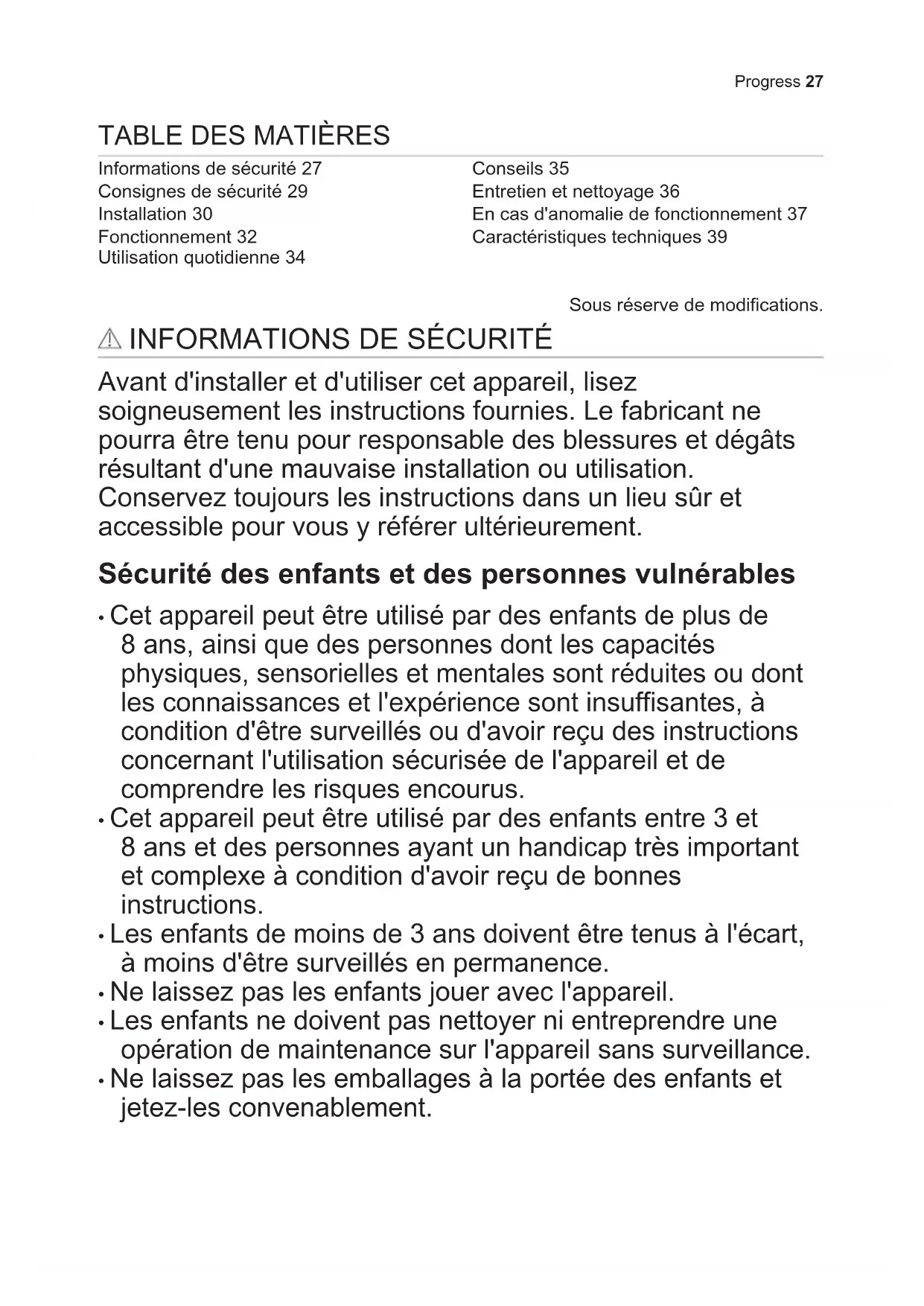 Informations de sécurité 27 Consignes de sécurité 29 Installation 30 Fonctionnement 32 Utilisation quotidienne 34