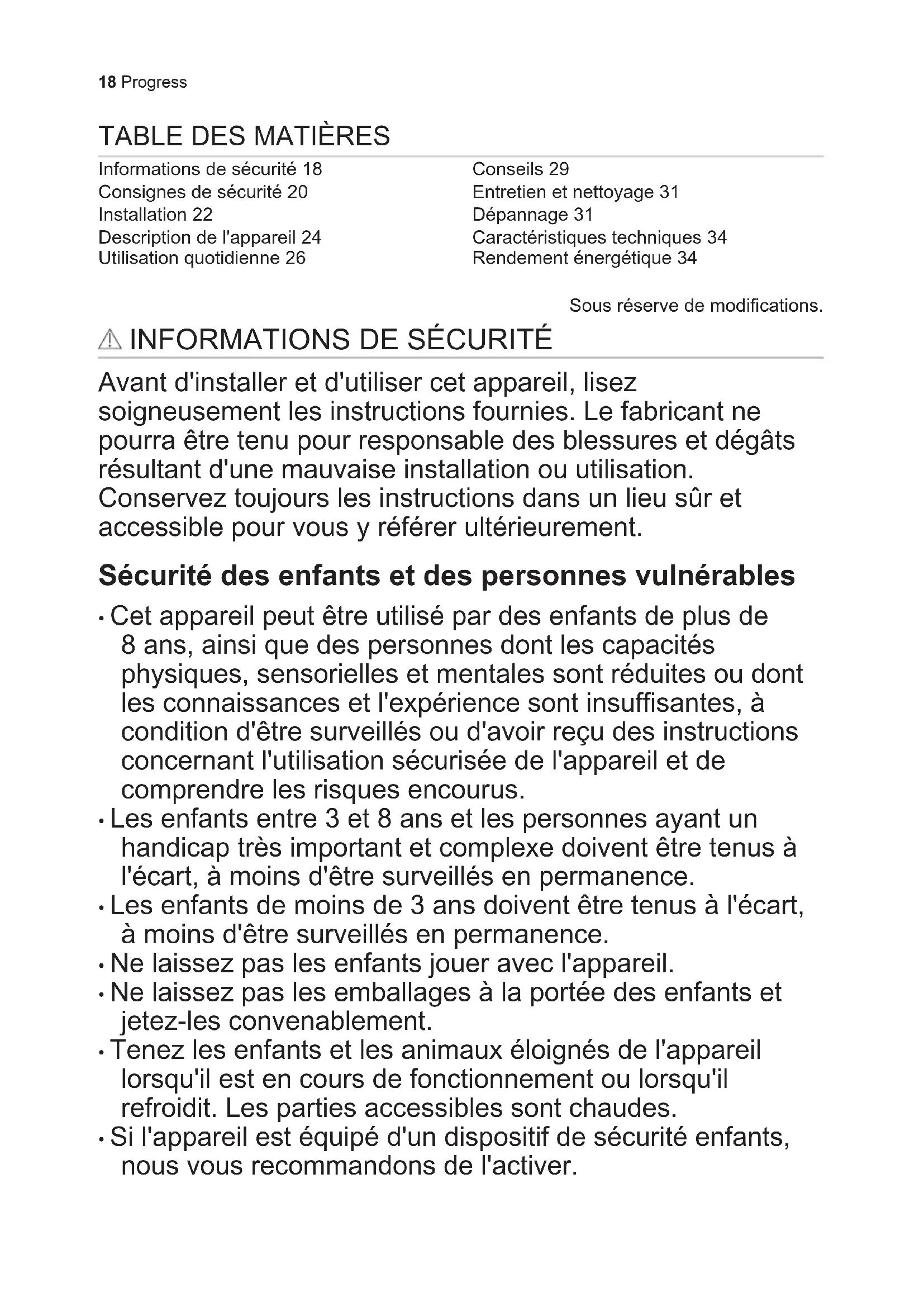 - Si l'appareil est équipé d'un dispositif de sécurité enfants, nous vous recommandons de l'activer. 18 Progress• Les enfants ne doivent pas nettoyer ni entreprendre une opération de maintenance sur l'appareil sans surveillance. Sécurité générale