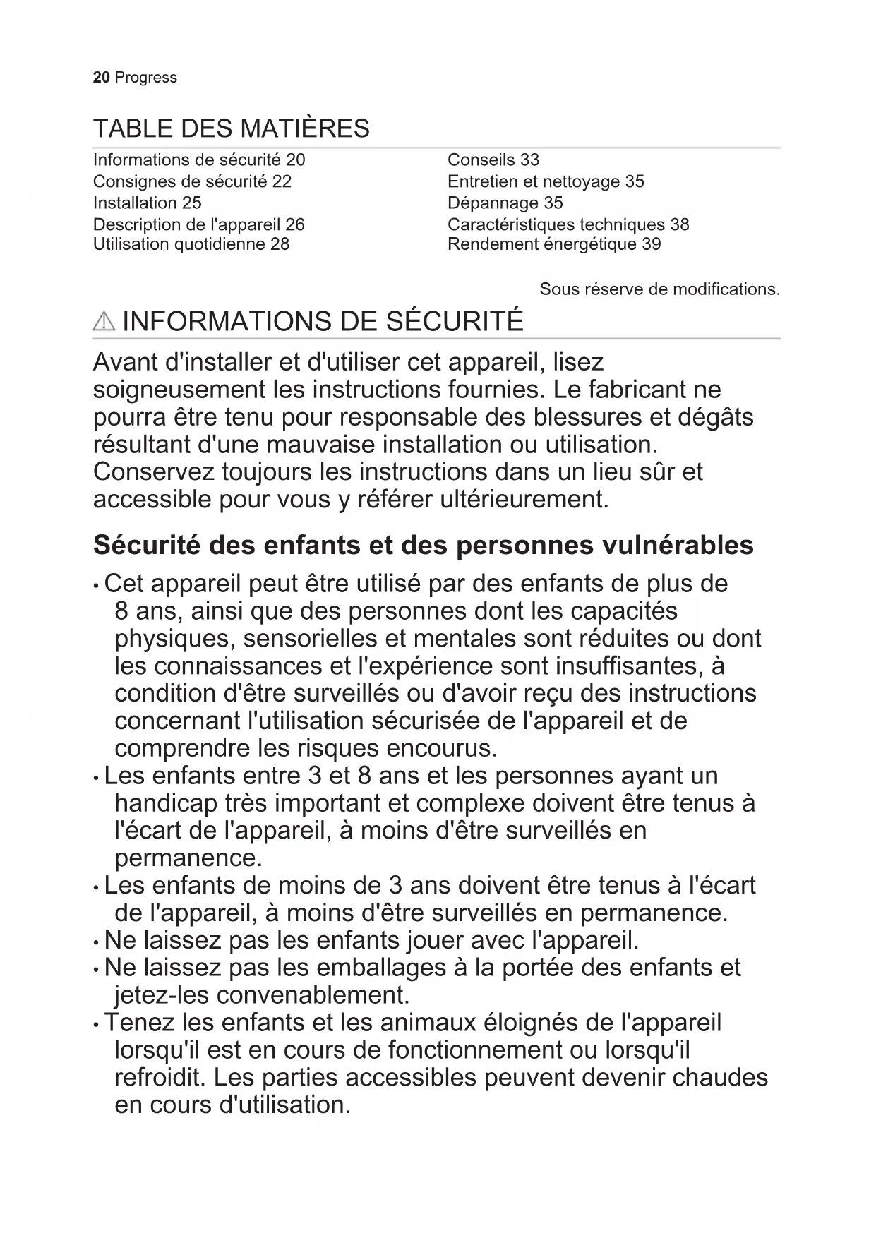 - Tenez les enfants et les animaux éloignés de l'appareil lorsqu'il est en cours de fonctionnement ou lorsqu'il refroidit. Les parties accessibles peuvent devenir chaudes en cours d'utilisation. 20 Progress• Si l'appareil est équipé d'un dispositif de sécurité enfants, nous vous recommandons de l'activer.