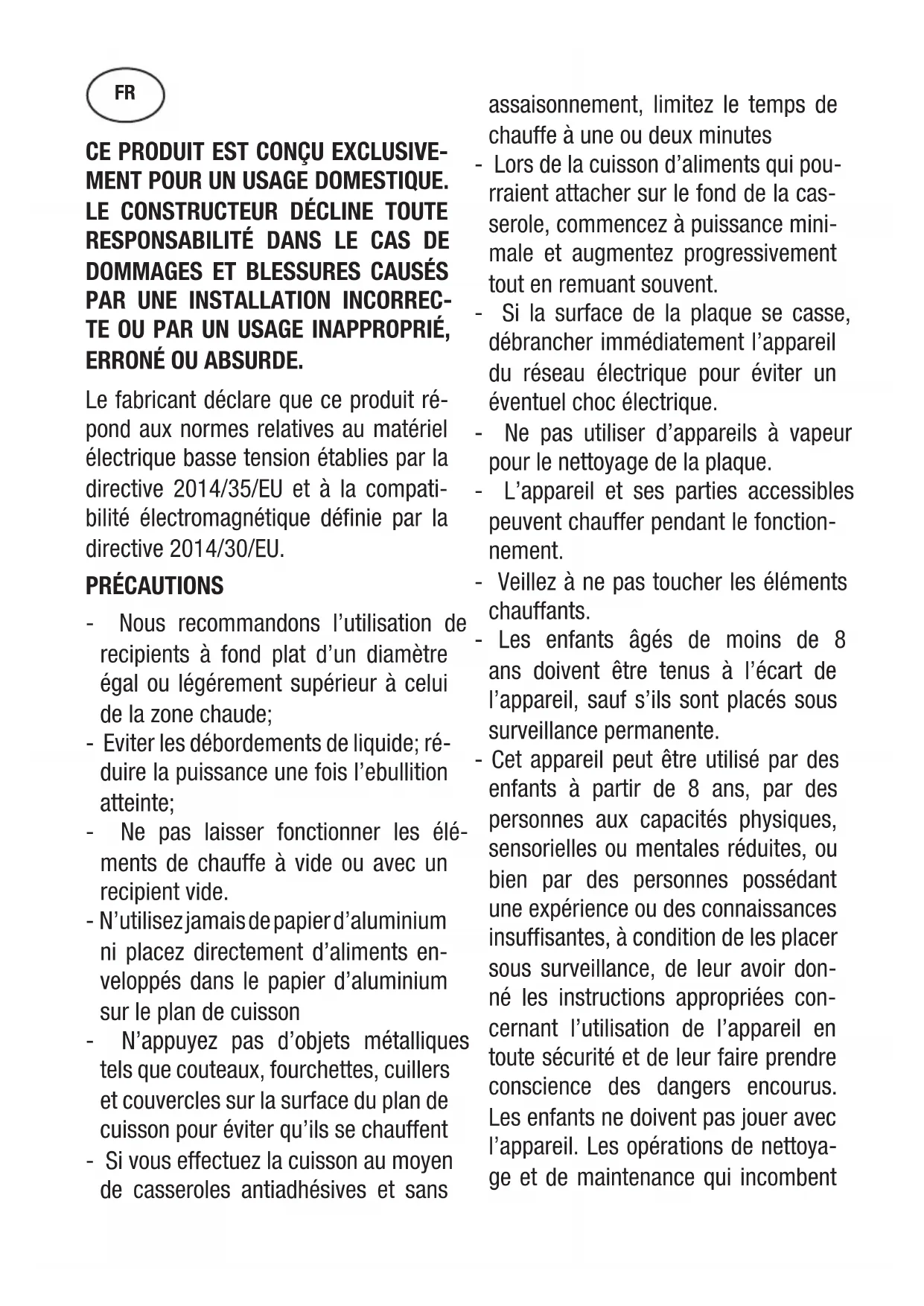 TE OU PAR UN USAGE INAPPROPRIÉ, ERRONÉ OU ABSURDE. Le fabricant déclare que ce produit ré- pond aux normes relatives au matériel électrique basse tension établies par la directive 2014/35/EU et à la compati- bilité électromagnétique définie par la directive 2014/30/EU. PRÉCAUTIONS - Nous recommandons l’utilisation de recipients à fond plat d’un diamètre égal ou légérement supérieur à celui de la zone chaude; - Eviter les débordements de liquide; ré- duire la puissance une fois l’ebullition atteinte; - Ne pas laisser fonctionner les élé- ments de chauffe à vide ou avec un recipient vide. - N’utilisez jamais de papier d’aluminium ni placez directement d’aliments en- veloppés dans le papier d’aluminium sur le plan de cuisson - N’appuyez pas d’objets métalliques tels que couteaux, fourchettes, cuillers et couvercles sur la surface du plan de cuisson pour éviter qu’ils se chauffent - Si vous effectuez la cuisson au moyen de casseroles antiadhésives et sans assaisonnement, limitez le temps de chauffe à une ou deux minutes - Lors de la cuisson d’aliments qui pou- rraient attacher sur le fond de la cas- serole, commencez à puissance mini- male et augmentez progressivement tout en remuant souvent. - Si la surface de la plaque se casse, débrancher immédiatement l’appareil du réseau électrique pour éviter un éventuel choc électrique. - Ne pas utiliser d’appareils à vapeur pour le nettoyage de la plaque. - L’appareil et ses parties accessibles peuvent chauffer pendant le fonction- nement. - Veillez à ne pas toucher les éléments chauffants. - Les enfants âgés de moins de 8 ans doivent être tenus à l’écart de l’appareil, sauf s’ils sont placés sous surveillance permanente. - Cet appareil peut être utilisé par des enfants à partir de 8 ans, par des personnes aux capacités physiques, sensorielles ou mentales réduites, ou bien par des personnes possédant une expérience ou des connaissances insuffisantes, à condition de les placer sous surveillance, de leur avoir don- né les instructions appropriées con- cernant l’utilisation de l’appareil en toute sécurité et de leur faire prendre conscience des dangers encourus. Les enfants ne doivent pas jouer avec l’appareil. Les opérations de nettoya- ge et de maintenance qui incombent FRà l’utilisateur ne doivent pas être réa- lisées par des enfants non surveillés. - Cuisiner avec de la graisse ou de l’huile sans surveillance présente un risque d’incendie. Ne tentez JAMAIS d’éteindre un feu avec de l’eau. En cas d’incendie, débranchez l’appareil et couvrez les flammes avec le cou- vercle d’une casserole ou un drap, par exemple. - Le processus de cuisson doit être effectué sous surveillance. Un proces- sus de cuisson à court terme doit être surveillé continuellement. - Cuisson sans surveillance sur une pla- que chauffante avec de la graisse ou de l’huile peut être dangereux et peut causer un incendie. - Risque d’incendie : ne stockez pas d’éléments sur la surface de cuisson. - N’utiliser que des protecteurs de pla- que de cuisson conçus par le fabri- cant de l’appareil de cuisson, indiqués par le fabricant dans les consignes d’utilisation ou intégrés à l’appareil. L’utilisation de protecteurs non adap- tés peut être à l’origine d’accidents. Installer dans le câblage fixe un disposi- tif de déconnexion du réseau électrique avec une séparation de contact sur tous les pôles qui permette une déconnexion totale dans des conditions de surten- sion de catégorie III, conformément à la norme de câblage. La prise ou l’interrupteur omnipolai- re doivent être facilement accessibles après la mise en place de l’appareil. Cet appareil n’est pas prévu pour fonctionner à l’aide d’un tem- porisateur externe ou d’un sys- tème de commande à distance indépendant. Le Constructeur décline toute responsa- bilité au cas où ces normes et les autre normes contre les accidents ne seraient pas observées. Sile cable d’alimentation s’abîme, de- mandez à votre servi ce d’assistance technique agrée, au fabricant ou bien à un technicien compétent de vous le changer, afin d’éviter un risque quel- conque. Instructions pour l’usager Installation Toutes les opérations relatives à l’installation (raccordement électrique) doivent être faites par un personnel qualifié, en conformité avec les normes en vigueur. En ce qui concerne les instructions spécifiques voir la partie réservée à l’installateur. Emploi