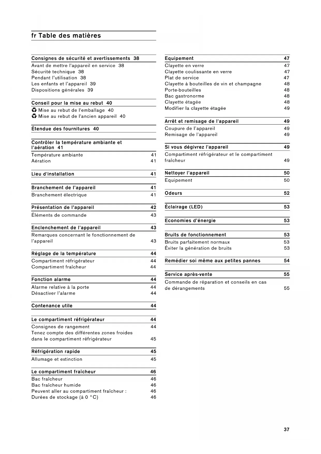| L'appareil ne refroidit pas.L'éclairage ne fonctionne pas.Affichage éteint. | L'appareil est éteint. | Appuyez sur la touche Marche / Arrêt ➊ . |