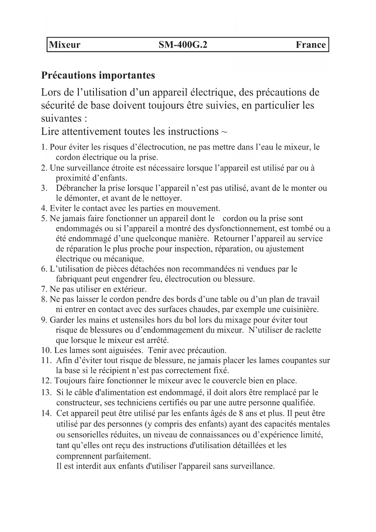 1. Pour éviter les risques d’électrocution, ne pas mettre dans l’eau le mixeur, le