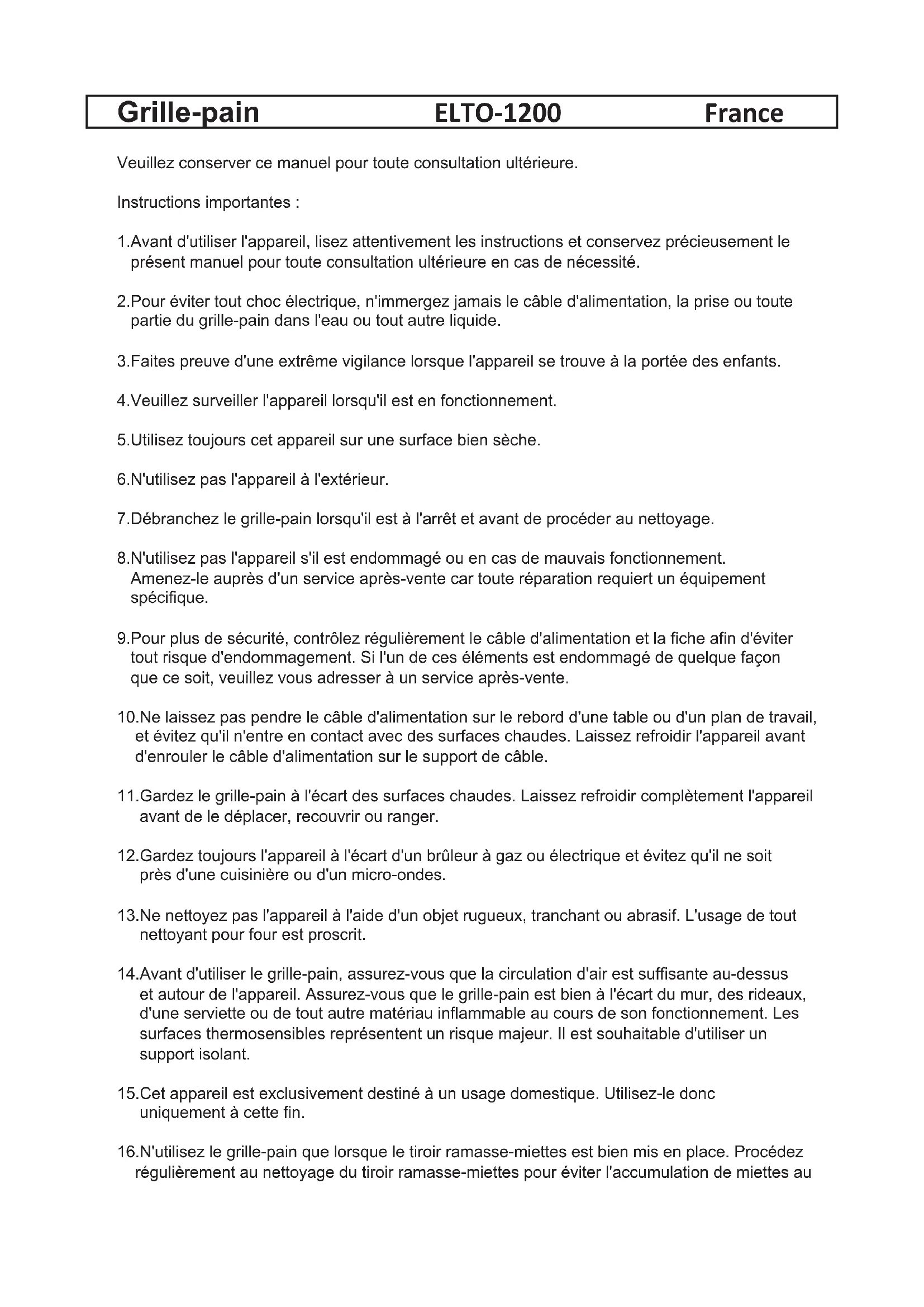 GEBRUIKSAANWIJZINGEN 1.Steek de stekker in het stopcontact en schakel de broodrooster in. 2.Steek tot op twee broodsneden in de broodgleuven. 3.Gebruik de bruinregelingschakelaar om de gewenste bruingraad in te stellen tussen 1 en 6 (1 = lichtst; 6 = donkerste bruingraad). Wij raden nr. 3 aan voor het eerste gebruik. 4.Druk het roosterhendel omlaag totdat het vast klikt. Het roosterproces zal automatisch starten. Vergeet a.u.b. niet dat het roosterhendel niet vast kan klikken als de stekker niet in het stopcontact is gestoken en de broodrooster niet is ingeschakeld. 5.De broodrooster schakelt zichzelf automatisch uit en werpt het geroosterde brood uit zodra de gewenste bruingraad is bereikt. U kunt altijd de “Annuleer” toets gebruiken om het roosterproces te annuleren. Plaats geen bolletjes e.d. direct op de roosterapertuur.ONDERHOUD EN REINIGING 1.Zorg ervoor dat het apparaat is uitgeschakeld en haal de stekker uit het stopcontact voordat u het reinigt. Laat de broodrooster eerst afkoelen. 2.U kunt de kruimellade reinigen door het uit de basis van het apparaat te trekken. Leeg het en steek het weer in het apparaat voordat u de broodrooster opnieuw gebruikt. 3.Reinig de buitenzijde van de broodrooster met een ietwat vochtig doekje en droog het vervolgens grondig met een zacht doekje. Dompel de broodrooster nooit in water om het schoon te maken! 4.U kunt de binnenzijde reinigen door het apparaat ondersteboven te houden en het boven de gootsteen uit te schudden totdat alle kruimels uit het apparaat zijn gevallen. Reinig de kruimellade regelmatig om ophoping van kruimels te voorkomen. Technische specificaties Voeding: 220-240V~50/60Hz Vermogen: 1100-1300W U kunt helpen om het milieu te beschermen! Denk a.u.b aan de lokale voorschriften: lever niet werkende elektrische apparaten in bij een geschikt afvalverwerkingcentrum. Environment friendly disposalGrille-pain ELTO-1200 France Veuillez conserver ce manuel pour toute consultation ultérieure. Instructions importantes : 1.Avant d'utiliser l'appareil, lisez attentivement les instructions et conservez précieusement le présent manuel pour toute consultation ultérieure en cas de nécessité. 2.Pour éviter tout choc électrique, n'immergez jamais le câble d'alimentation, la prise ou toute partie du grille-pain dans l'eau ou tout autre liquide. 3.Faites preuve d'une extrême vigilance lorsque l'appareil se trouve à la portée des enfants. 4.Veuillez surveiller l'appareil lorsqu'il est en fonctionnement. 5.Utilisez toujours cet appareil sur une surface bien sèche. 6.N'utilisez pas l'appareil à l'extérieur. 7.Débranchez le grille-pain lorsqu'il est à l'arrêt et avant de procéder au nettoyage. 8.N'utilisez pas l'appareil s'il est endommagé ou en cas de mauvais fonctionnement. Amenez-le auprès d'un service après-vente car toute réparation requiert un équipement spécifique. 9.Pour plus de sécurité, contrôlez régulièrement le câble d'alimentation et la fiche afin d'éviter tout risque d'endommagement. Si l'un de ces éléments est endommagé de quelque façon que ce soit, veuillez vous adresser à un service après-vente. 10.Ne laissez pas pendre le câble d'alimentation sur le rebord d'une table ou d'un plan de travail, et évitez qu'il n'entre en contact avec des surfaces chaudes. Laissez refroidir l'appareil avant d'enrouler le câble d'alimentation sur le support de câble. 11.Gardez le grille-pain à l'écart des surfaces chaudes. Laissez refroidir complètement l'appareil avant de le déplacer, recouvrir ou ranger. 12.Gardez toujours l'appareil à l'écart d'un brûleur à gaz ou électrique et évitez qu'il ne soit près d'une cuisinière ou d'un micro-ondes. 13.Ne nettoyez pas l'appareil à l'aide d'un objet rugueux, tranchant ou abrasif. L'usage de tout nettoyant pour four est proscrit. 14.Avant d'utiliser le grille-pain, assurez-vous que la circulation d'air est suffisante au-dessus et autour de l'appareil. Assurez-vous que le grille-pain est bien à l'écart du mur, des rideaux, d'une serviette ou de tout autre matériau inflammable au cours de son fonctionnement. Les surfaces thermosensibles représentent un risque majeur. Il est souhaitable d'utiliser un support isolant. 15.Cet appareil est exclusivement destiné à un usage domestique. Utilisez-le donc uniquement à cette fin. 16.N'utilisez le grille-pain que lorsque le tiroir ramasse-miettes est bien mis en place. Procédez régulièrement au nettoyage du tiroir ramasse-miettes pour éviter l'accumulation de miettes aufond du grille-pain. 17.N'introduisez jamais des aliments contenant du sucre, de la confiture ou des agents de conservation dans le grille-pain. 18.Cet appareil peut être utilisé par les enfants âgés de 8 ans et plus. Il peut être utilisé par des personnes (y compris des enfants) ayant des capacités mentales ou sensorielles réduites, un niveau de connaissances ou d’expérience limité, tant qu’elles ont reçu des instructions d'utilisation détaillées et les comprennent parfaitement. Il est interdit aux enfants d'utiliser l'appareil sans surveillance. Le nettoyage et l'entretien effectué par des enfants doit être fait sous surveillance. Garder l'appareil et son câble d'alimentation hors de la portée des enfants de moins de 8 ans. AVERTISSEMENT !! Si une tranche de pain ou tout autre objet venait malencontreusement à se coincer dans le grille-pain, n'utilisez jamais un couteau ou tout autre objet pour les sortir car le contact avec des éléments sous tension peut entraîner une électrocution. Laissez refroidir l'appareil et débranchez-le avant de retirer le pain. DESCRIPTIF TECHNIQUE